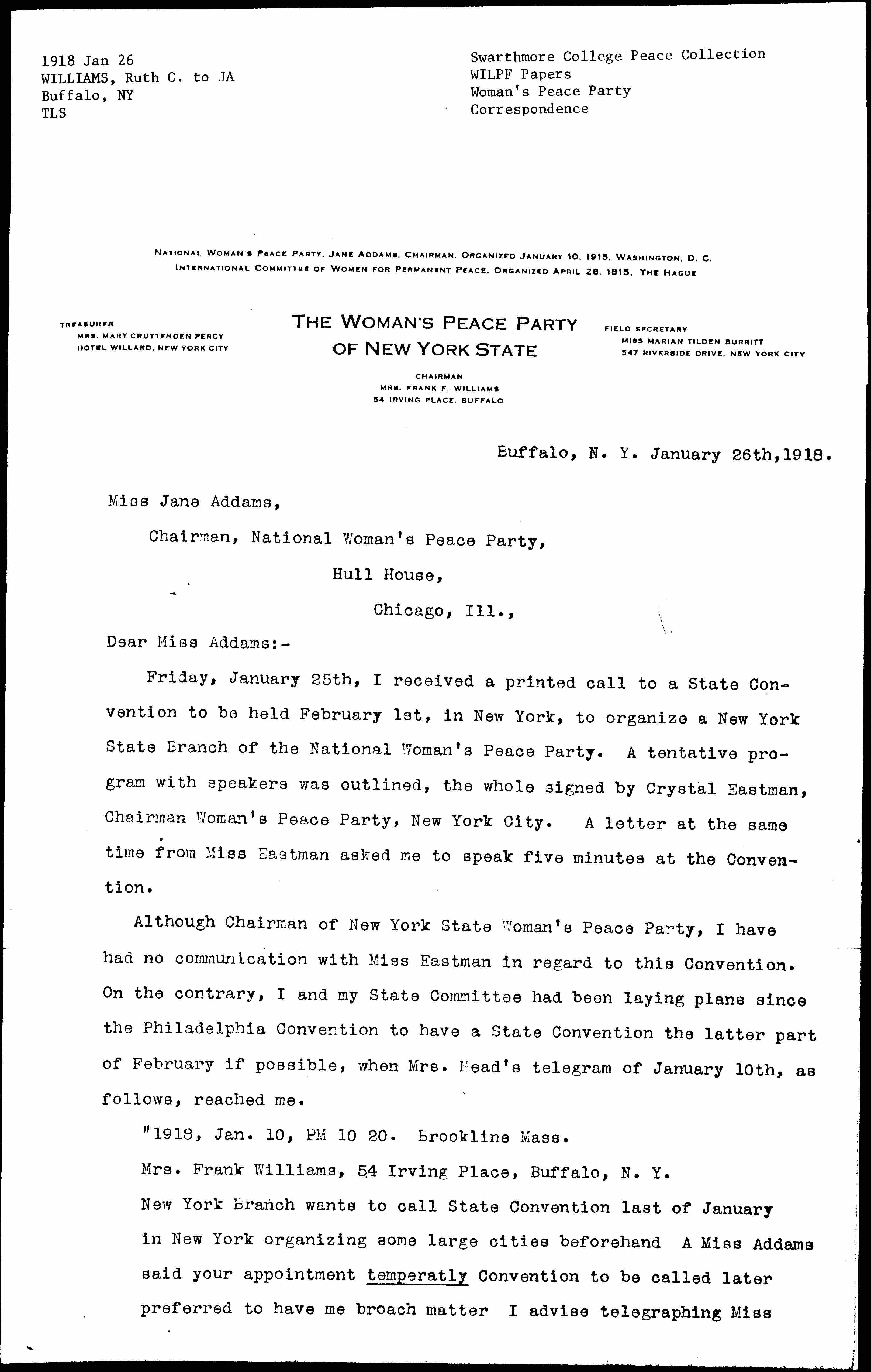 Although Chairman of New York State Woman's Peace Party, I have had no communication with Miss Eastman in regard to this Convention. On the contrary, I and my State Committee had been laying plans since the Philadelphia Convention to have a State Convention the latter part of February if possible, when Mrs. Mead's telegram of January 10th, as follows, reached me.