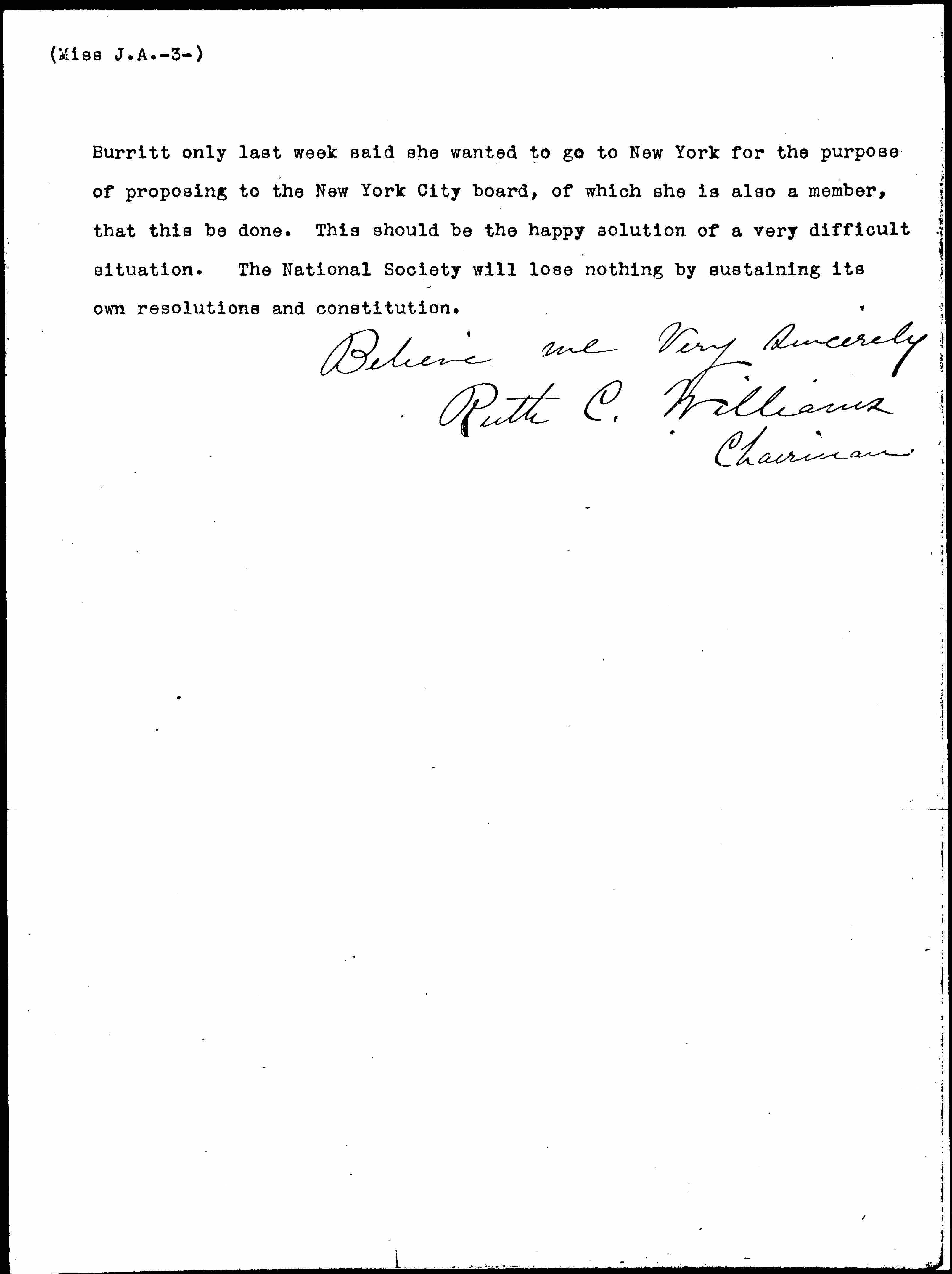 Dear Miss Addams I so firmly believe that good statesmanship consists largely in seizing adverse situations and turning them into blessings, that I suggest this Convention now might easily be utilized for the purpose of a formal separation of the State and the City Woman's Peace Party. I feel sure my Committee will be there if possible and represent the State. It has been considered and a letter from Miss [page 3] Burritt only last week said she wanted to go to New York for the purpose of proposing to the New York City board, of which she is also a member, that this be done. This should be the happy solution of a very difficult situation. The National Society will lose nothing by sustaining its own resolutions and constitution.