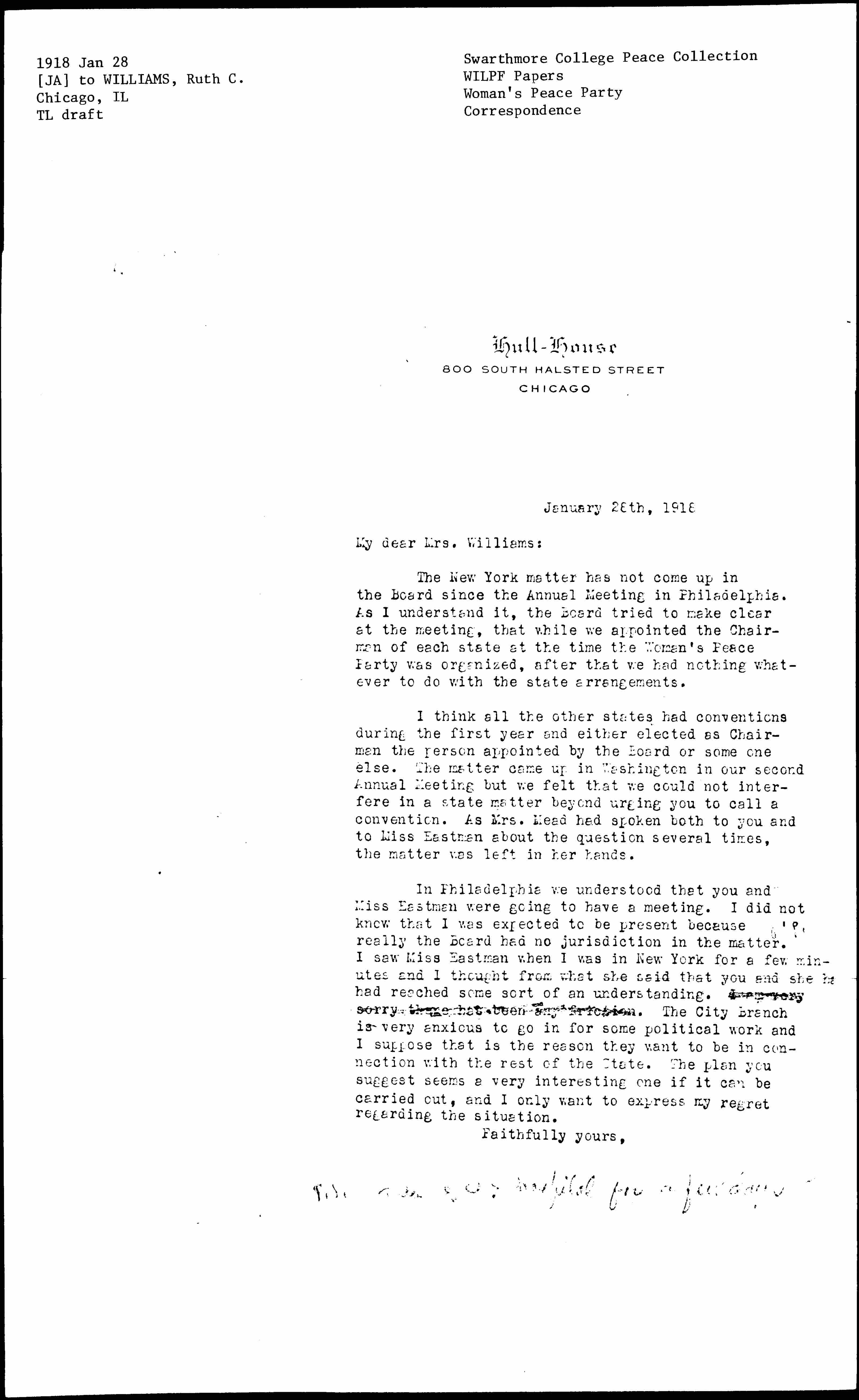 The New York matter has not come up in the Board since the Annual Meeting in Philadelphia. As I understand it, the Board tried to make clear at the meeting, that while we appointed the Chairman of each state at the time the Woman's Peace Party was organized, after that we had nothing whatever to do with the state arrangements.