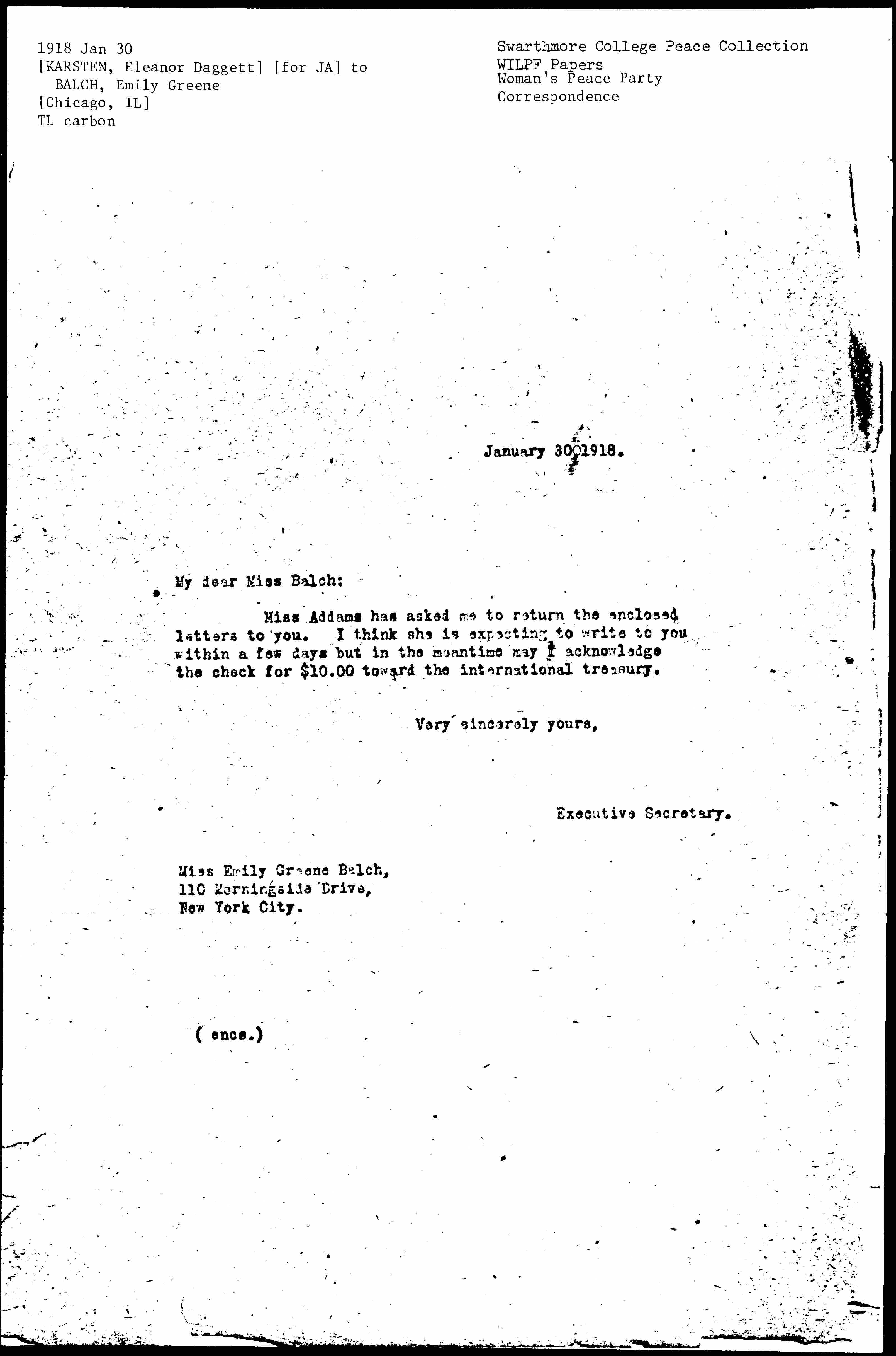 Miss Addams has asked me to return the enclosed letters to you. I think she is expecting to write to you within a few days but in the meantime may I acknowledge the check for $10.00 toward the international treasury.
