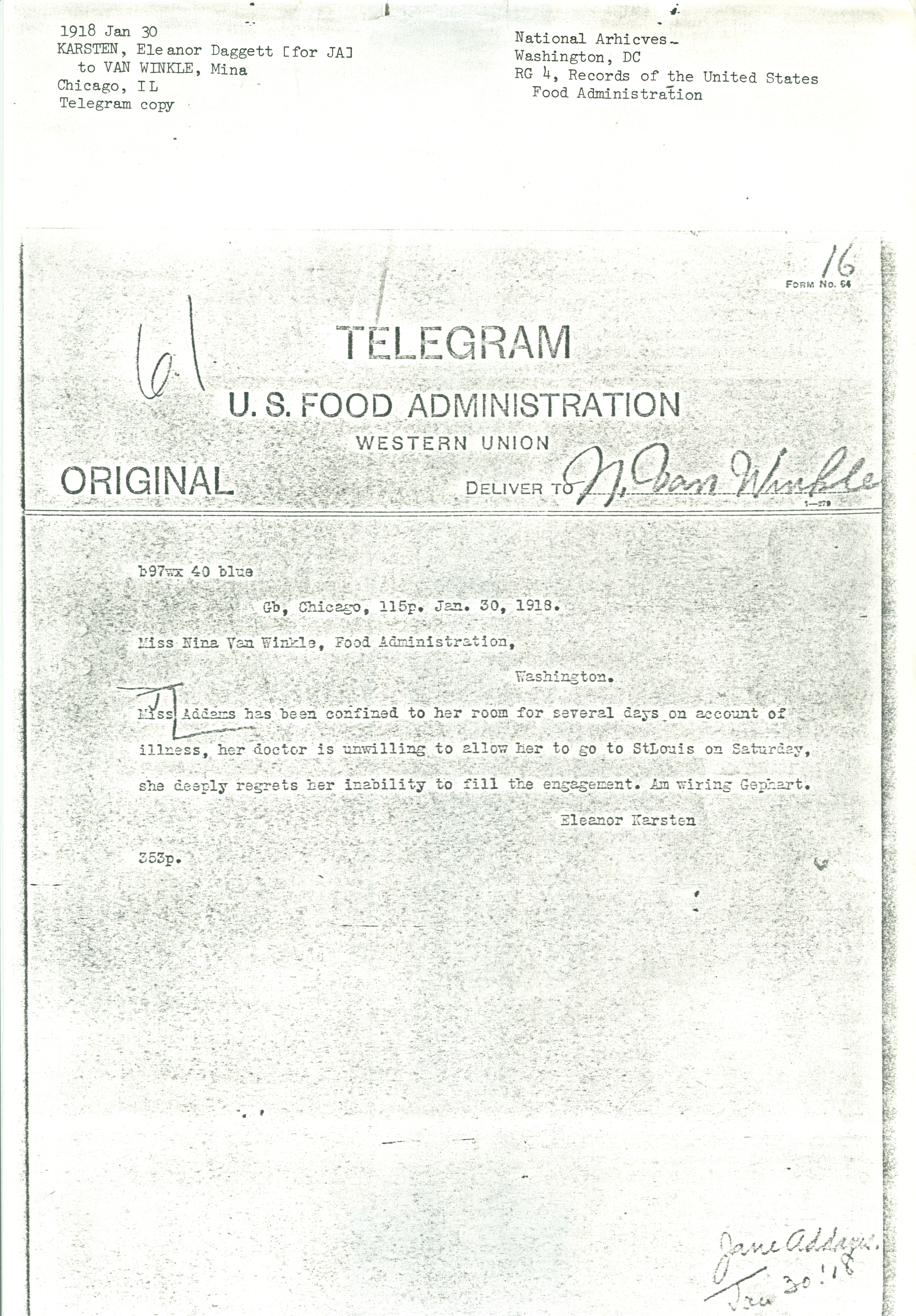 Miss Addams has been confined to her room for several days on account of illness, her doctor is unwilling to allow her to go to St Louis on Saturday, she deeply regrets her inability to fill the engagement. Am wiring Gephart.