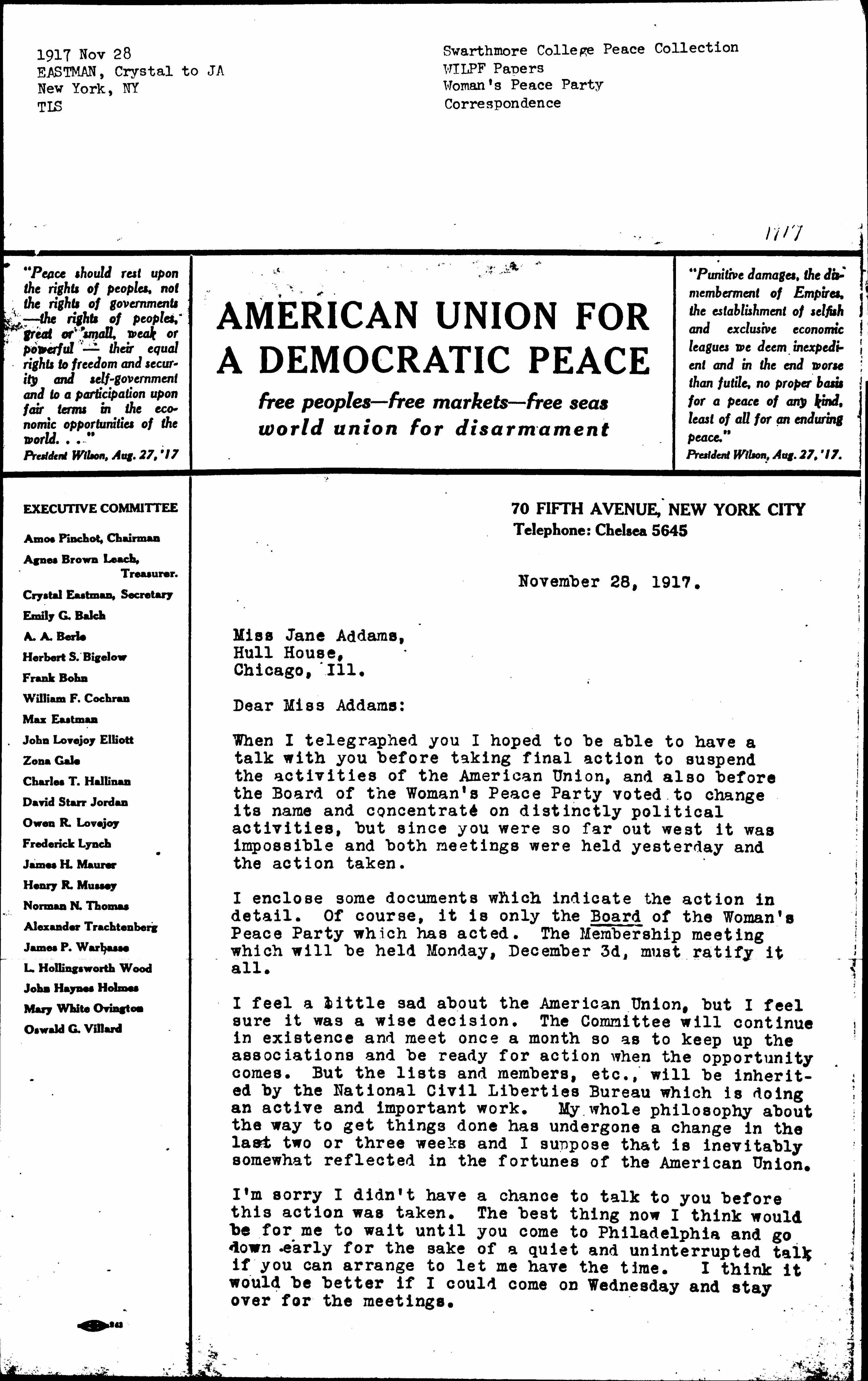 I enclose some documents which indicate the action in detail. Of course, it is only the Board of the Woman's Peace Party which has acted. The Membership meeting which will be held Monday, December 3d, must ratify it all.
