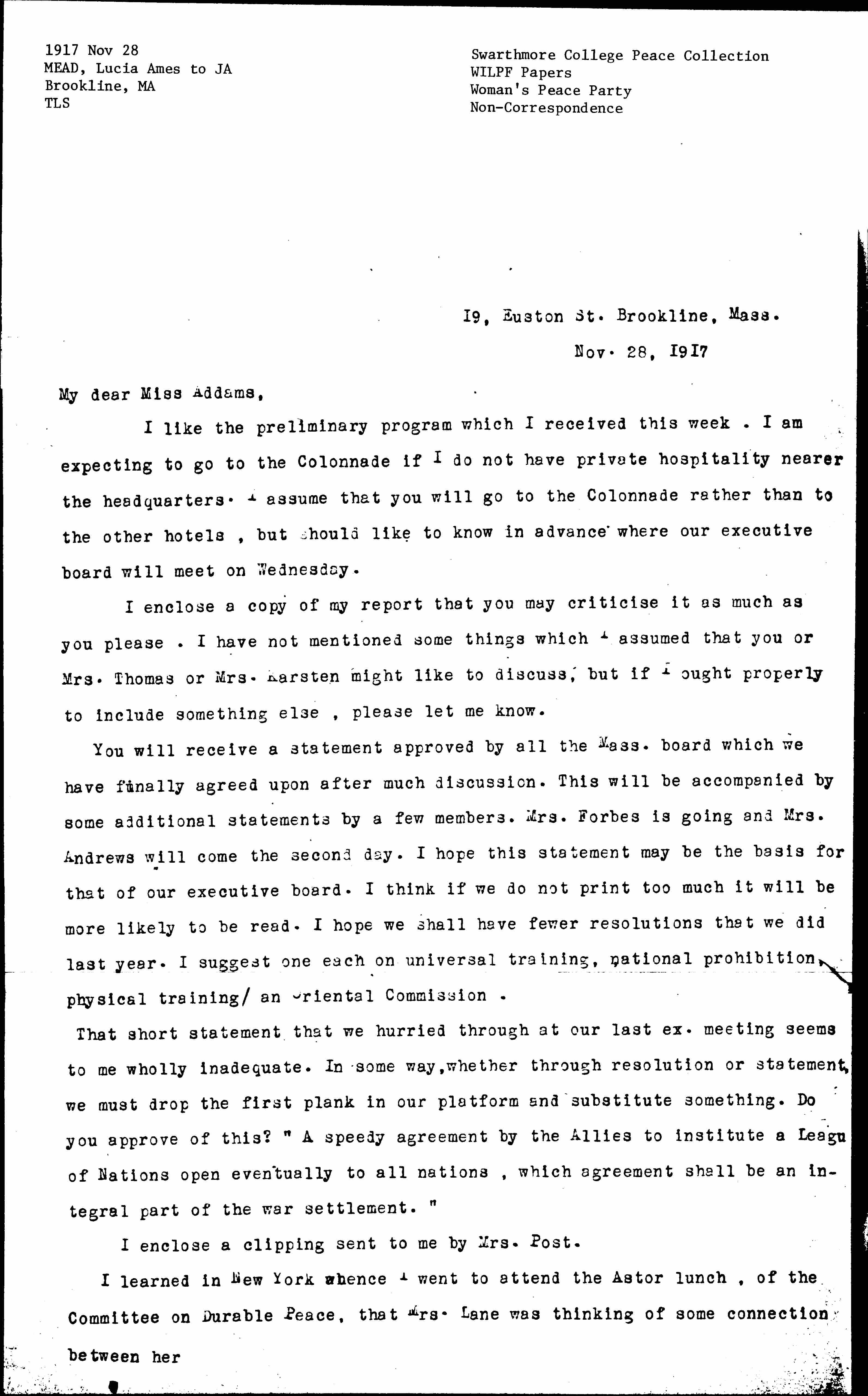 You will receive a statement approved by all the Mass. board which we have finally agreed upon after much discussion. This will be accompanied by some additional statements by a few members. Mrs. Forbes is going and Mrs. Andrews will come the second day. I hope this statement may be the basis for that of our executive board. I think if we do not print too much it will be more likely to be read. I hope we shall have fewer resolutions [than] we did last year. I suggest one each on universal training, national prohibition, physical training/an Oriental Commission.