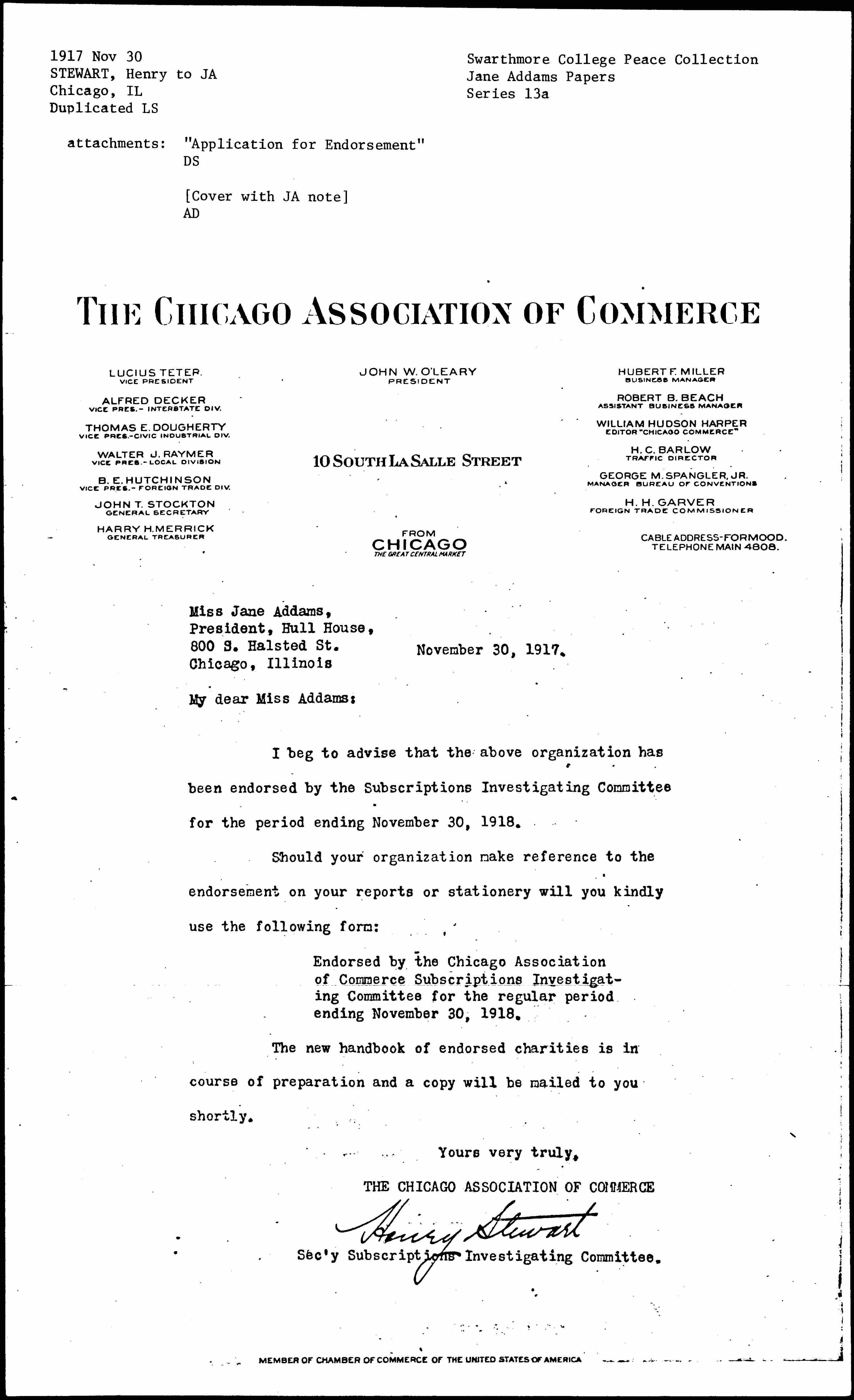 Endorsed by the Chicago Association of Commerce Subscriptions Investigating Committee for the regular period ending November 30, 1918.