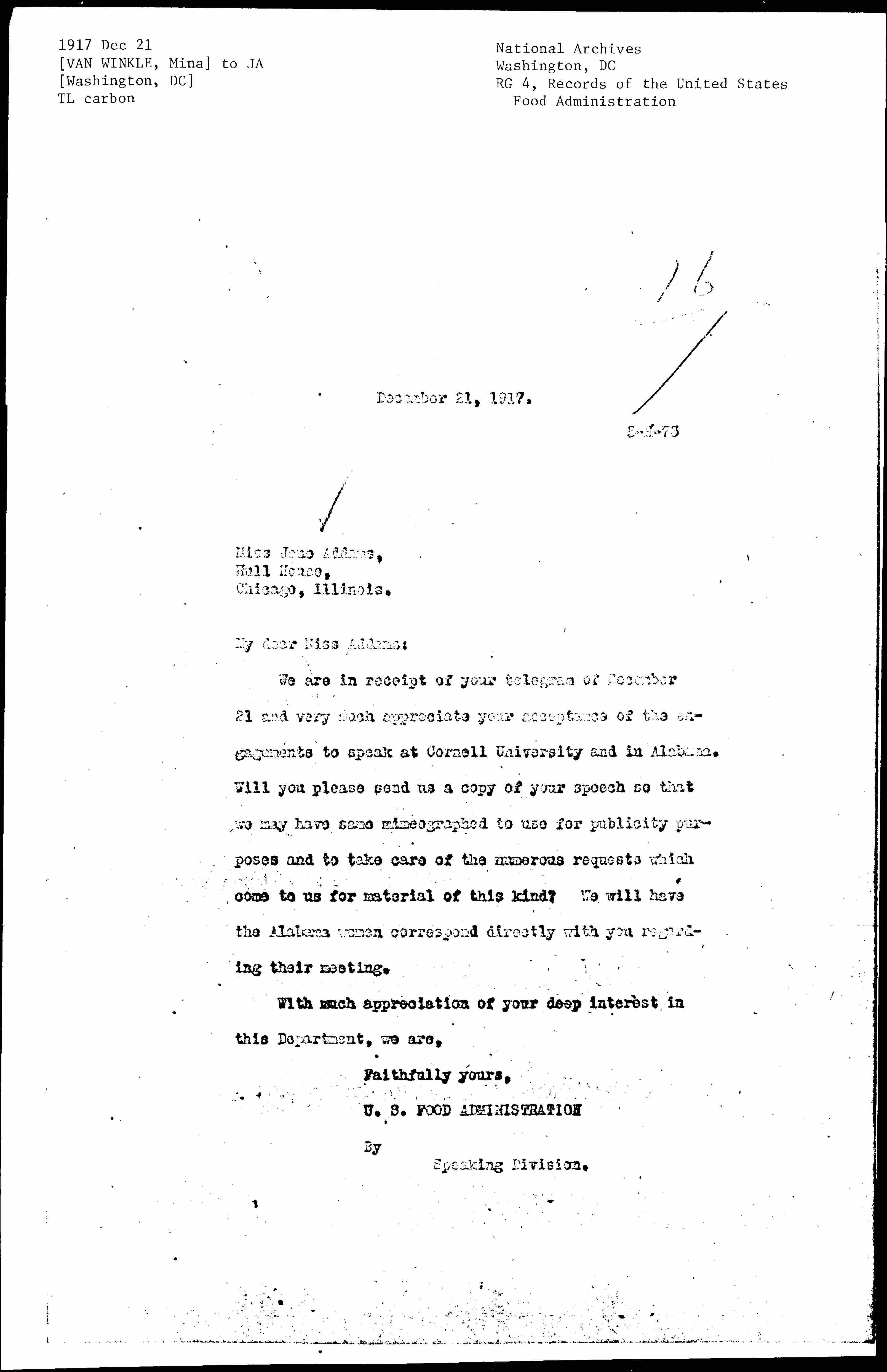 We are in receipt of your telegram of December 21 and very much appreciate your acceptance of the engagements to speak at Cornell University and in Alabama. Will you please send us a copy of your speech so that we may have same mimeographed to use for publicity purposes and to take care of the numerous requests which come to us for material of this kind? We will have the Alabama women correspond directly with you regarding their meeting.