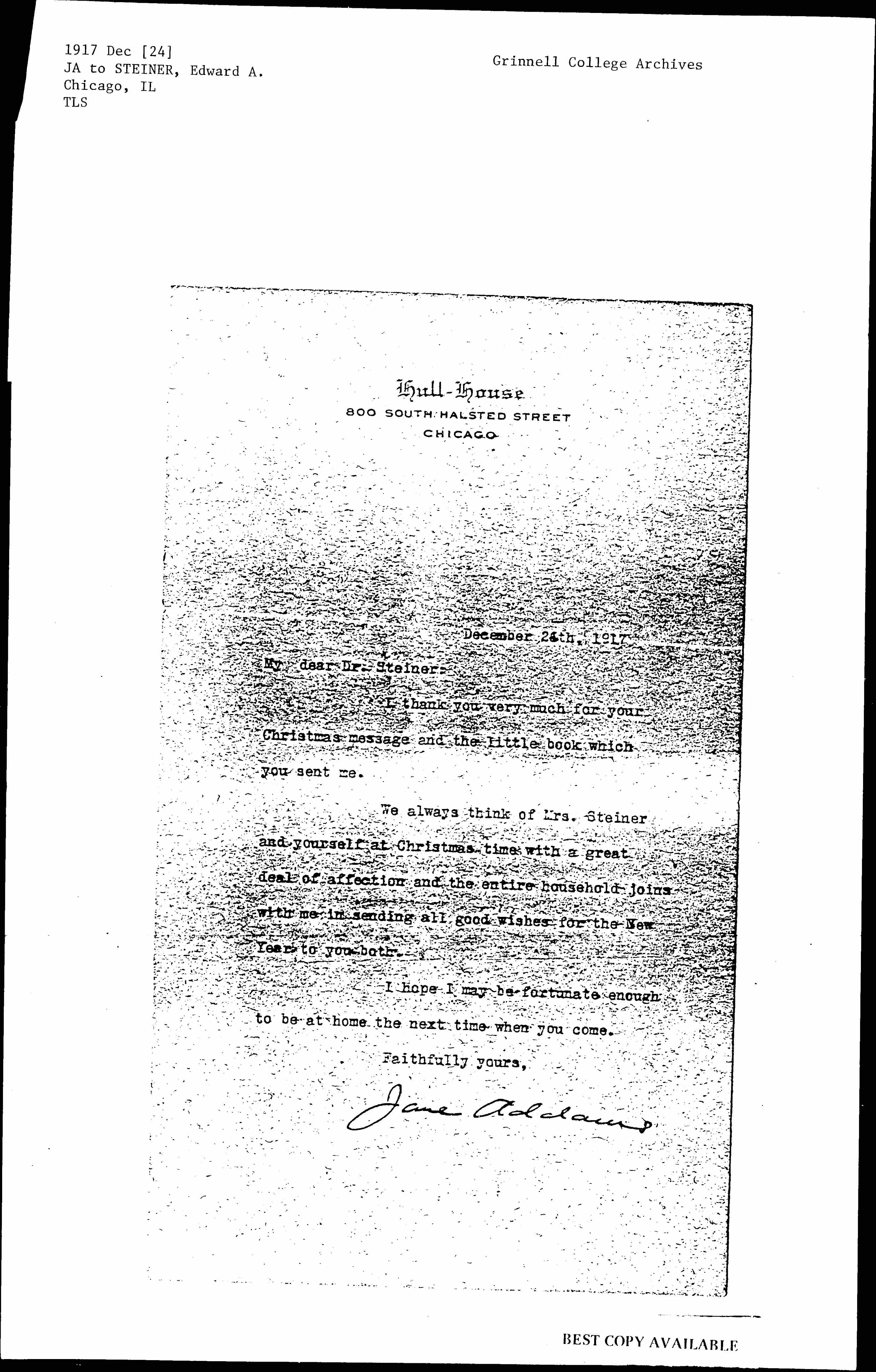 We always think of Mrs. Steiner and yourself at Christmas time with a great deal of affection and the entire household joins with me in sending all good wishes for the New Year to you both.