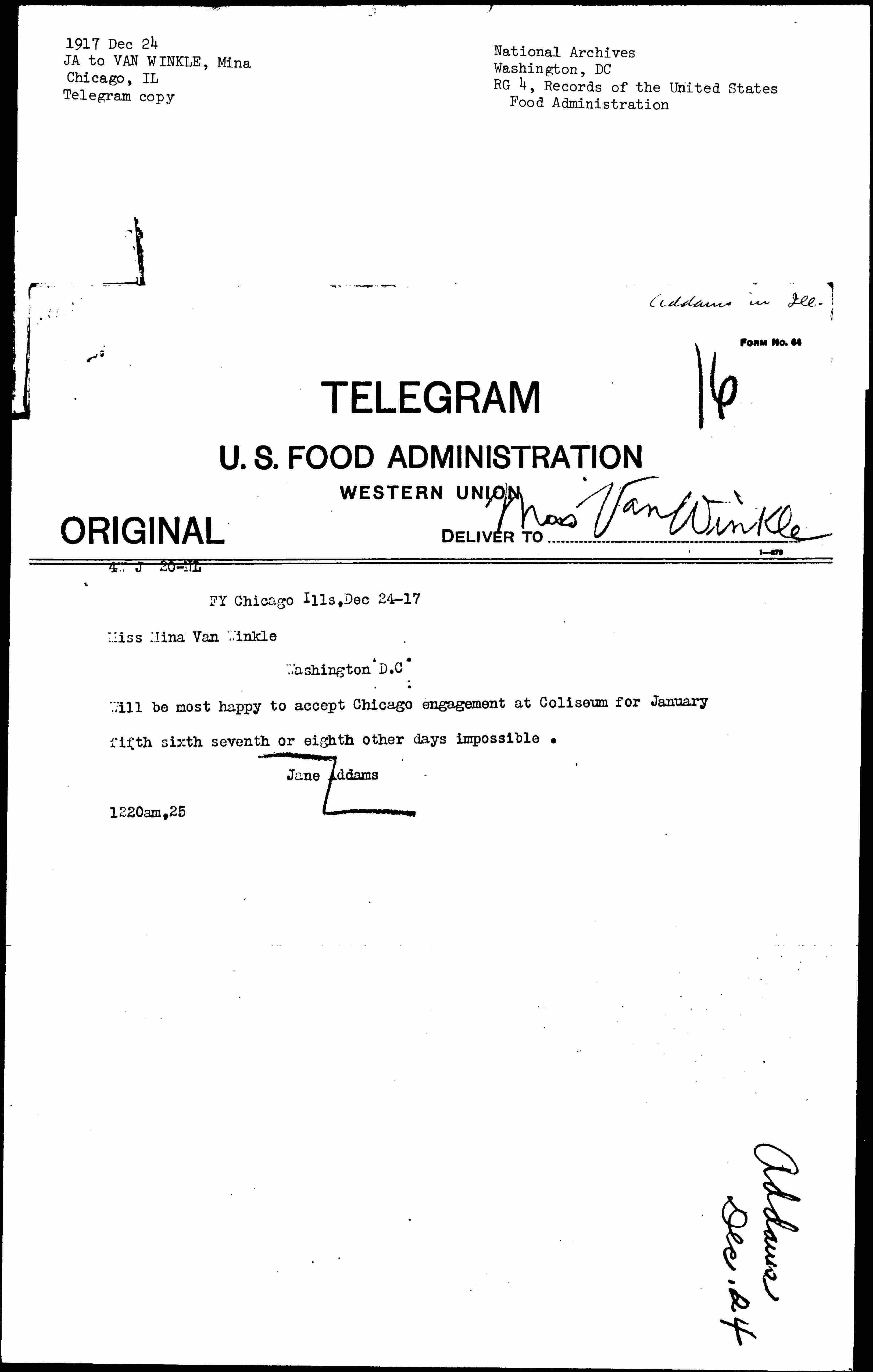 Will be most happy to accept Chicago engagement at Coliseum for January fifth sixth seventh or eighth other days impossible.