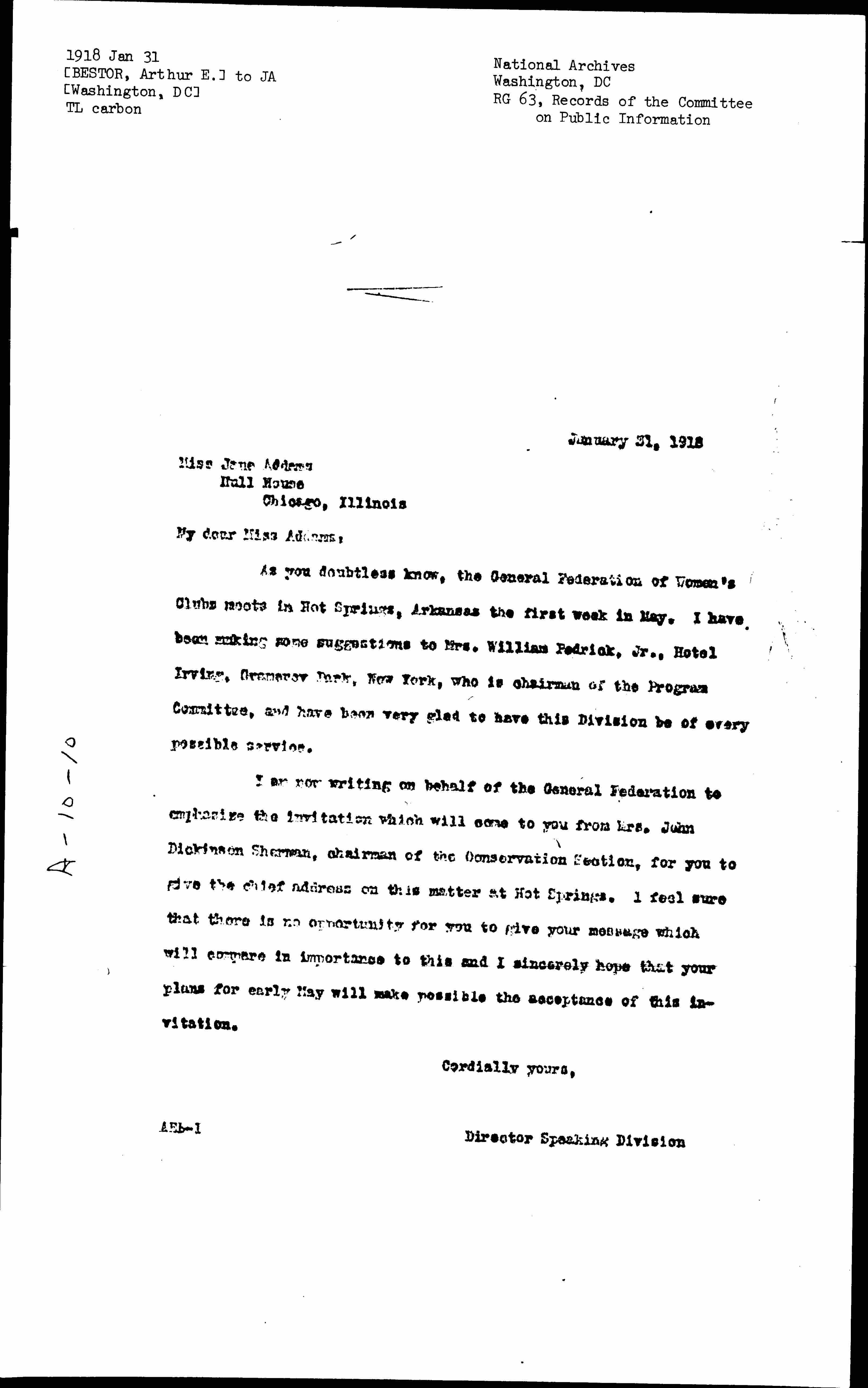 I am now writing on behalf of the General Federation to emphasize the invitation which will come to you from Mrs. John Dickinson Sherman, chairman of the Conservation Section, for you to give the chief address on this matter at Hot Springs. I feel sure that there is no opportunity for you to give your message which will compare in importance to this and I sincerely hope that your plans for early May will make possible the acceptance of this invitation.