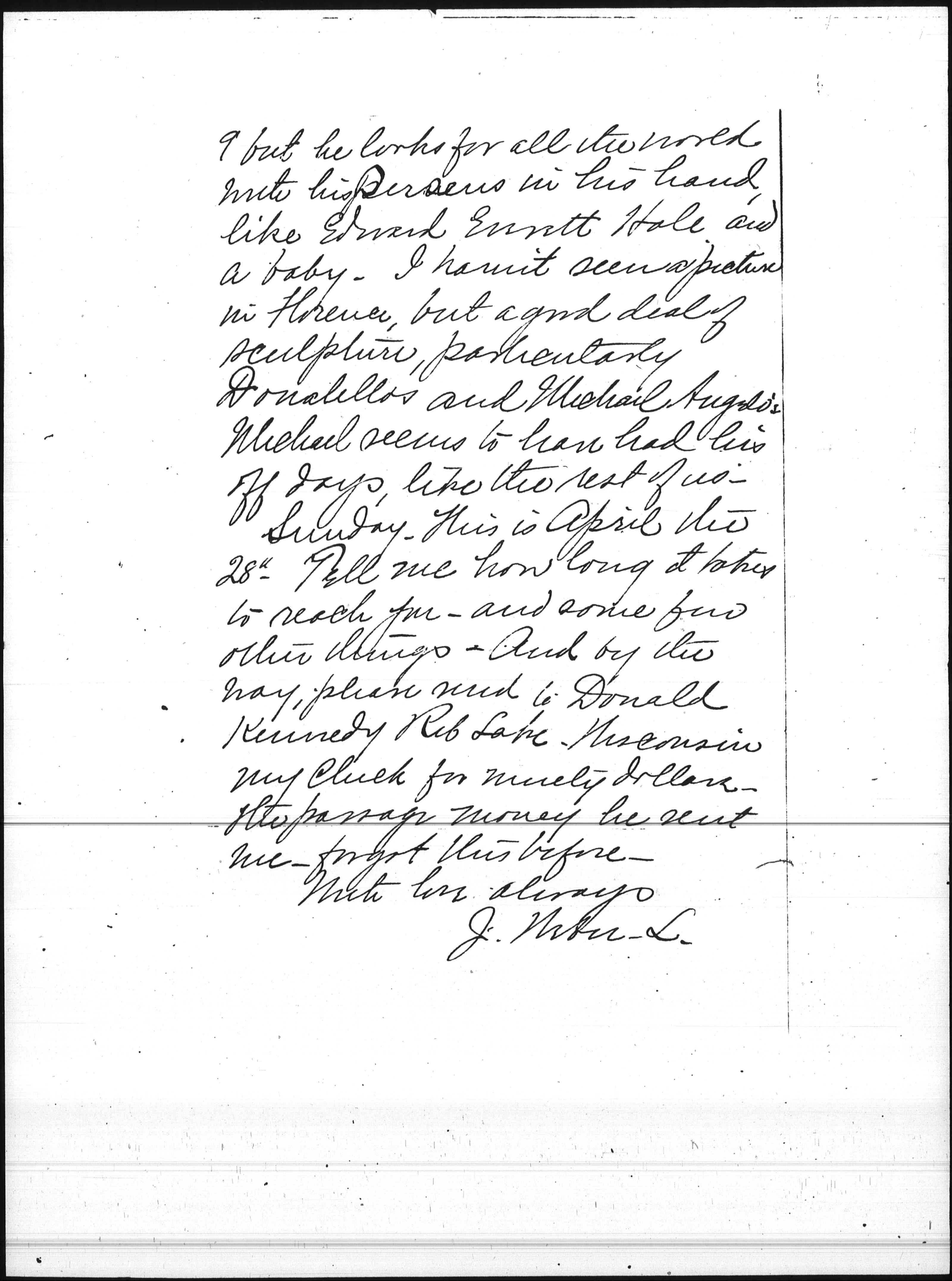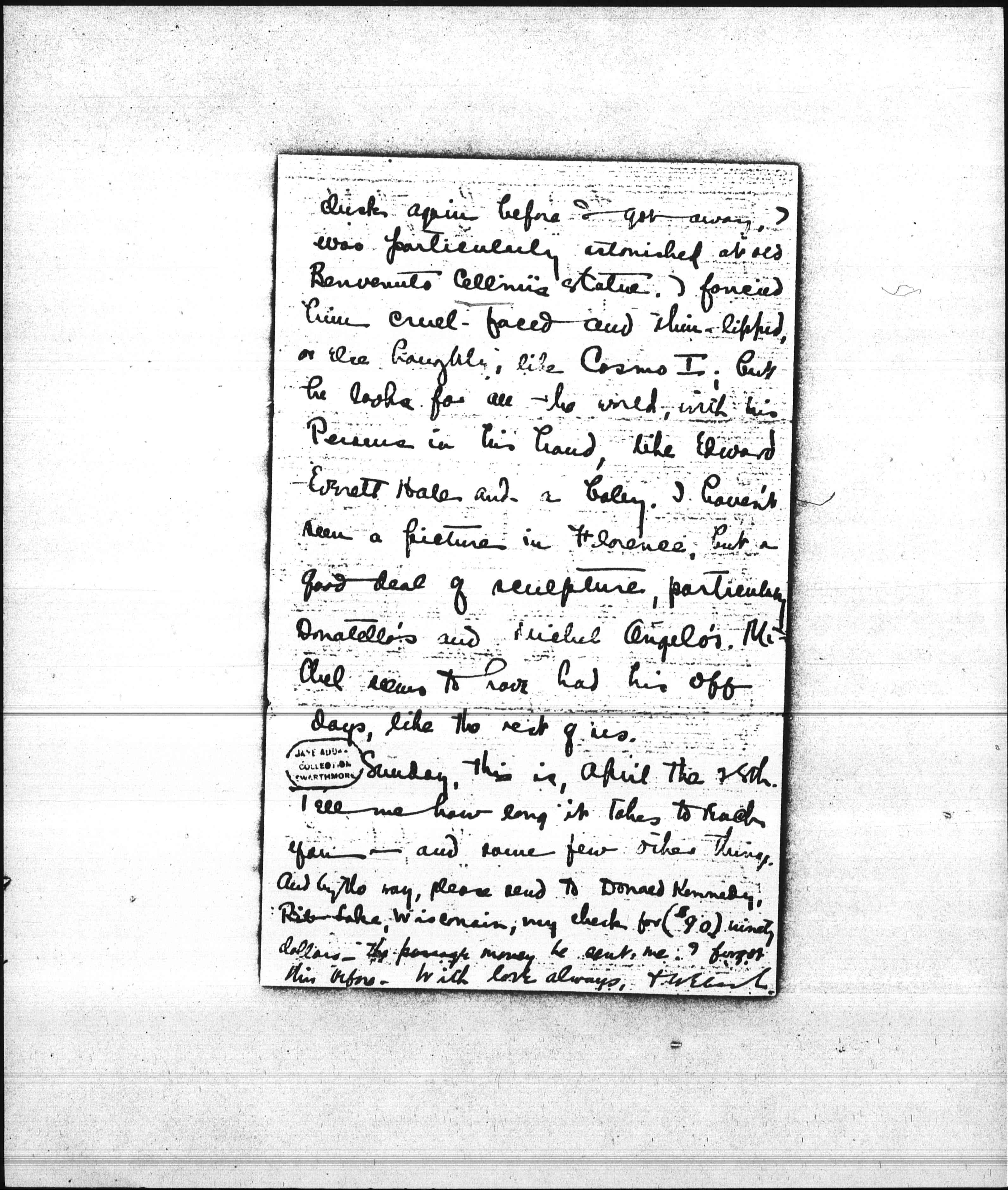 Sunday, this is, April the 25th. Tell me how long it takes to reach you—and some few other things. And by the way, please send to Donald Kennedy, Rib Lake, Wisconsin, my check for ($90) ninety dollars—the passage money he sent me. I forgot this before. With love always, & Weber L.