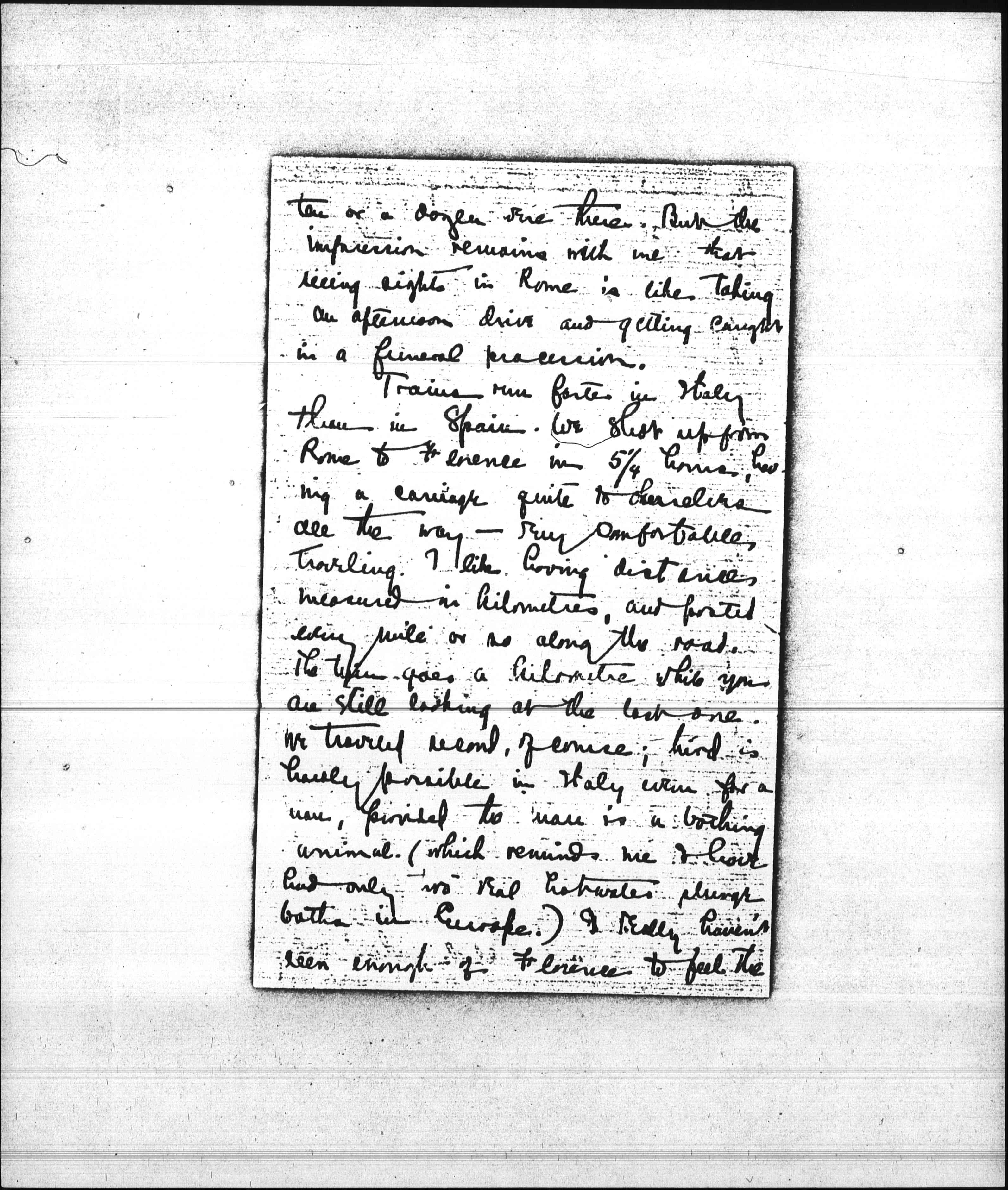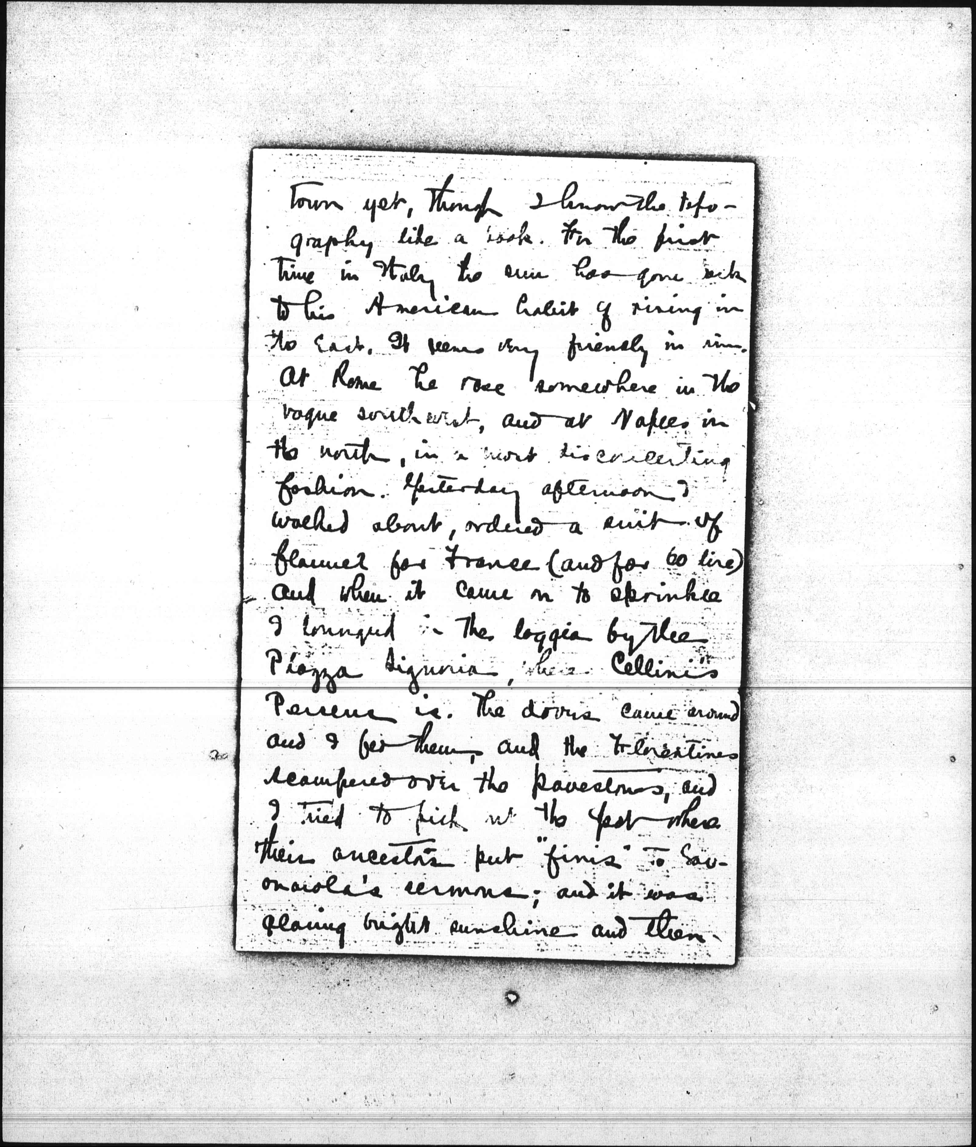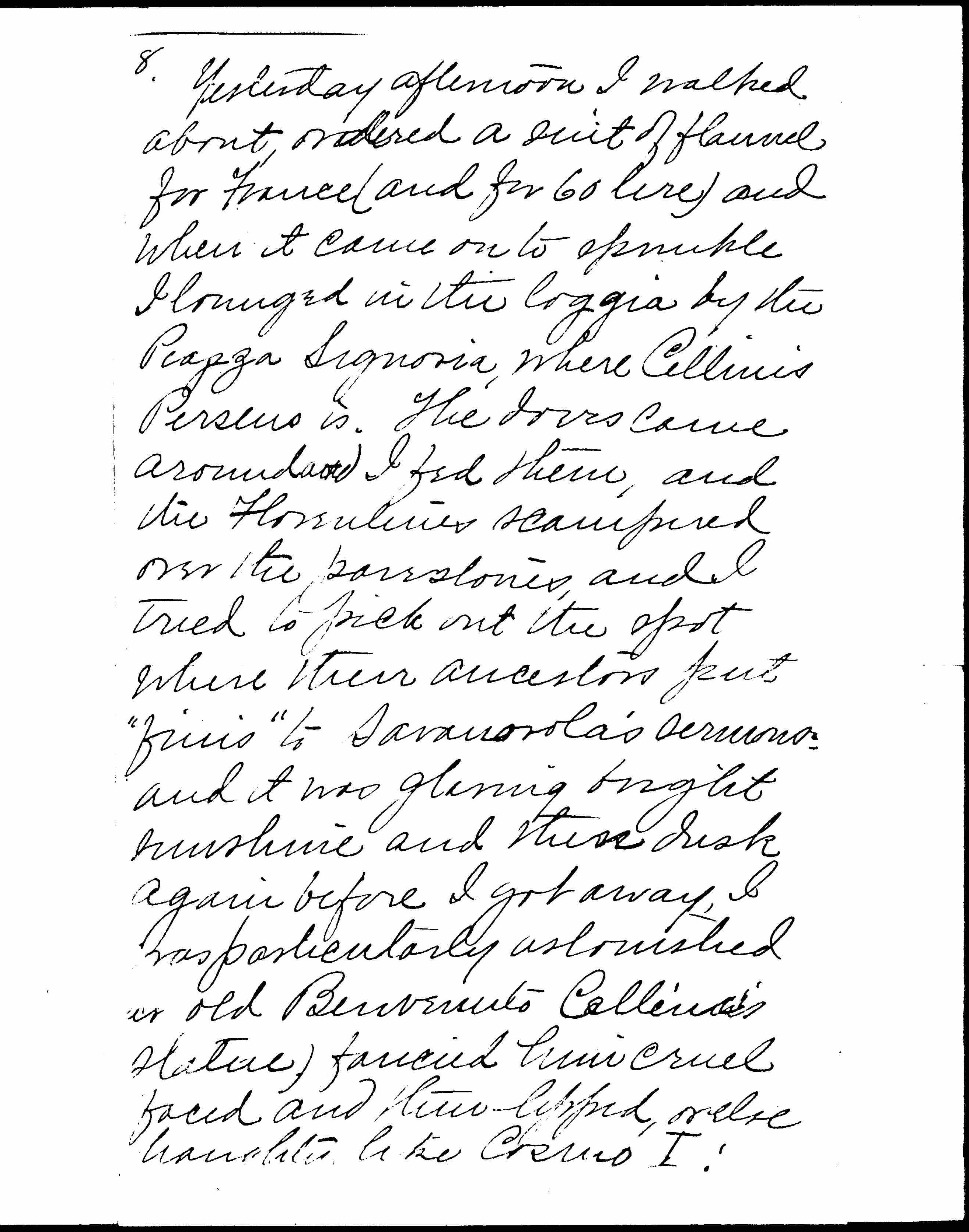 Trains run faster in Italy than in Spain. We shot up from Rome to Florence in 5 1/4 hours, having a carriage quite to ourselves all the way—very comfortable, traveling. I like having distance measured in kilometers, and posted every mile or so along the road. The train goes a kilometer while you are still looking at the last one. We traveled second, of course; third is hardly possible in Italy even for a man, provided the man is a bathing animal (which reminds me I have had only two real hot water plunge baths in Europe.) I really haven't seen enough of Florence to feel the [page 7] town yet, though I know the topography like a book. For the first time in Italy the sun has gone back to his American habit of rising in the east. It seems very friendly [in him]. At Rome he rose somewhere in the vague southwest, and at Naples in the north, in a most disconcerting fashion. Yesterday afternoon I walked about, ordered a suit of flannel for France (and for 60 lire) and when it came on to sprinkle I lounged in the loggia by the Piazza Signoria, where Cellini's Perseus is. The doves came around and I fed them, and the Florentines scampered over the pavestones, and I tried to pick out the spot where their ancestors put "finis" to Savanarola's sermons; and it was glaring bright sunshine and then [page 8] dusk again before I got away. I was particularly astonished about Bevenuto Cellini's statue. I fancied him cruel-faced and thin-lipped, or else haughty, like Cosmo I; but he looks for all the world, with his Perseus in his hand, like Edward Everett Hale and a baby. I haven't seen a picture in Florence, but a good deal of sculpture, particularly Donatello's and Michel Angelo's. Michel seems to have had his off days, like the rest of us.