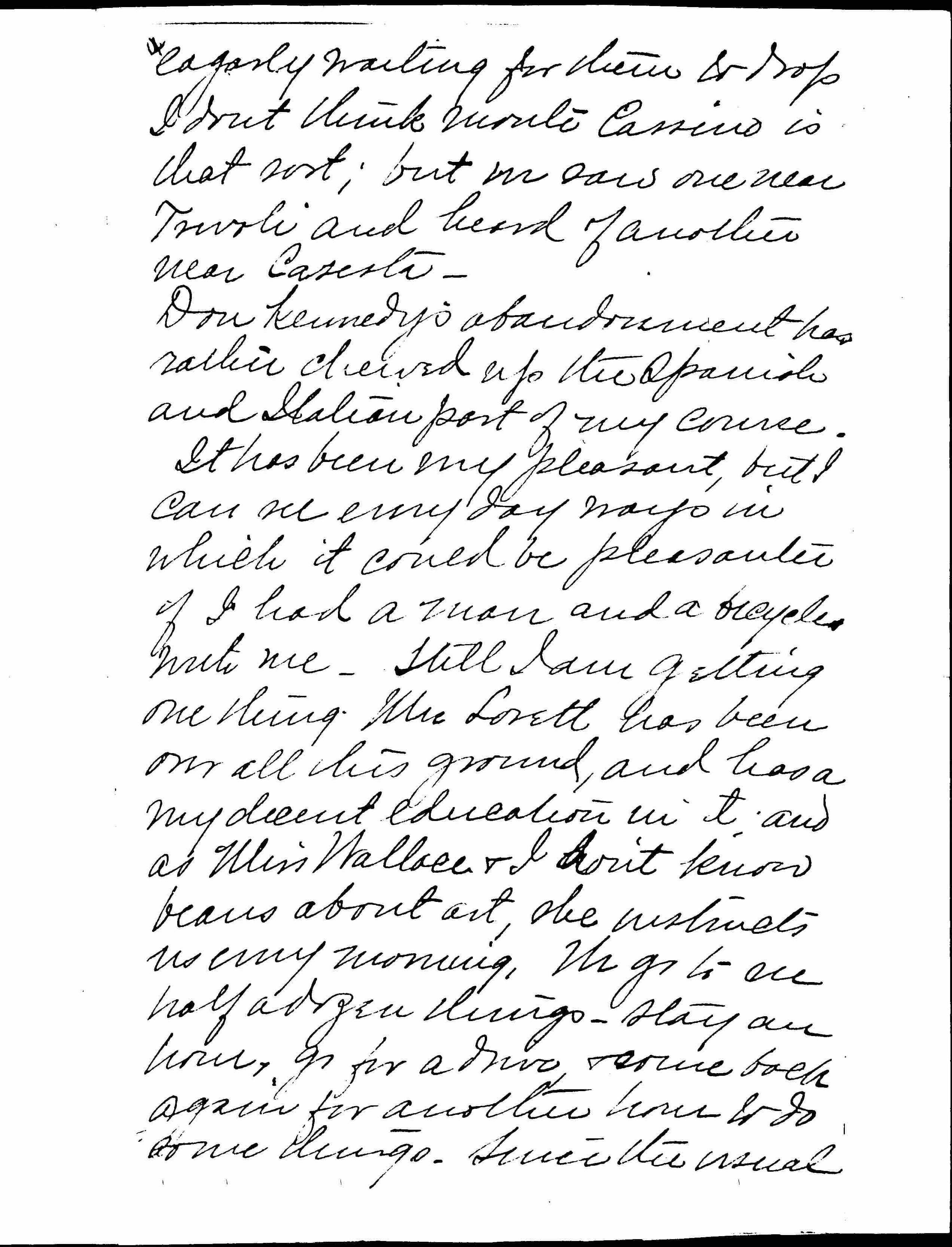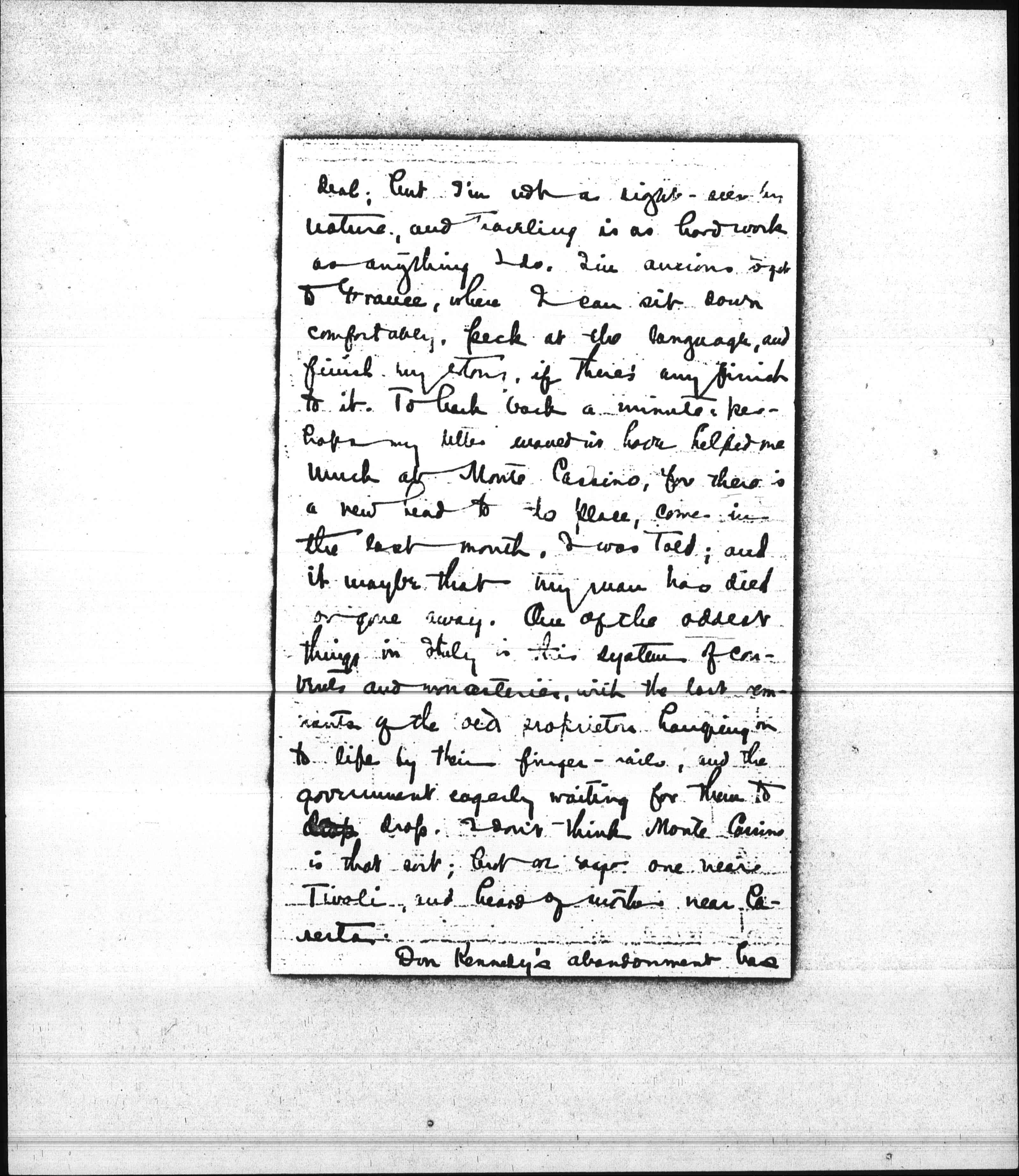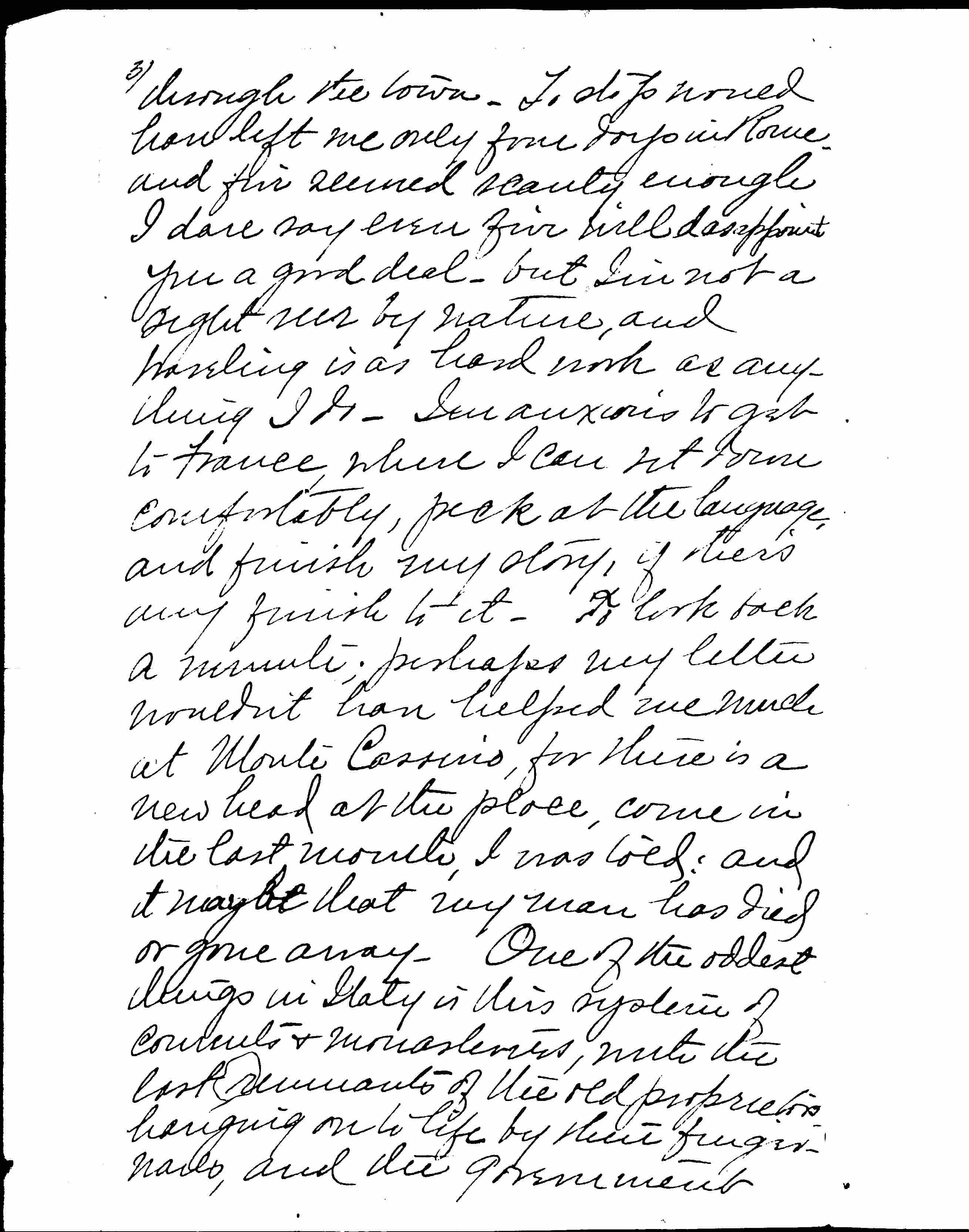After all I didn't go to the monastery at Monte Cassino, though I passed through the town. To stop would have left me only four days in Rome, and five seemed scarcely enough. I dare say ↑even↓ five will disappoint you a good [page 3] deal, but I'm not a sight-seer by nature, and traveling is as hard work as anything I do. I'm anxious to get to France, where I can sit down comfortably, peck at the language, and finish my story, if there's any finish to it. To lark back a minute, perhaps my letter wouldn't have helped me much at Monte Cassino, for there's a new head to the place, come in the last month, I was told; and it maybe that my man has died or gone away. One of the oddest things in Italy in this system of convents and monasteries, with the last remnants of the old proprietors handing on to life by their finger-nails, and the government eagerly waiting for them to drop. I don't think Monte Cassino is that sort; but we [saw] one near Tivoli, and heard of another near Caserta.