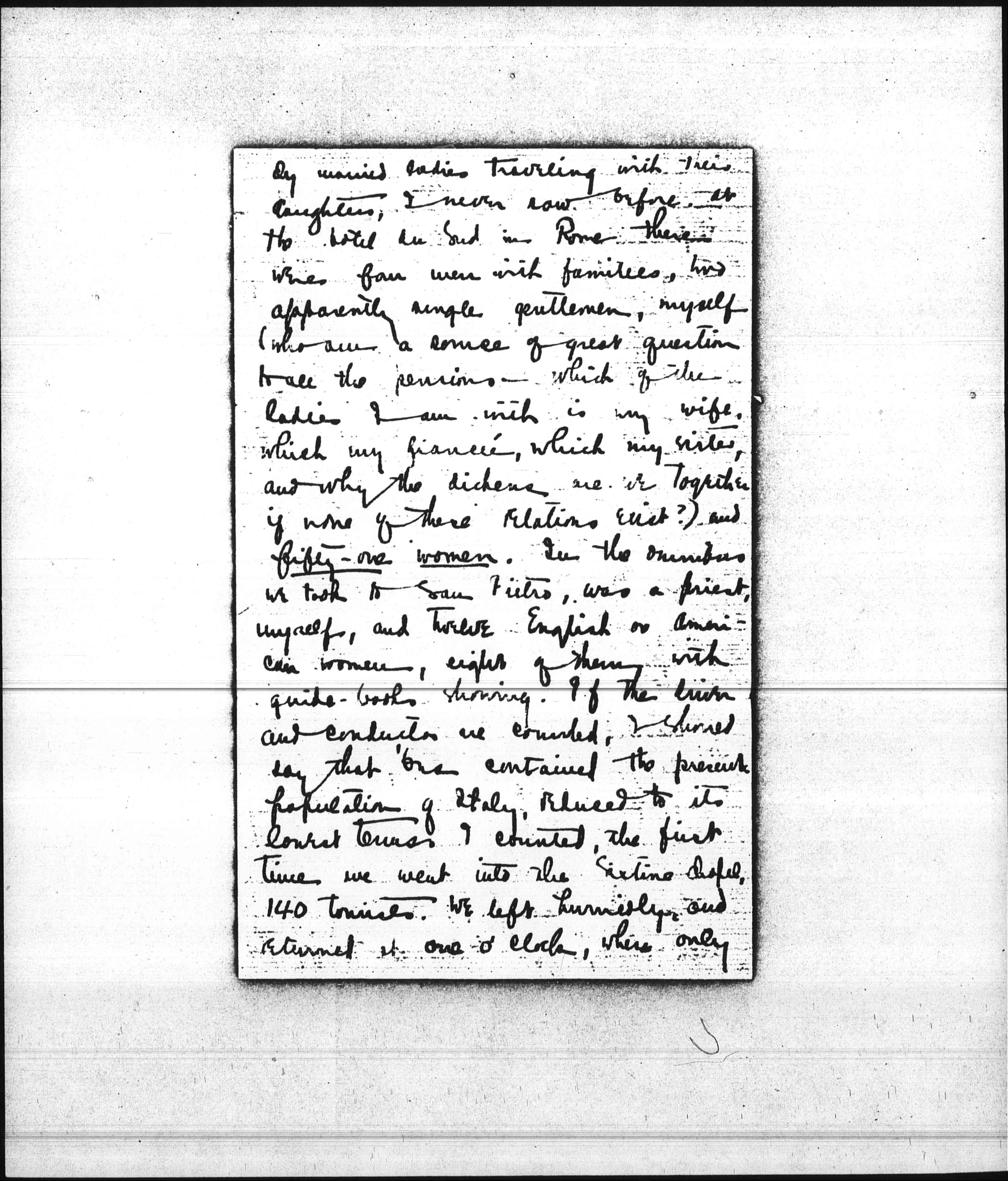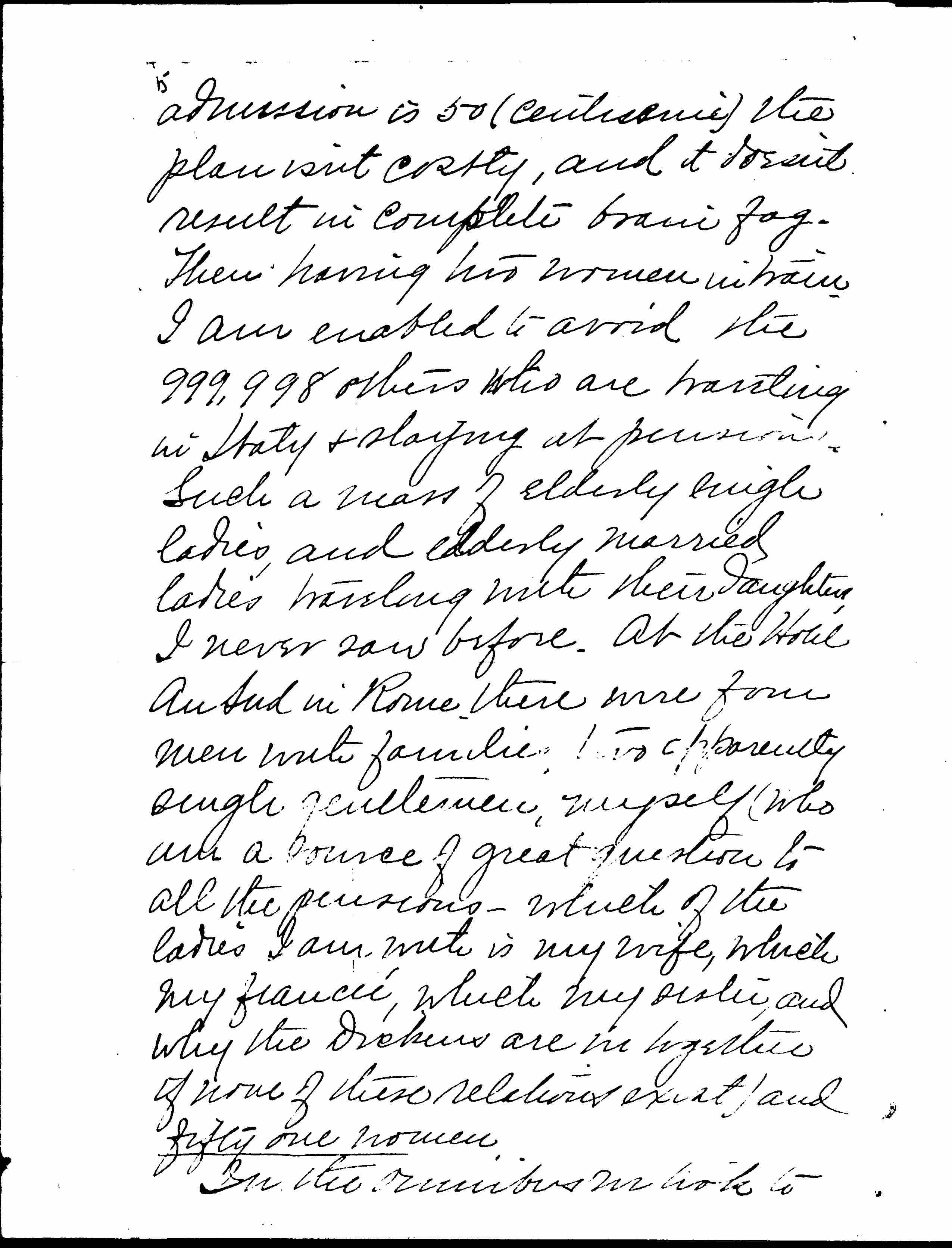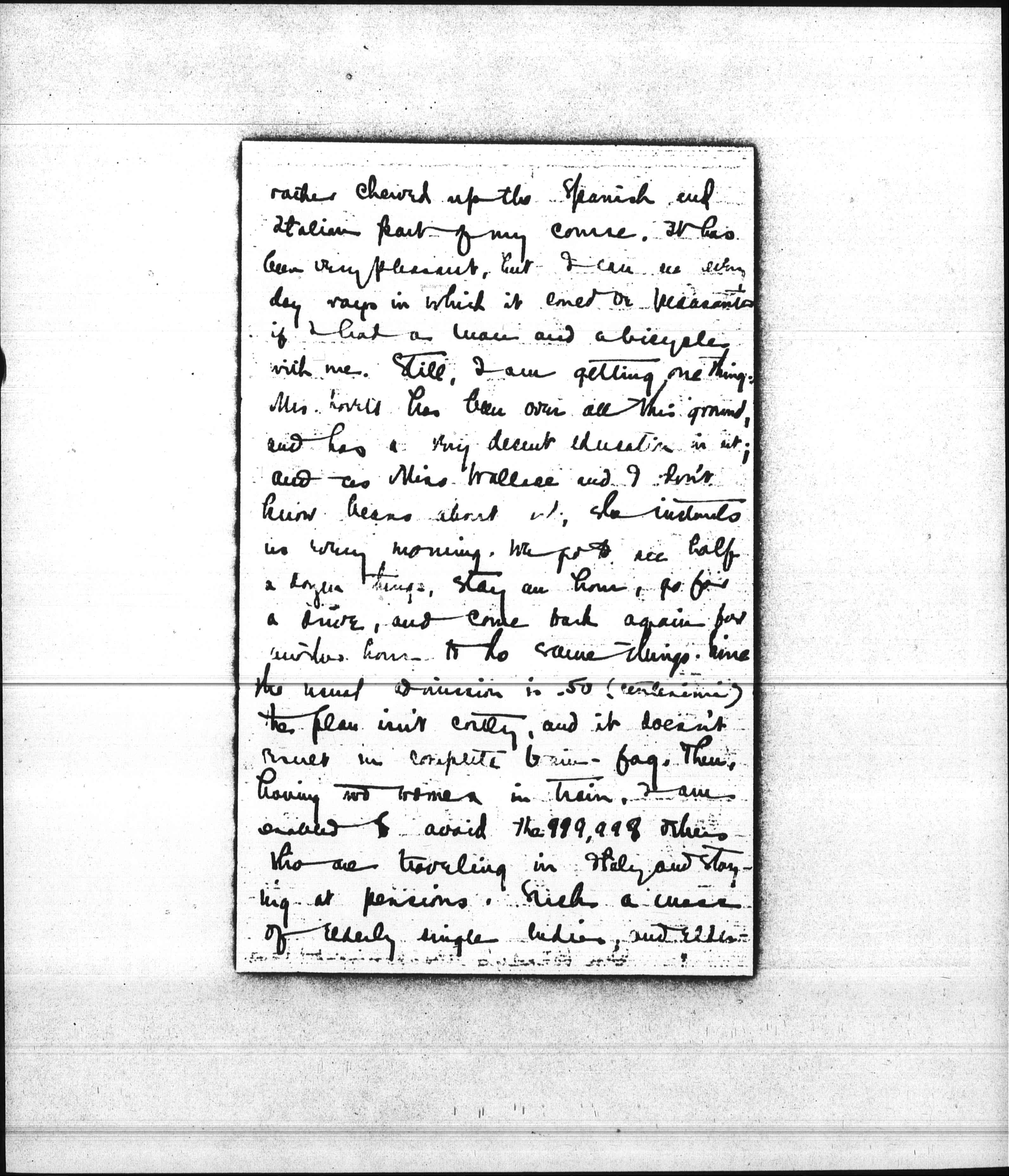 Don Kennedy's abandonment has [page 4] rather chewed up the Spanish and Italian part of my course. It has been very pleasant, but I can see every day ways in which it could be [pleasanter] if I had a man and a bicycle with me. Still, I am getting one thing. Mrs. Lovett has been over all this ground, and has a very decent education in it; and as Miss Wallace and I don't know beans about [it], she instructs us every morning. We go to see half a dozen things, stay an hour, go for a drive, and come back again for another hour to do same things. Since the usual admission is .50 (centesimi) the plan isn't costly, and it doesn't result in complete brain-fag. Then having no women in train, I am enabled to avoid the 999,999 others who are traveling in Italy and staying at pensions. Such a mass of elderly single ladies, and elderly [page 5] married ladies traveling with their daughters, I never saw before. At the Hotel Au Sud in Rome there were four men with families, two apparently single gentlemen, myself (who am a source of great question to all the pensions—which of the ladies I am with is my wife, which my financée, which my sister, and why the dickens are we together if none of those relations exist?) and fifty-one women. In the omnibus we took to San Pietro, was a priest, myself, and twelve English or American women, eight of them with guide-books showing. If the driver and conductor are counted, I should say that one contained the present population of Italy, reduced to its lowest terms I counted, the first time we went into the Sistine chapel, 140 tourists. We left hurriedly, and returned at one o'clock, where only [page 6] ten or a dozen were there. But the impression remains with me that seeing sights in Rome is like taking an afternoon drive and getting caught in a funeral procession.