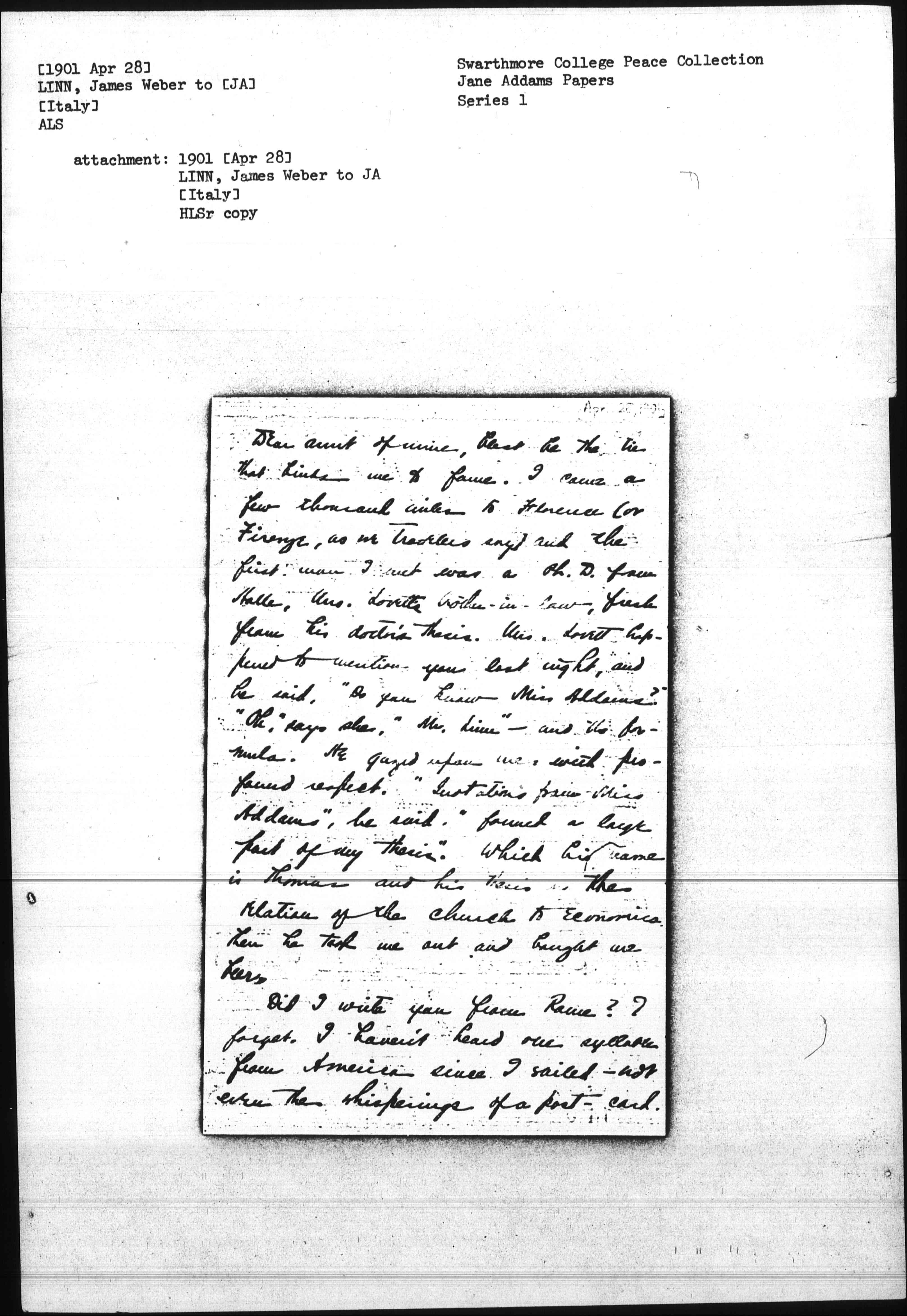 Dear aunt of mine, that be the tie that Links me to fame. I came a few thousand miles to Florence (or Firenze, as we travelers say and the first man I met was a Ph.D. from Halle, Mrs. Lovett's brother-in-law, fresh from his doctor's thesis. Mrs. Lovett happened to mention you last night, and he said, "Do you know Miss Addams?" "Oh," says she, "Mr. Linn"—and the formula. He gazed upon me with profound respect. "Quotations from Miss Addams," he said, "formed a large part of my thesis." Which his name is Thomas and his thesis is The Relation of the church to Economics. Then he took me out and bought me beers.