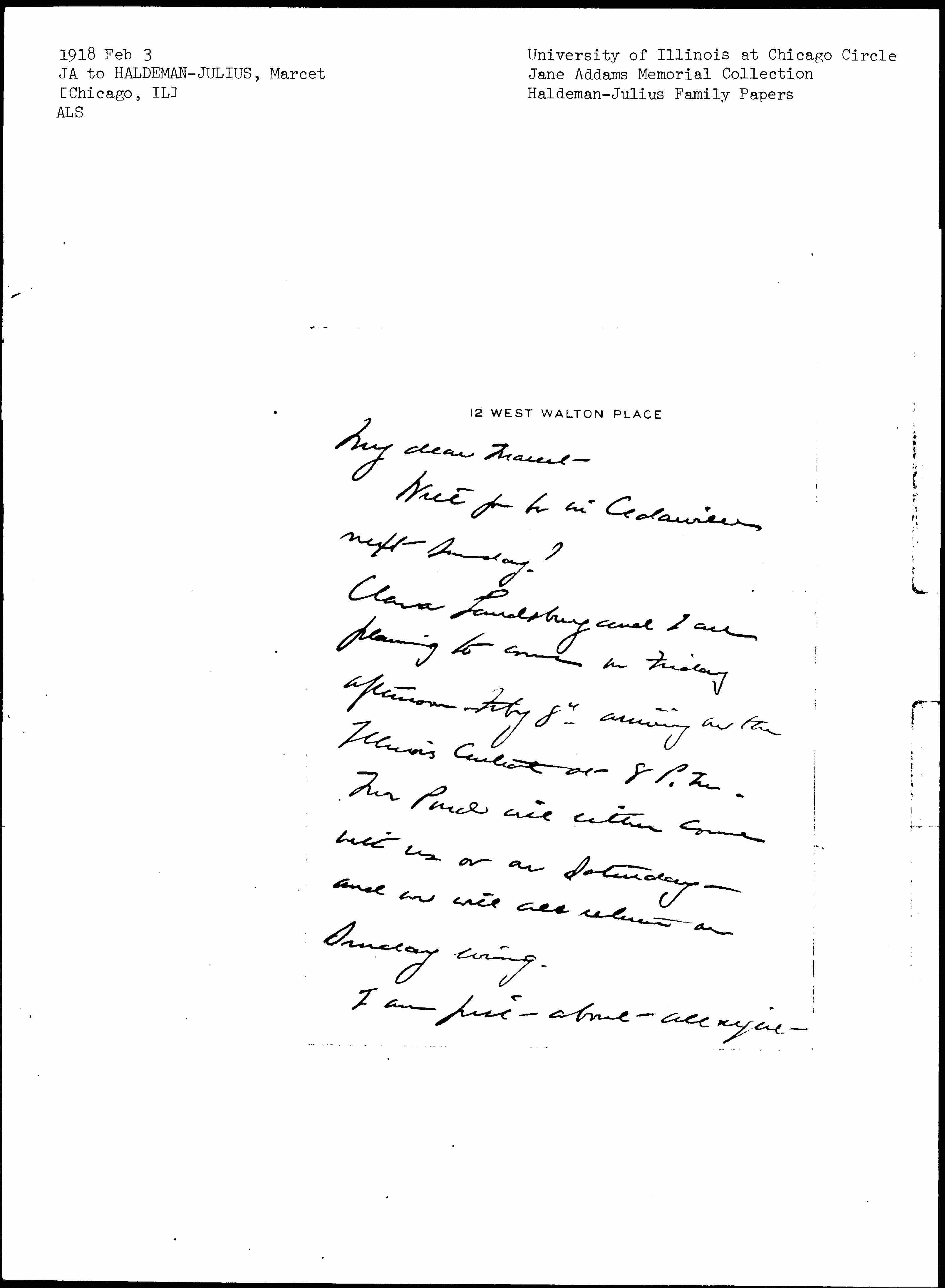 Clara Landsberg and I are planning to come on Friday afternoon -- Feby 8" -- arriving on the Illinois Central at 8 P.M. Mr Pond will either come with us or on Saturday -- and we will all return on Sunday evening.