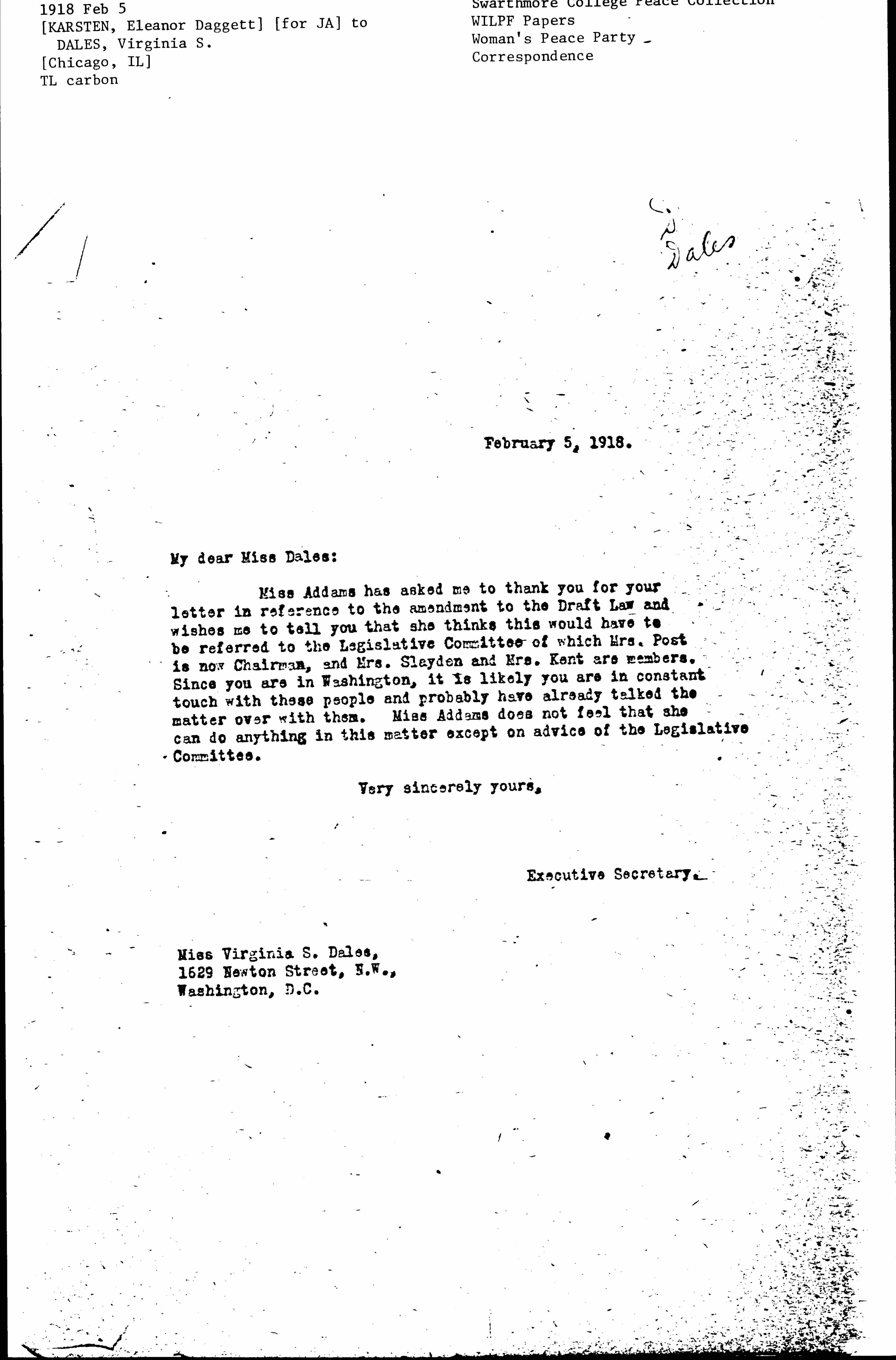 Miss Addams has asked me to thank you for your letter in reference to the amendment to the Draft Law and wishes me to tell you that she thinks this would have to be referred to the Legislative Committee of which Mrs. Post is now Chairman, and Mrs. Slayden and Mrs. Kent are members. Since you are in Washington, it is likely you are in constant touch with these people and probably have already talked the matter over with them. Miss Addams does not feel that she can do anything in this matter except on advice of the Legislative Committee.