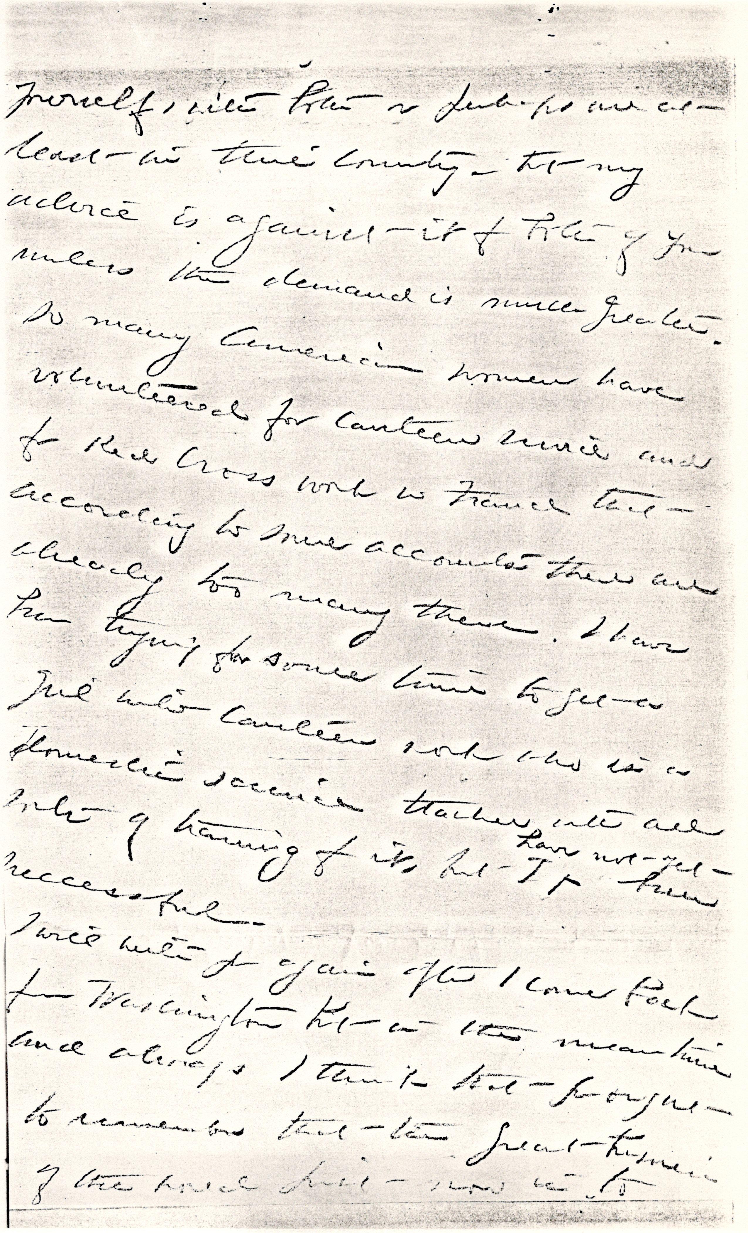 I am going to Washington next week & will keep my eyes open here and there for any such openings for either Myra or [page 5] yourself, with both or perhaps one at least in this country -- but my advice is against it for both of you unless the demand is much greater. So many American women have volunteered for canteen service and for Red Cross work in France that according to some accounts there are already too many there. I have been trying for some time to get a girl into canteen work who is a domestic science teacher with all sorts of training for it, but I ↑have not yet↓ been successful.