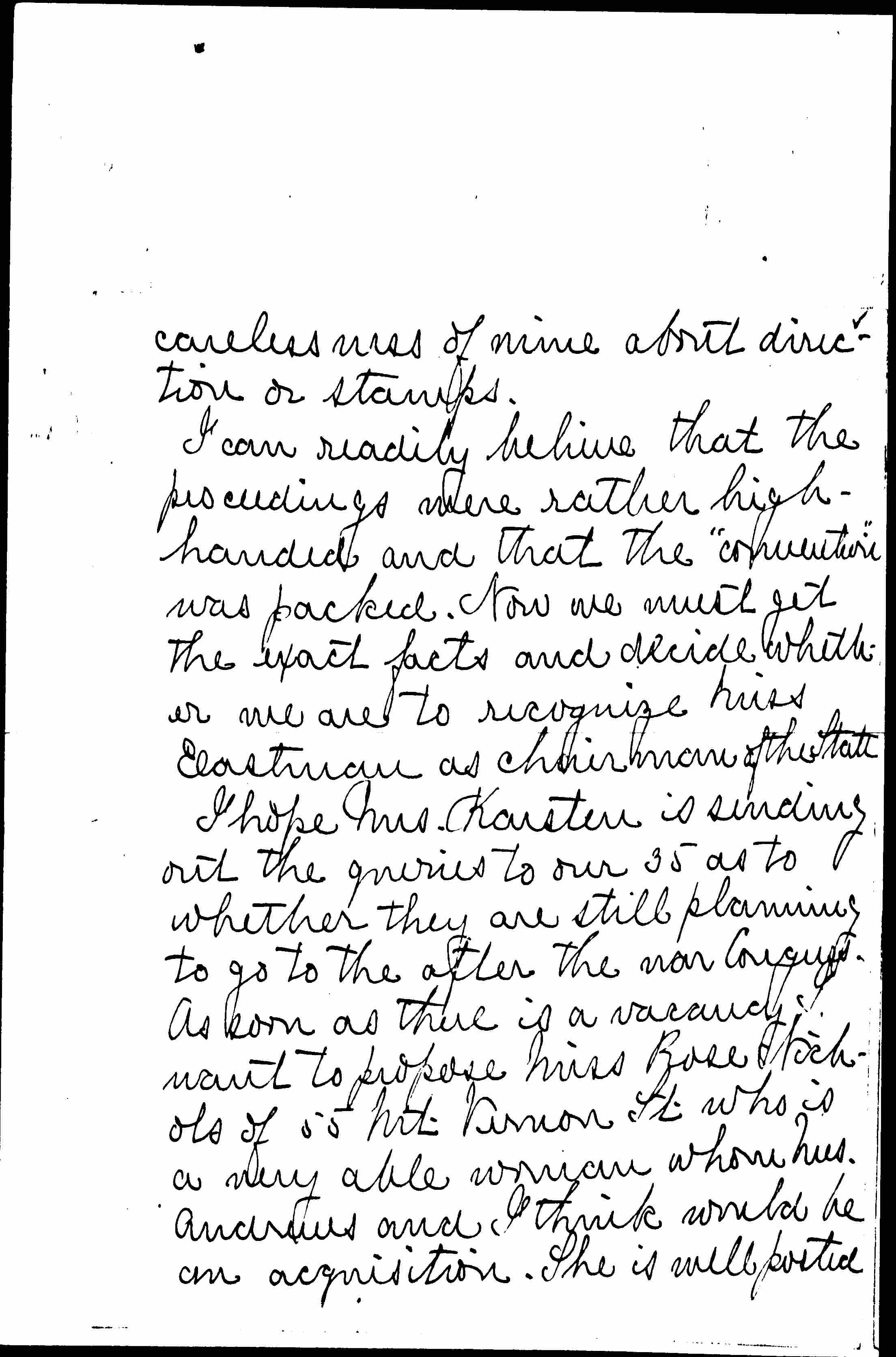 I can readily believe that the proceedings were rather highhanded and that the "convention" was packed. Now we must get the exact facts and decide whether we are to recognize Miss Eastman as chairman of the State.