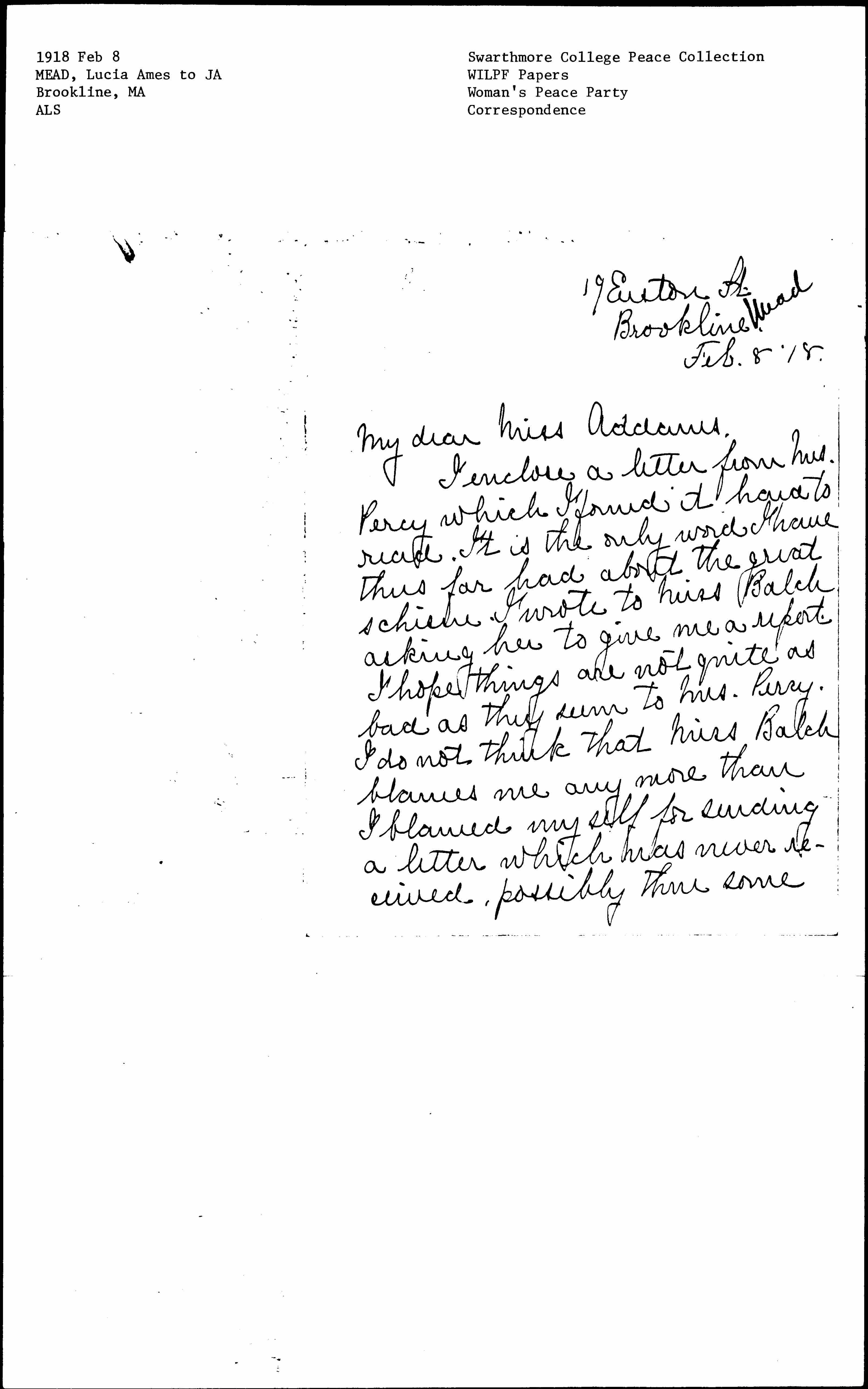 I enclose a letter from Mrs. Percy which I found it hard to read. It is the only word I have thus far had about the great schism. I wrote to Miss Balch asking her to give me a report. I hope things are not quite as bad as they seem to Mrs. Percy. I do not think that Miss Balch blames me any more than I blamed myself for sending a letter which was never received, possibly [through] some [page 2] carelessness of mine about direction or stamps.