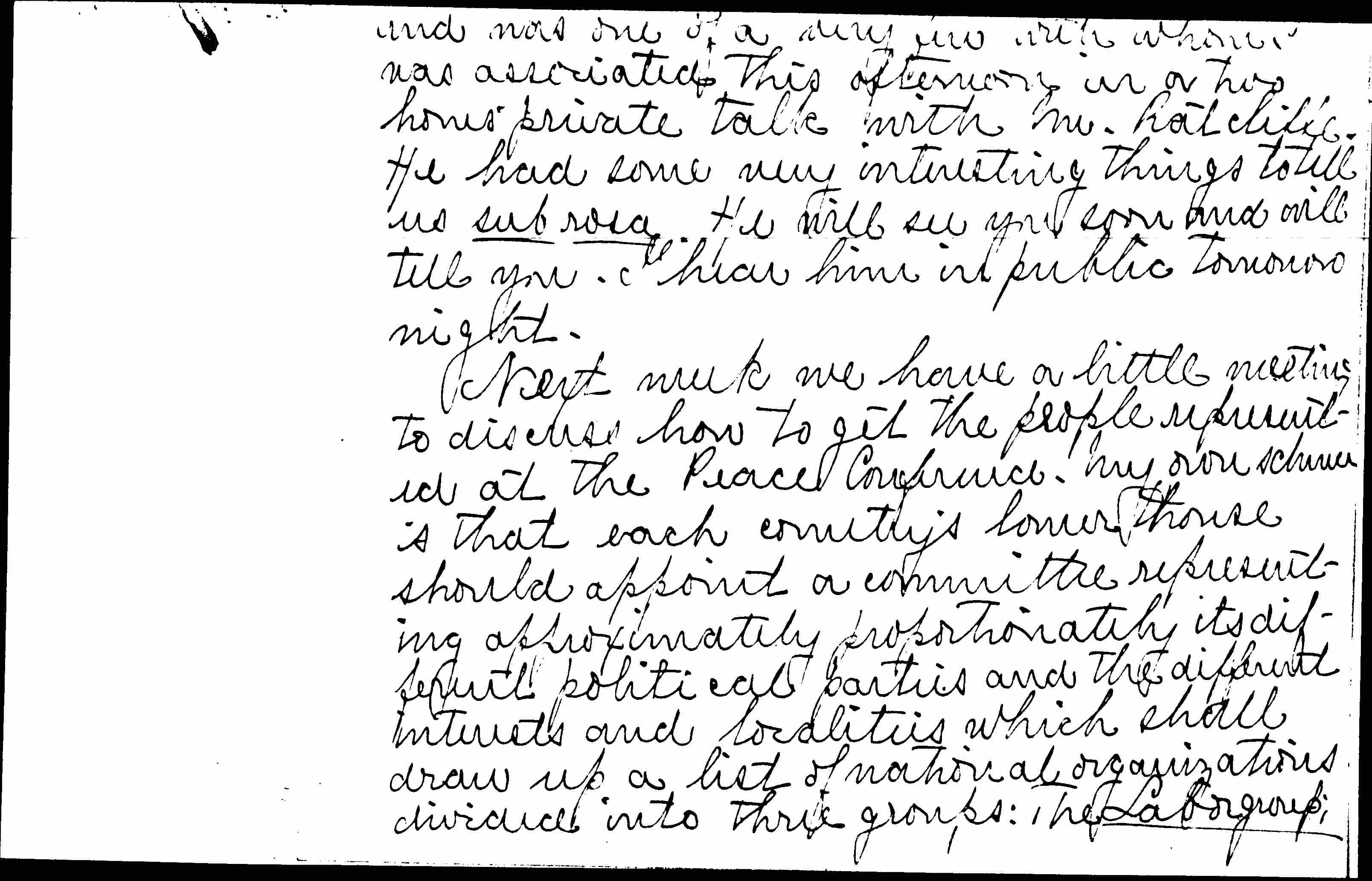 Next week we have a little meeting to discuss how to get the people represented at the Peace Conference. My own scheme is that each country's lower house should appoint a committee representing approximately proportionately its different political parties and the different interests and localities which shall draw up a list of national organizations divided into three groups: The Labor group: [page 4] A.F. of L., Granges etc.; The Business group: Chambers of Commerce, national banking and shipping organizations etc; the Intellectuals: The Gen. Federation of Churches, N.E.A. etc.