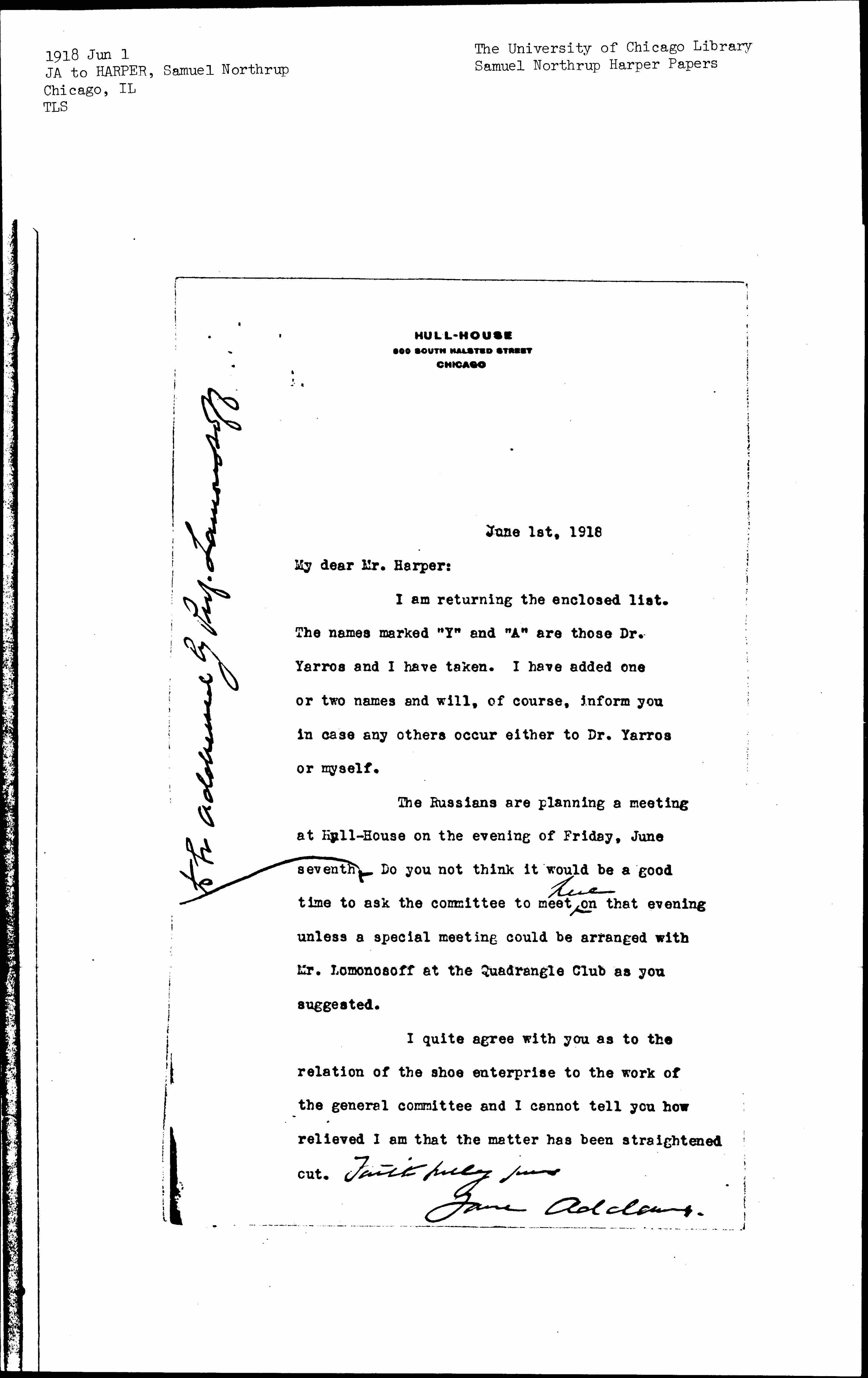 The Russians are planning a meeting at Hull-House on the evening of Friday, June seventh ↑to be addressed by Prof [Lomonosov]↓. Do you not think it would be a good time to ask the committee to meet ↑here↓ on that evening unless a special meeting could be arranged with Mr. [Lomonosov] at the Quadrangle Club as you suggested.