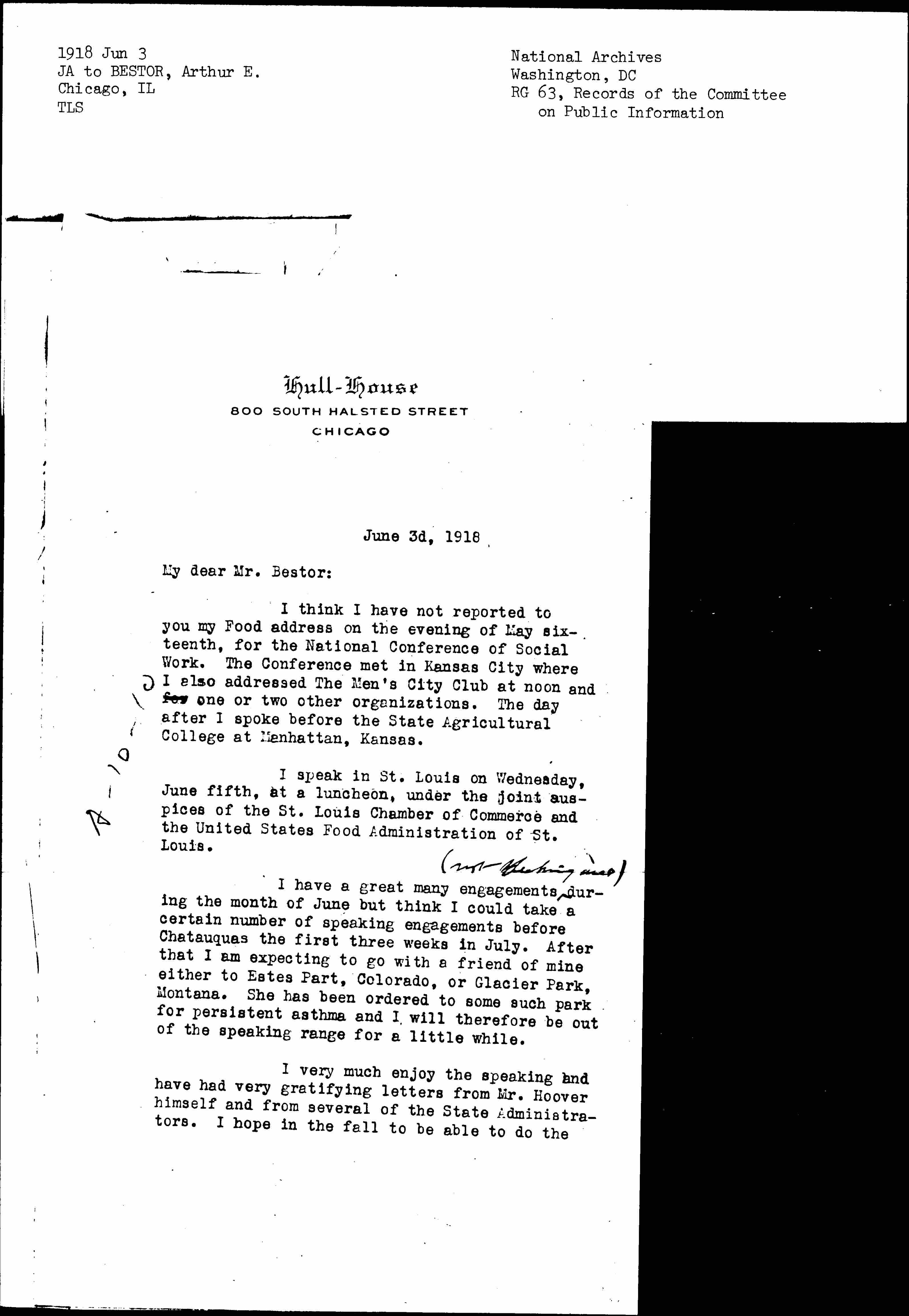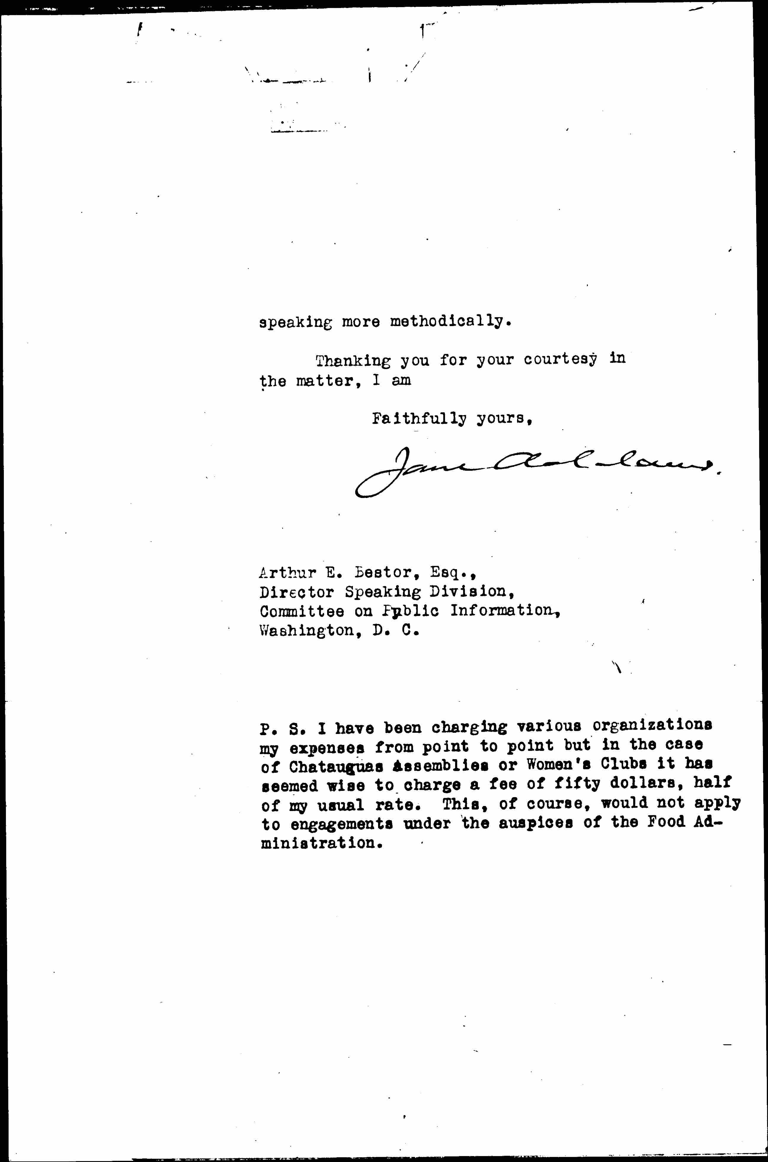 P.S. I have been charging various organizations my expenses from point to point but in the case of [Chautauquas] Assemblies or Women's Clubs it has seemed wise to charge a fee of fifty dollars, half of my usual rate. This, of course, would not apply to engagements under the auspices of the Food Administration.