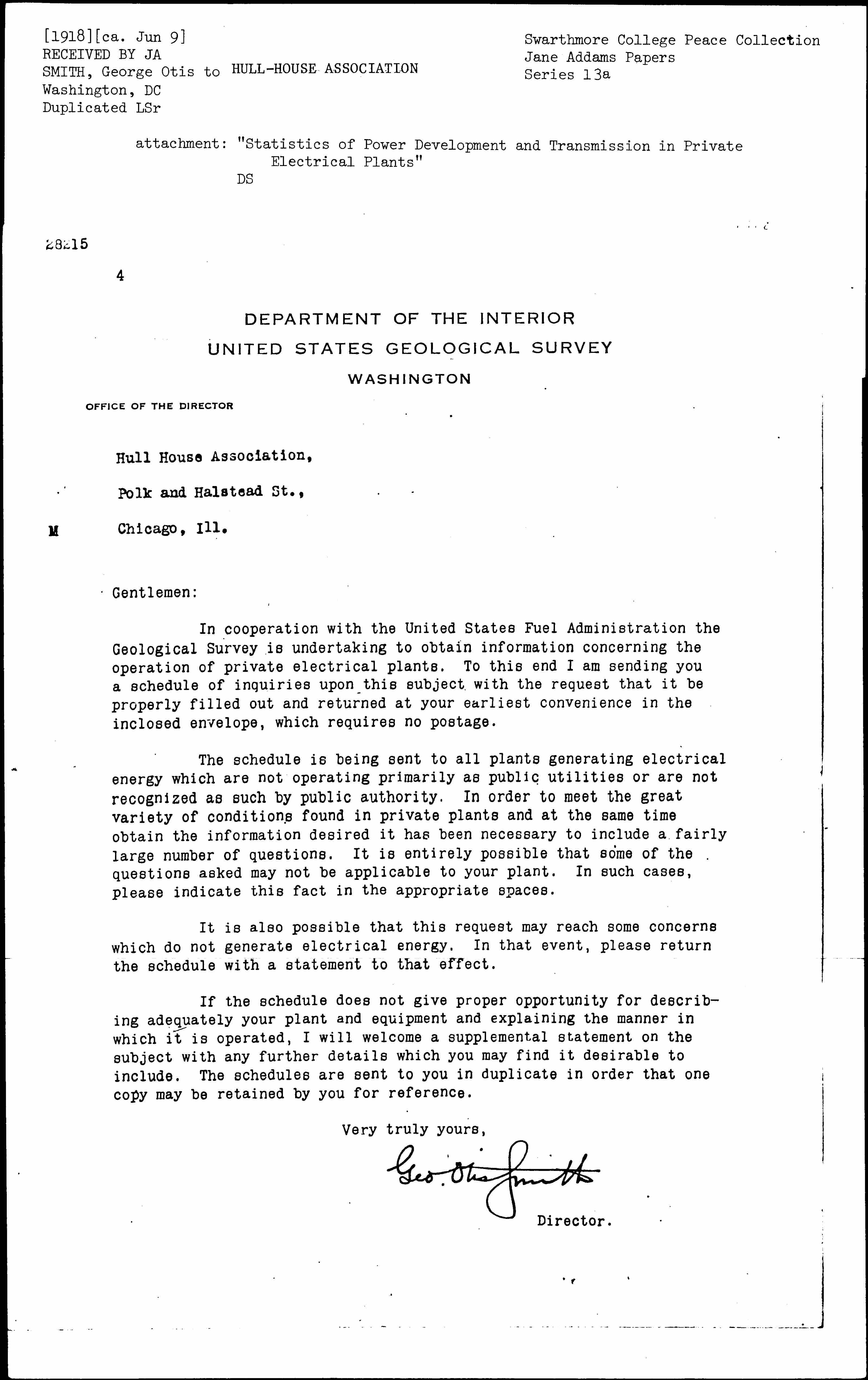 In cooperation with the United States Fuel Administration the Geological Survey is undertaking to obtain information concerning the operation of private electrical plants. To this end I am sending you a schedule of inquiries upon this subject with the request that it be properly filled out and returned at your earliest convenience in the [enclosed] envelope, which requires no postage.