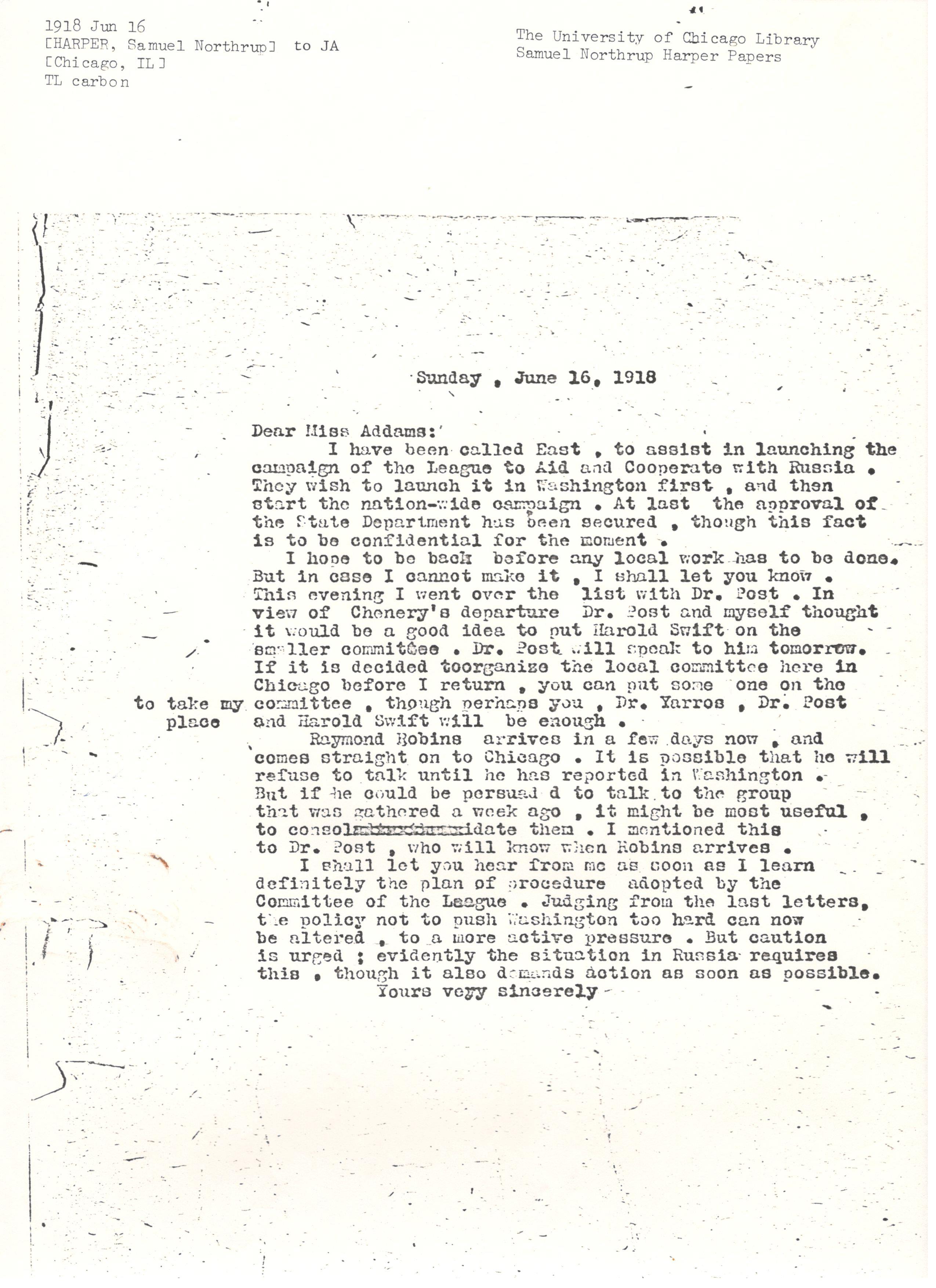 Raymond Robins arrives in a few days now, and comes straight on to Chicago. It is possible that he will refuse to talk until he has reported in Washington. But if he could be persuaded to talk to the group that was gathered a week ago, it might be most useful, to consolidate them. I mentioned this to Dr. Post, who will know when Robins arrives.