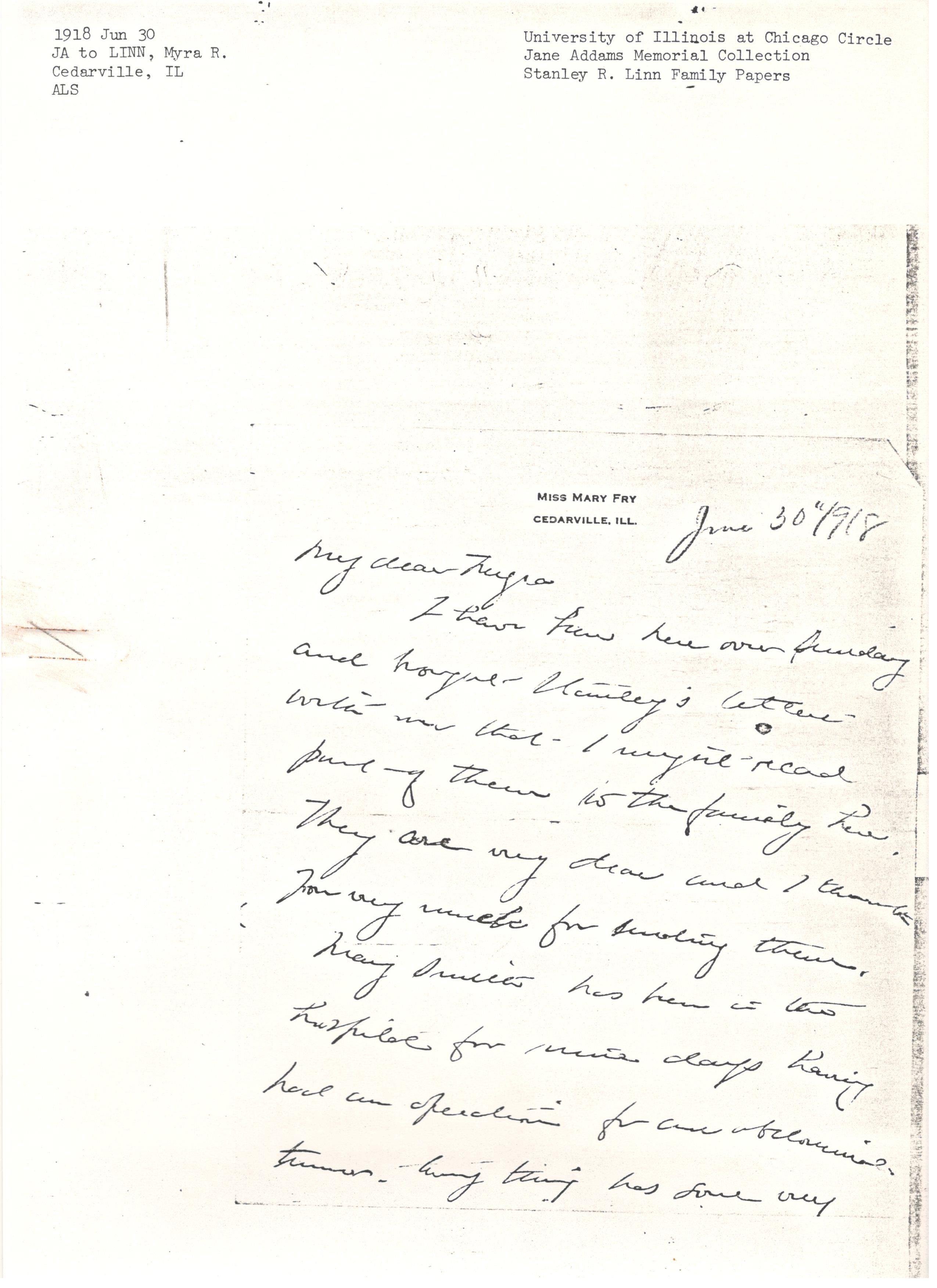 Mary Smith has been in the hospital for nine days having had an operation for an abdominal tumor. Every thing has gone very [page 2] well but of course we have been anxious and I have spent so much time at the hospital that I seem to have done nothing else for many days.