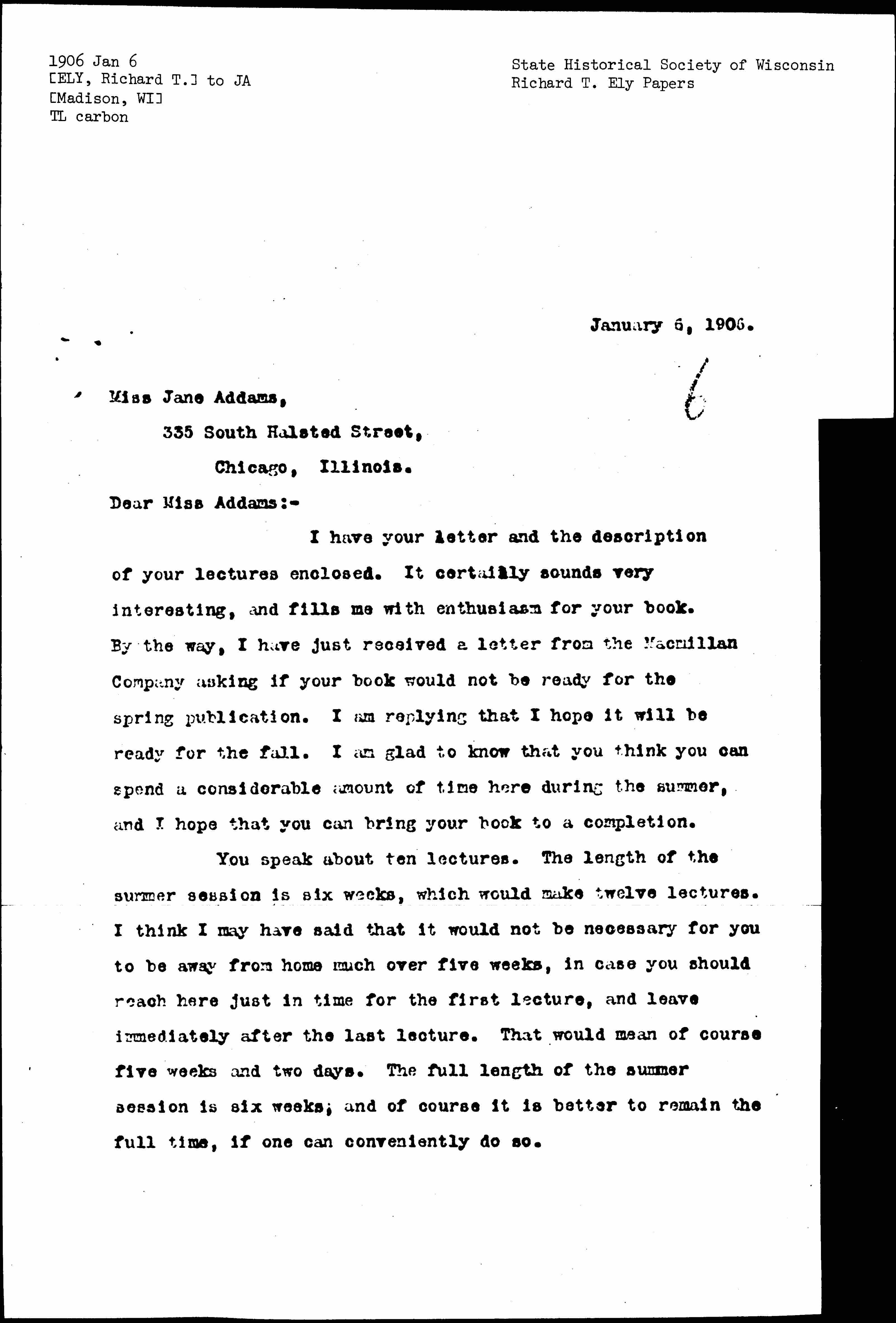 You speak about ten lectures. The length of the summer session is six weeks, which would make twelve lectures. I think I may have said that it would not be necessary for you to be away from home much over five weeks, in case you should reach here just in time for the first lecture, and leave immediately after the last lecture. That would mean of course five weeks and two days. The full length of the summer session is six weeks, and of course it is better to remain the full time, if one can conveniently do so. [page 2]