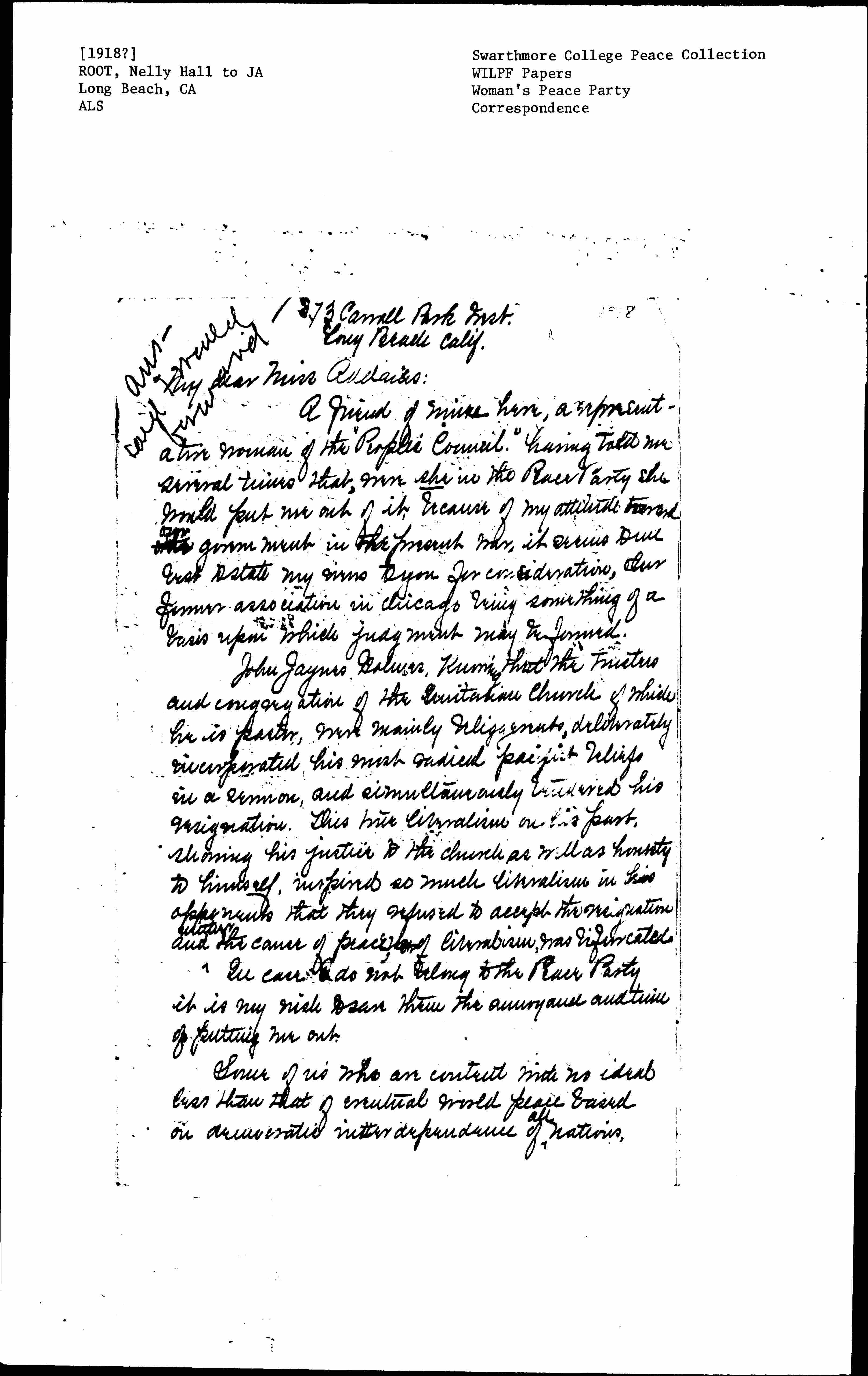 A friend of mine here, a representative woman of the "People's Council" having told me several times that, were she in the Peace Party she would put me out of it, because of my attitude toward [illegible] ↑our↓ government in the present war, it seems to me [best] to state my views to you for consideration, [our] former association in Chicago being something of a basis upon which judgment may be formed.