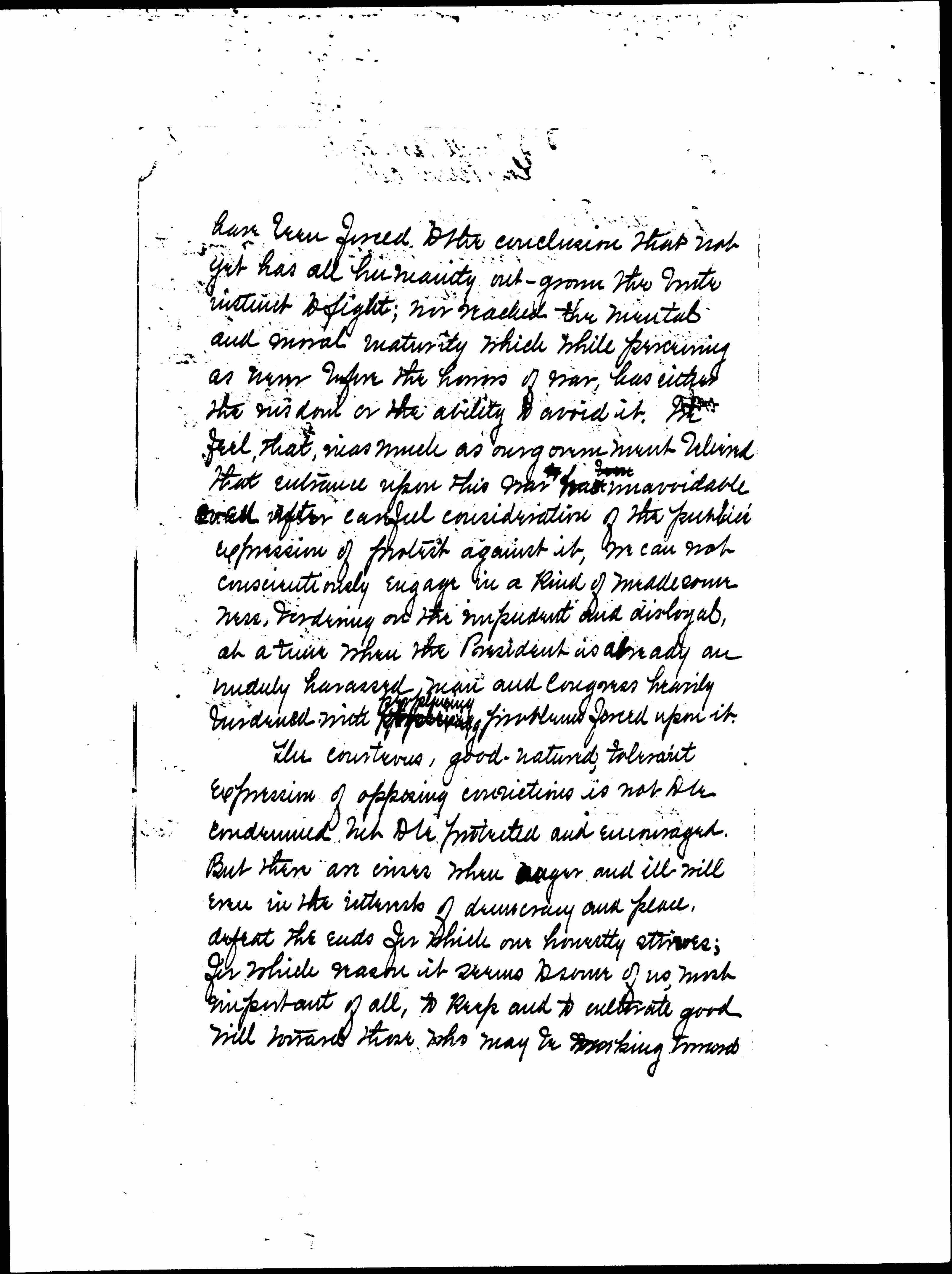 Some of us who are content with no ideal less than that of eventual world peace based on democratic interdependence of ↑all↓ nations, [page 2] have been forced to the conclusion that not yet has all humanity out-grown the [illegible] instinct to fight; nor reached the mental and moral maturity which while perceiving as never before the horrors of war, has either the wisdom or the ability to avoid it. We feel, that, inasmuch as our government believed that entrance upon this war was ↑[illegible]↓ unavoidable [even] after careful consideration of the public expression of protest against it, we can not conscientiously engage in a kind of meddlesomeness, bordering on the impudent and disloyal, at a time when the President is already an unduly harassed man and Congress heavily burdened with [illegible] ↑[perplexing]↓ problems forced upon it.