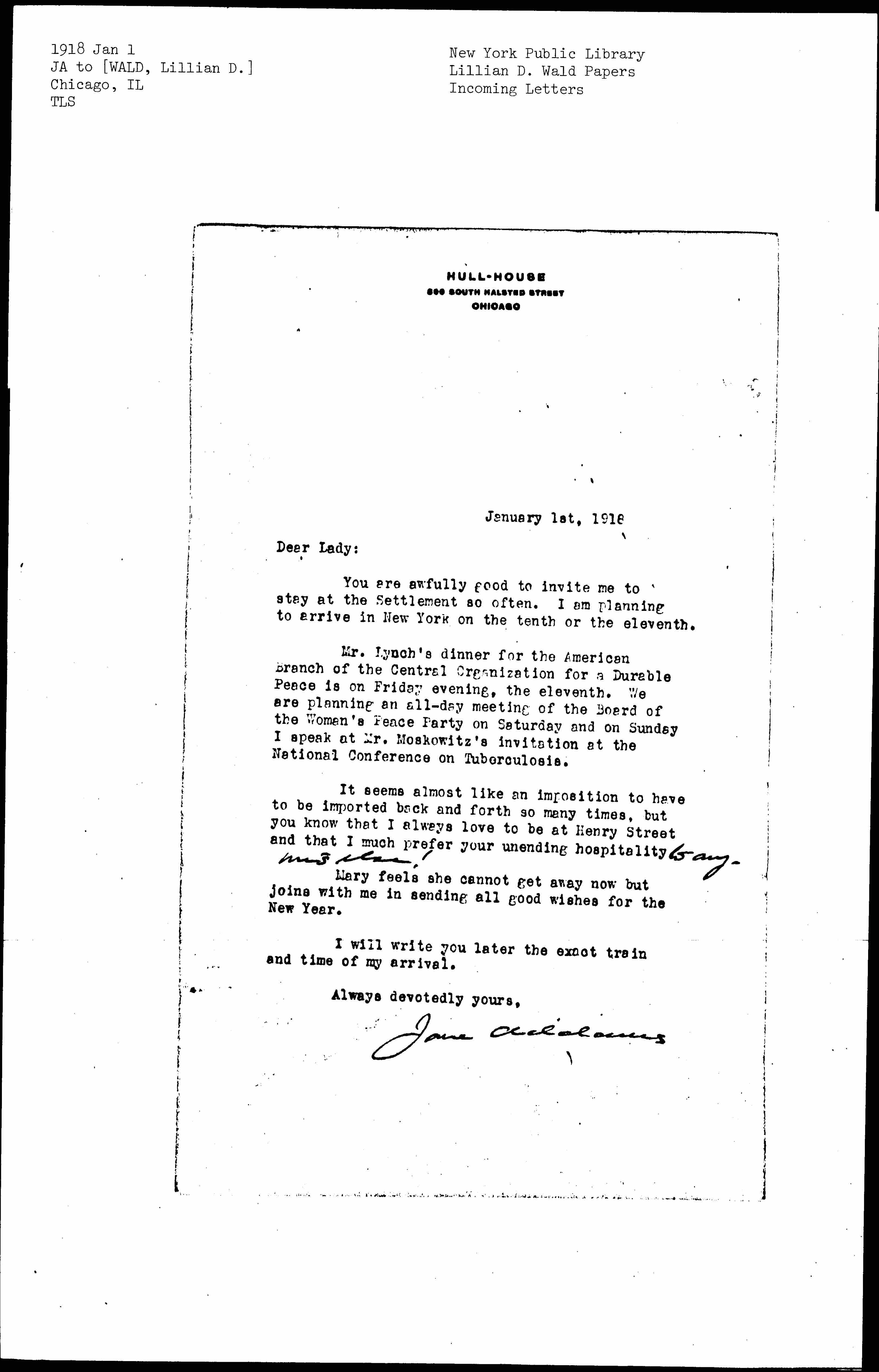 You are awfully good to invite me to stay at the Settlement so often. I am planning to arrive in New York on the tenth or the eleventh.