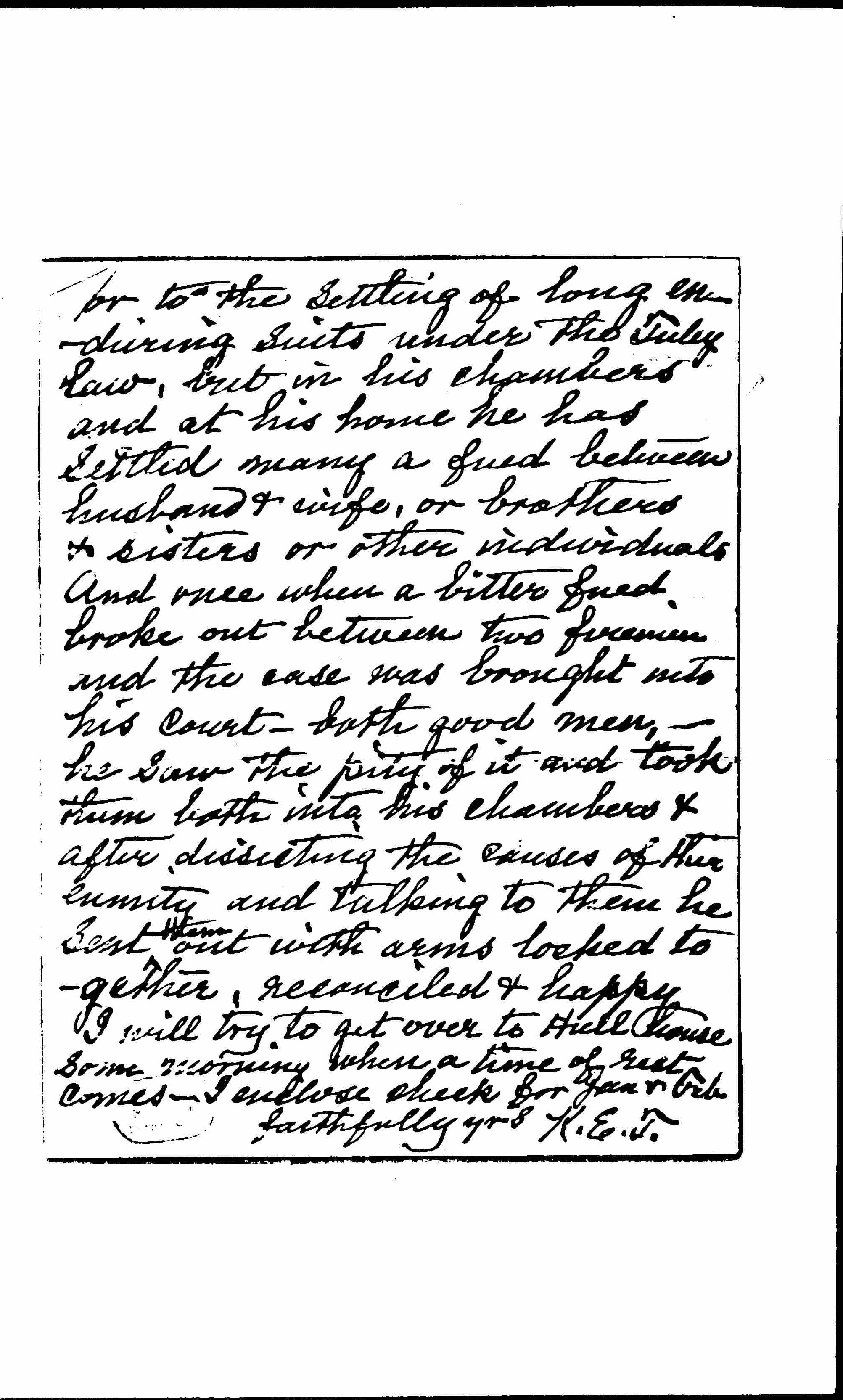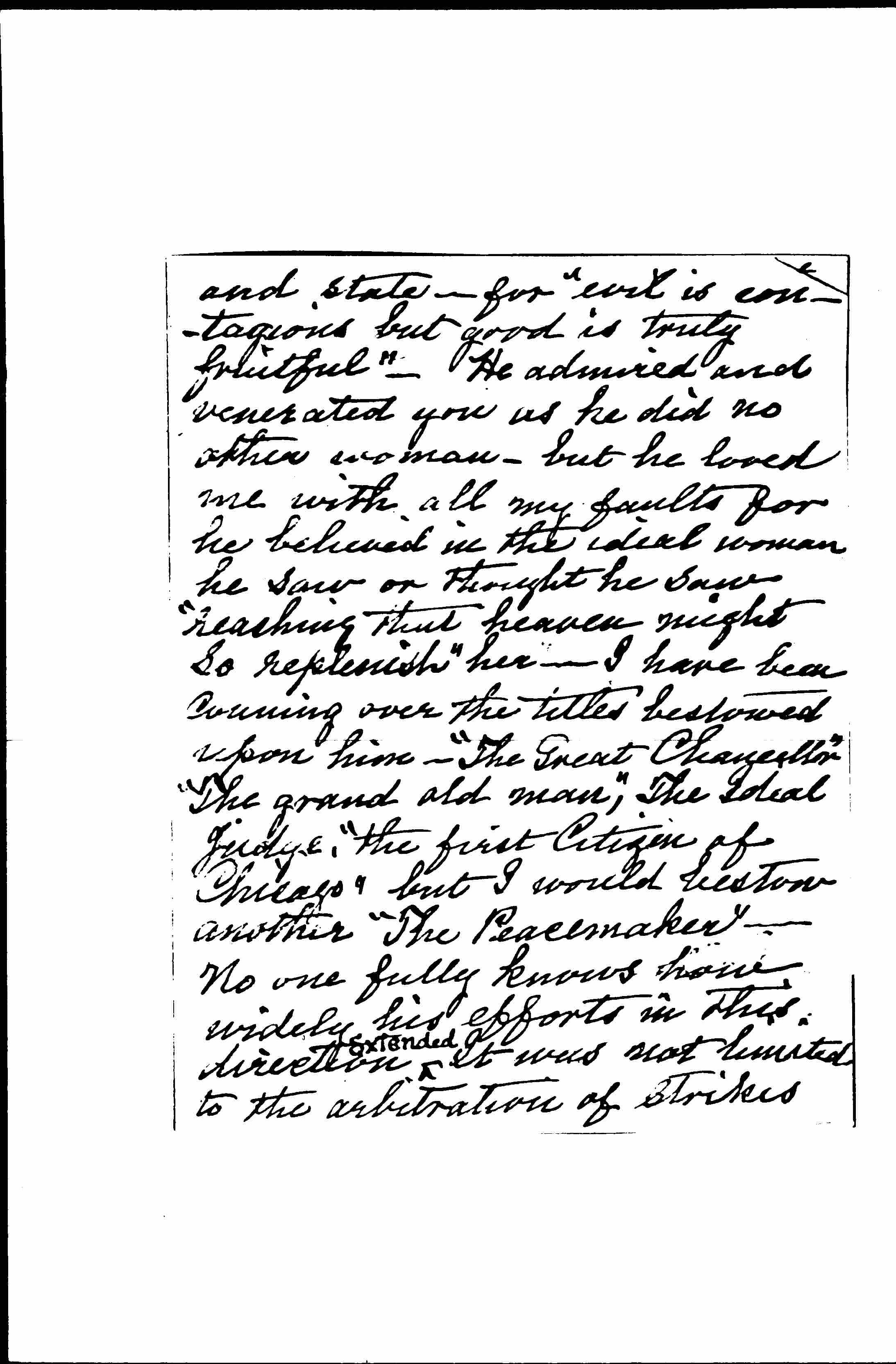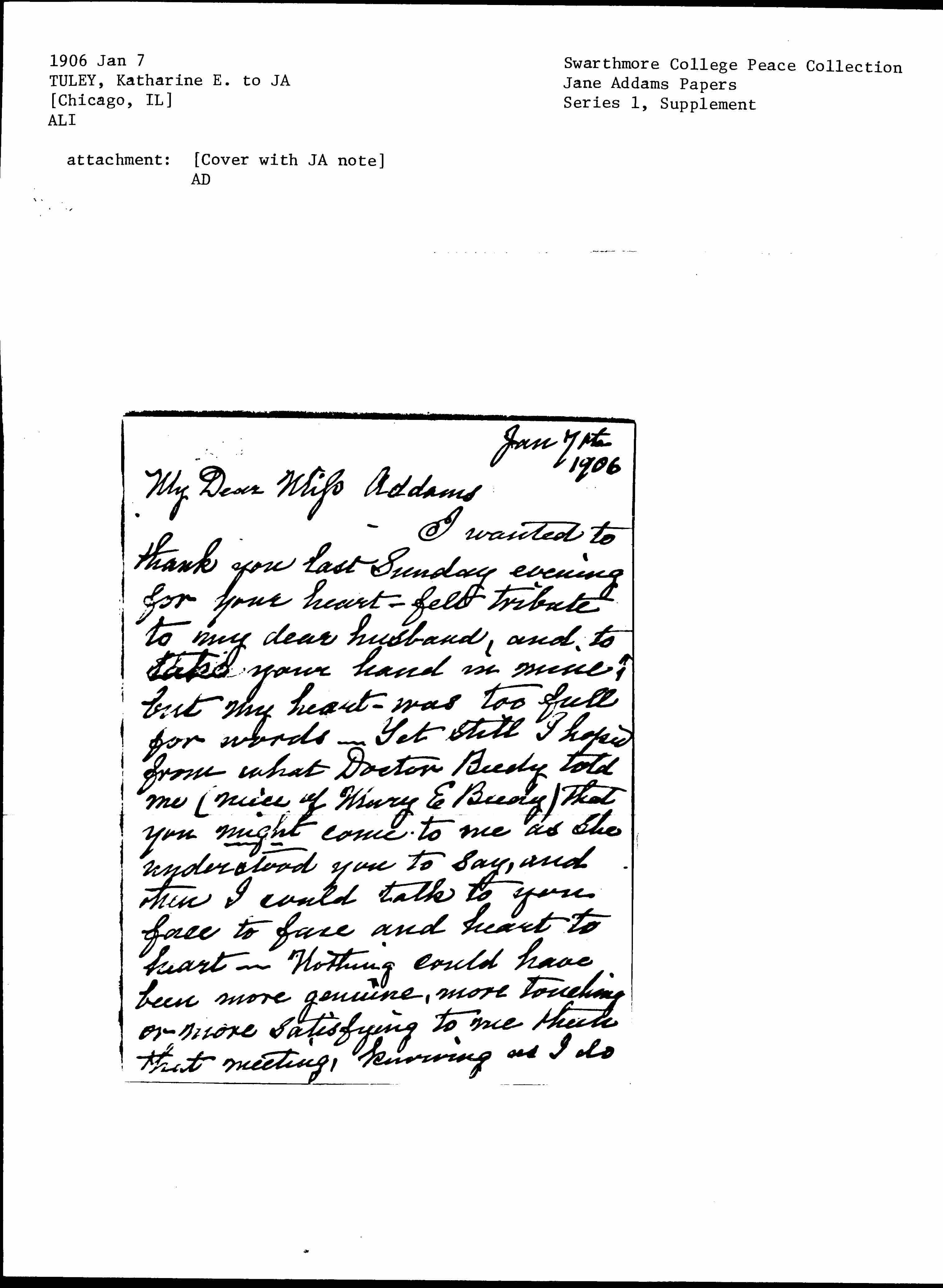 I wanted to thank you last Sunday evening for your heart-felt tribute to my dear husband, and to take your hand in mine, but my heart was too full for words. Yet still I hoped from what Doctor Beedy told me (niece of Mary E Beedy) that you might come to me as she understood you to say, and then I could talk to you face to face and heart to heart. Nothing could have been more genuine, more touching or more satisfying to me than that meeting, knowing as I do [page 2] more than all others, of the gradual ripening, year after year, of a beautiful and lovable character. I can truly say that our last years together were our best years. After fifty years of traveling ↑together↓ we realized Brownings words "the best was yet to be". The Severance of this union is hard, but God is good! He left at the maximum of his development, honored and loved as no other man, and no other woman save one, in this city was is ↑in this city↓. He escaped much Suffering & probable blindness, (cataracts in both eyes and one sightless) & he has left an indelible impress on his time, as I believe, extending beyond this city [page 3] and state -- for "evil is contagious but good is truly fruitful" -- He admired and venerated you as he did no other woman, but he loved me with all my faults for he believed in the ideal woman he saw or thought he saw "reaching that heaven might so replenish" her. I have been cunning over the titles bestowed upon him -- "The Great Chancellor" "The grand old man," The Ideal Judge, "the first Citizen of Chicago" but I would bestow another "The Peacemaker" -- No one fully knows how widely his efforts in this direction ↑extended↓. It was not limited to the arbitration of strikes [page 4] or the settling of long enduring suits under the Tuley law, but in his chambers and at his home he has Settled many a [feud] between husband & wife, or brothers & sisters or other individuals. And once when a bitter [feud] broke out between two firemen and the case was brought into his court -- both good men -- he saw the pity of it and took them both into his chambers & after dissecting the causes of their enmity and talking to them he Sent ↑them↓ out with arms locked together, reconciled & happy. I will try to get over to Hull house some morning when a time of rest comes -- I enclose checks for Jan & Feb