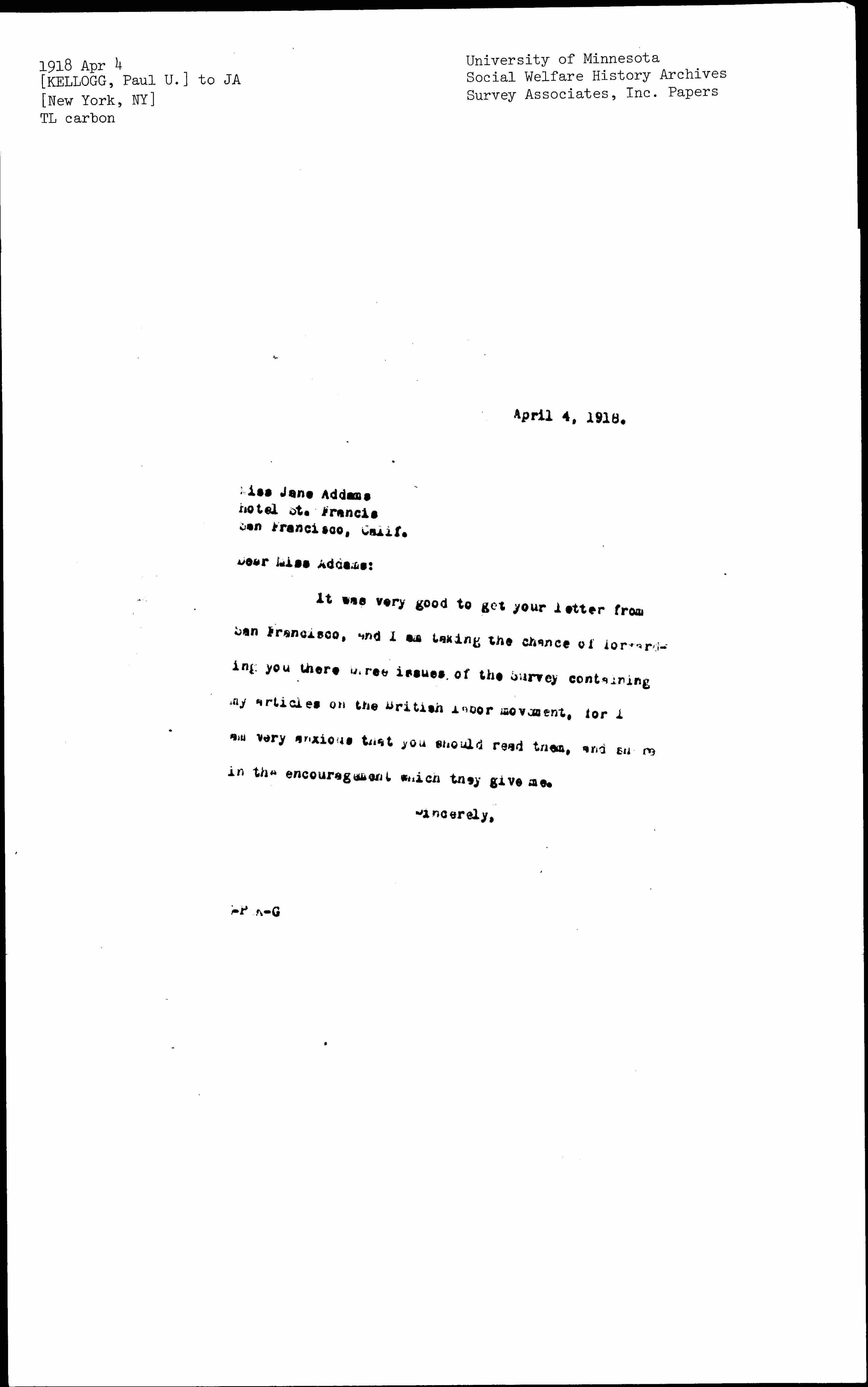 It was very good to get your letter from San Francisco, and I am taking the chance of forwarding you there three issues of the Survey containing my articles on the Britain Labor movement, for I am very anxious that you should read them, and [share] in the encouragement which they give me.