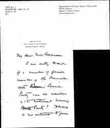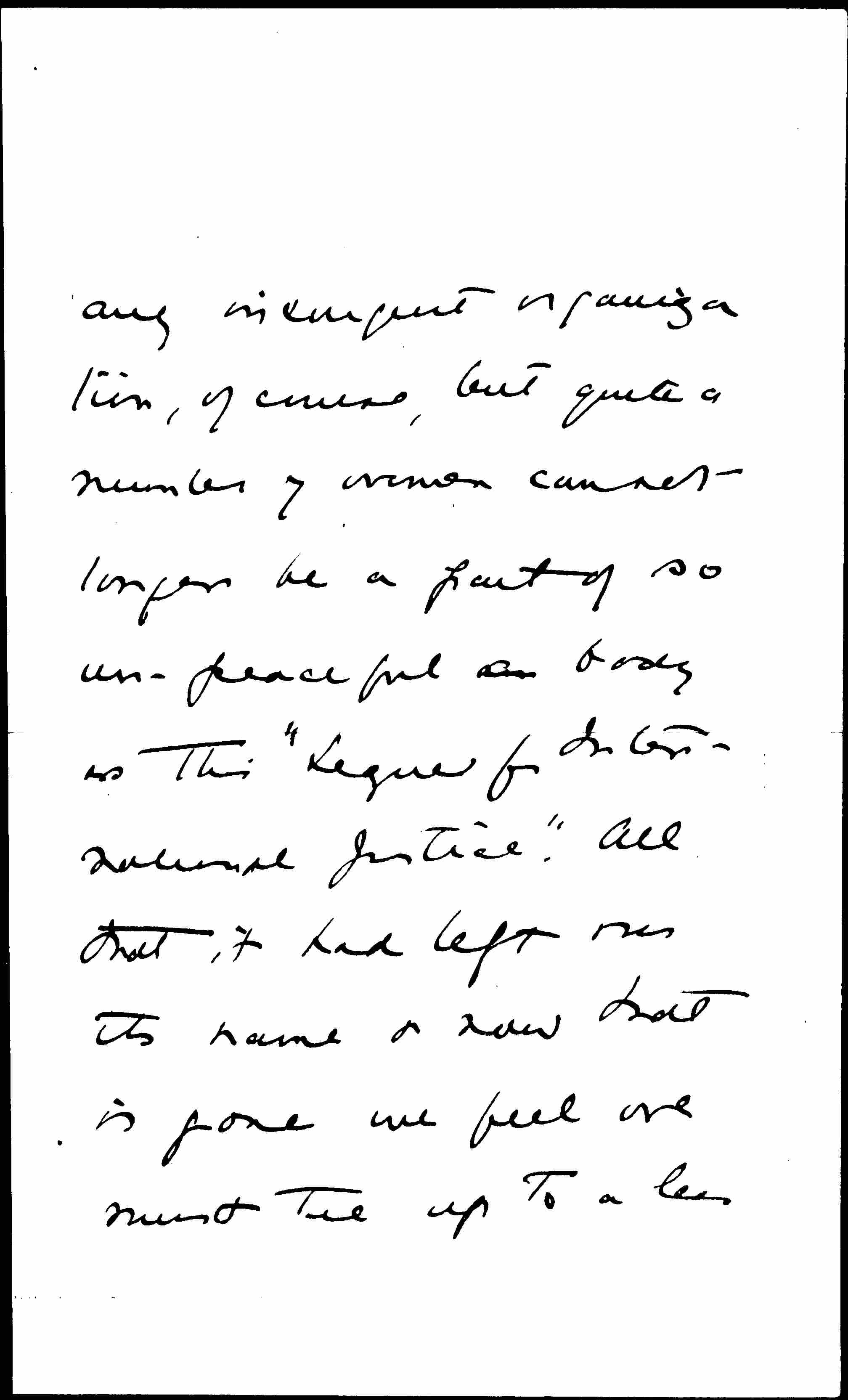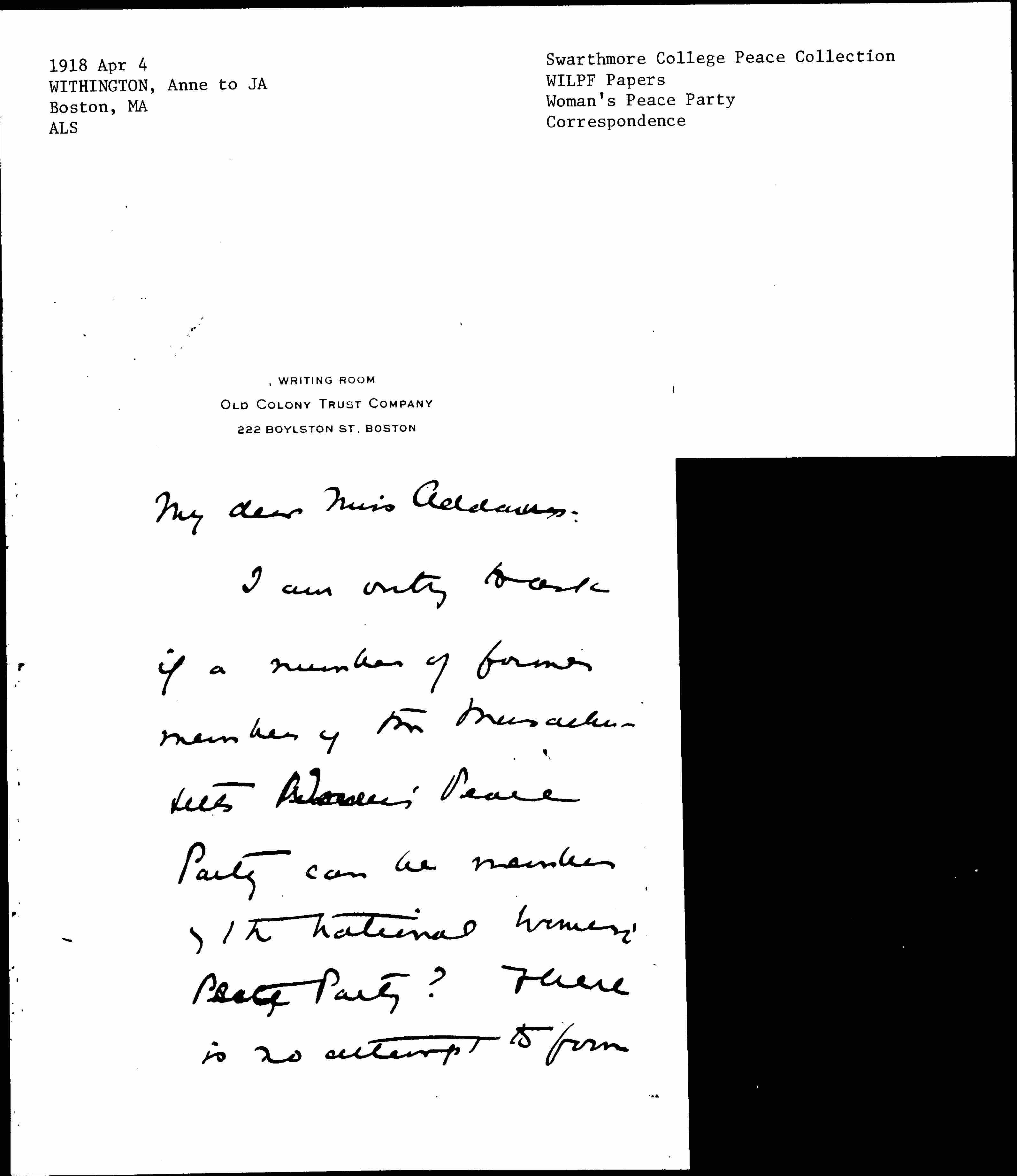 I am writing to ask if a number of former members of the Massachusetts [Woman's] Peace Party can be [members of] the National [Woman's] Peace Party? There is no attempt to form [page 2] any insurgent organization, of course, but quite a number of women cannot longer be a part of so un-peaceful a body as this "League for International Justice." All that it had left was its name & now that is gone we feel we must tie up to a less [page 3] wobbly an organization.