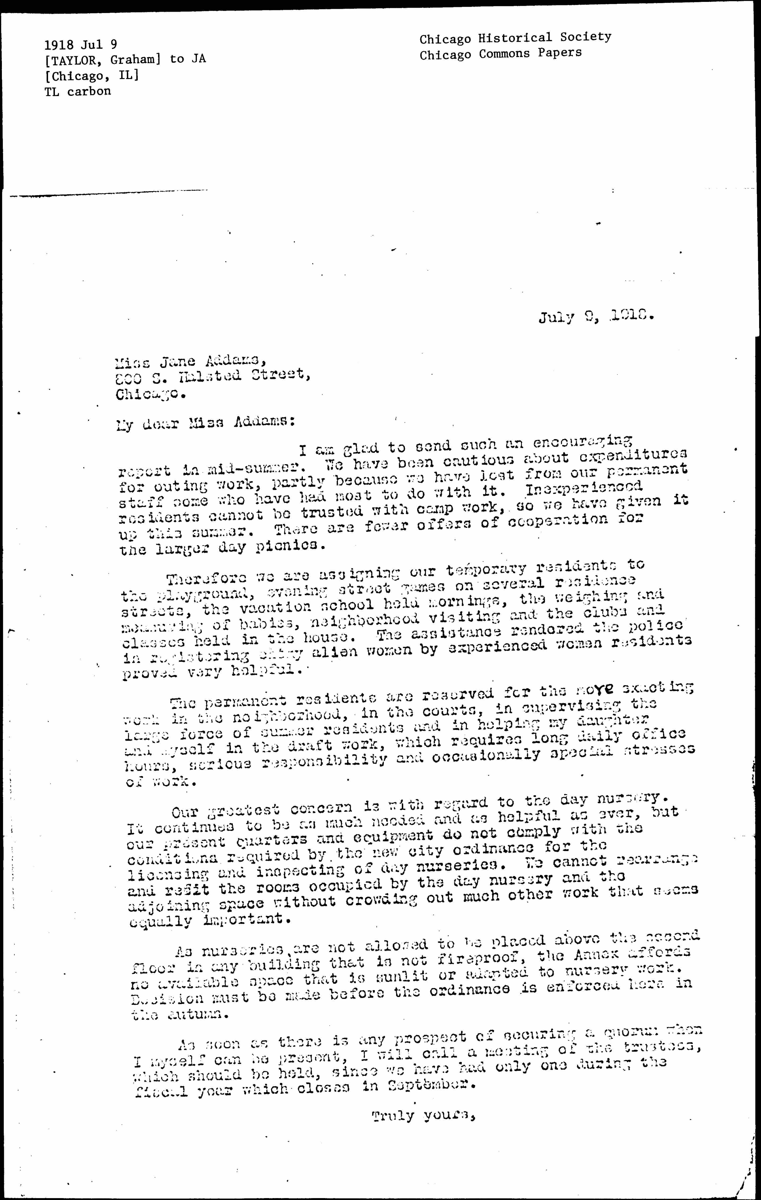 Therefore we are assigning our temporary residents to the playground, evening street games on several residence streets, the vacation school held mornings, the weighing and measuring of babies, neighborhood visiting and the clubs and classes held in the house. The assistance rendered the police in registering [illegible] alien women by experienced women residents proved very helpful.