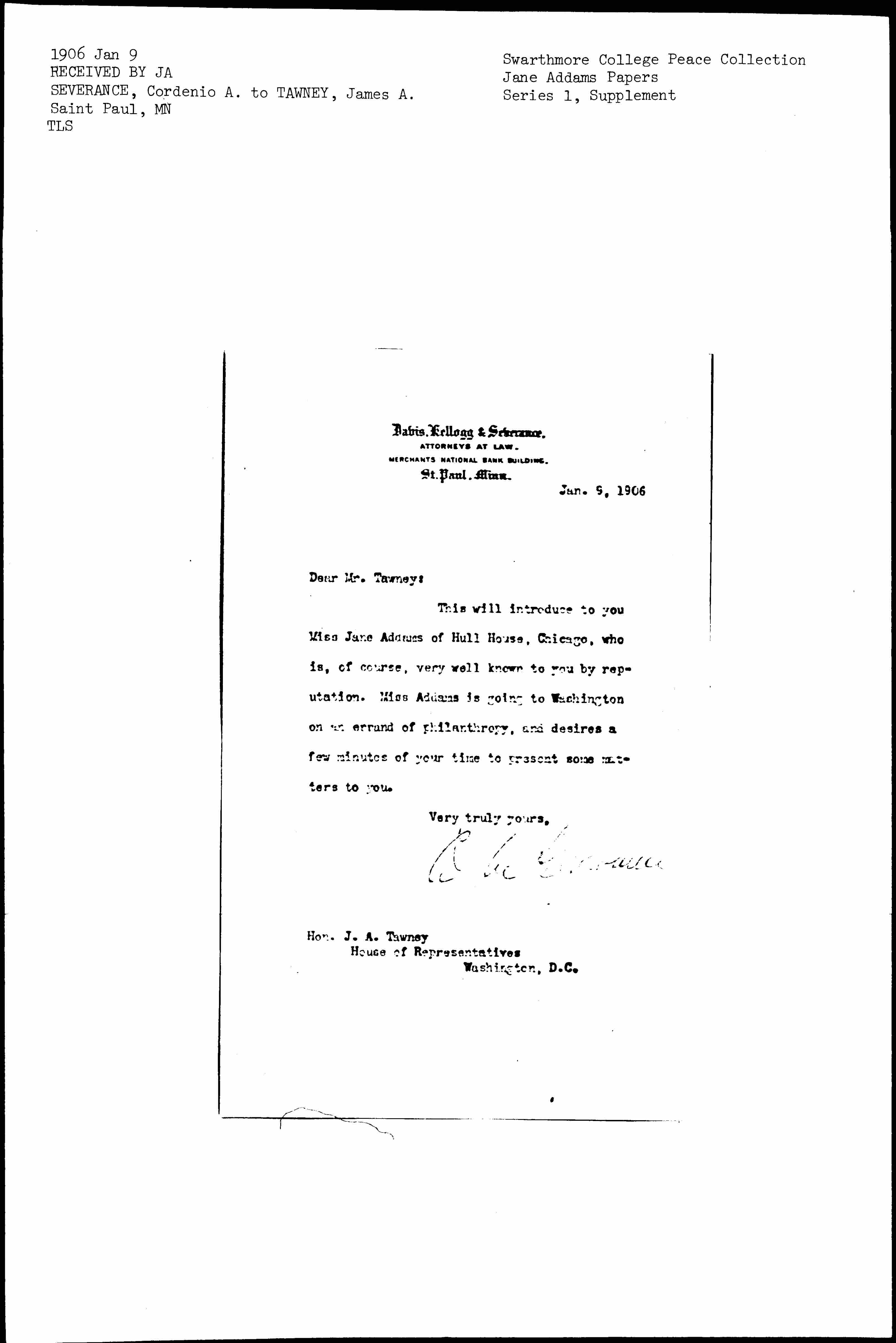 This will introduce to you Miss Jane Addams of Hull House, Chicago, who is, of course, very well known to you by reputation. Miss Addams is going to Washington on an errand of philanthropy, and desires a few minutes of your time to present some matters to you.