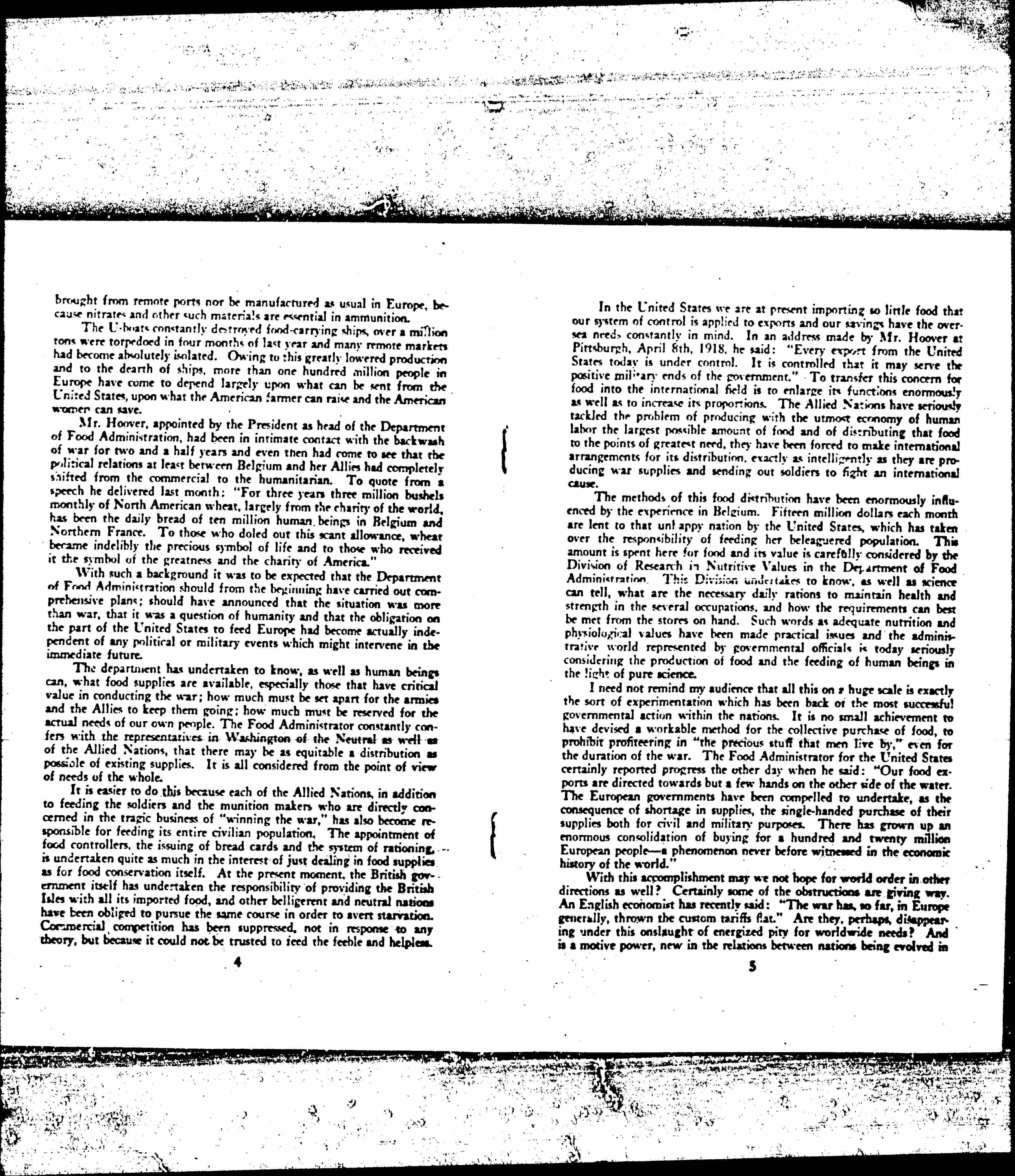 It would be possible to illustrate something of this elementary change from the governmental recognition of the Red Cross and its service in [cooperation] with government officials in Belgium, France, Italy, [Serbia] and [Romania]. But, perhaps, because I have been somewhat identified with the Federal Department of Food Administration, I find it easier to trace this shifting of values through governmental action in regard to food supplies.