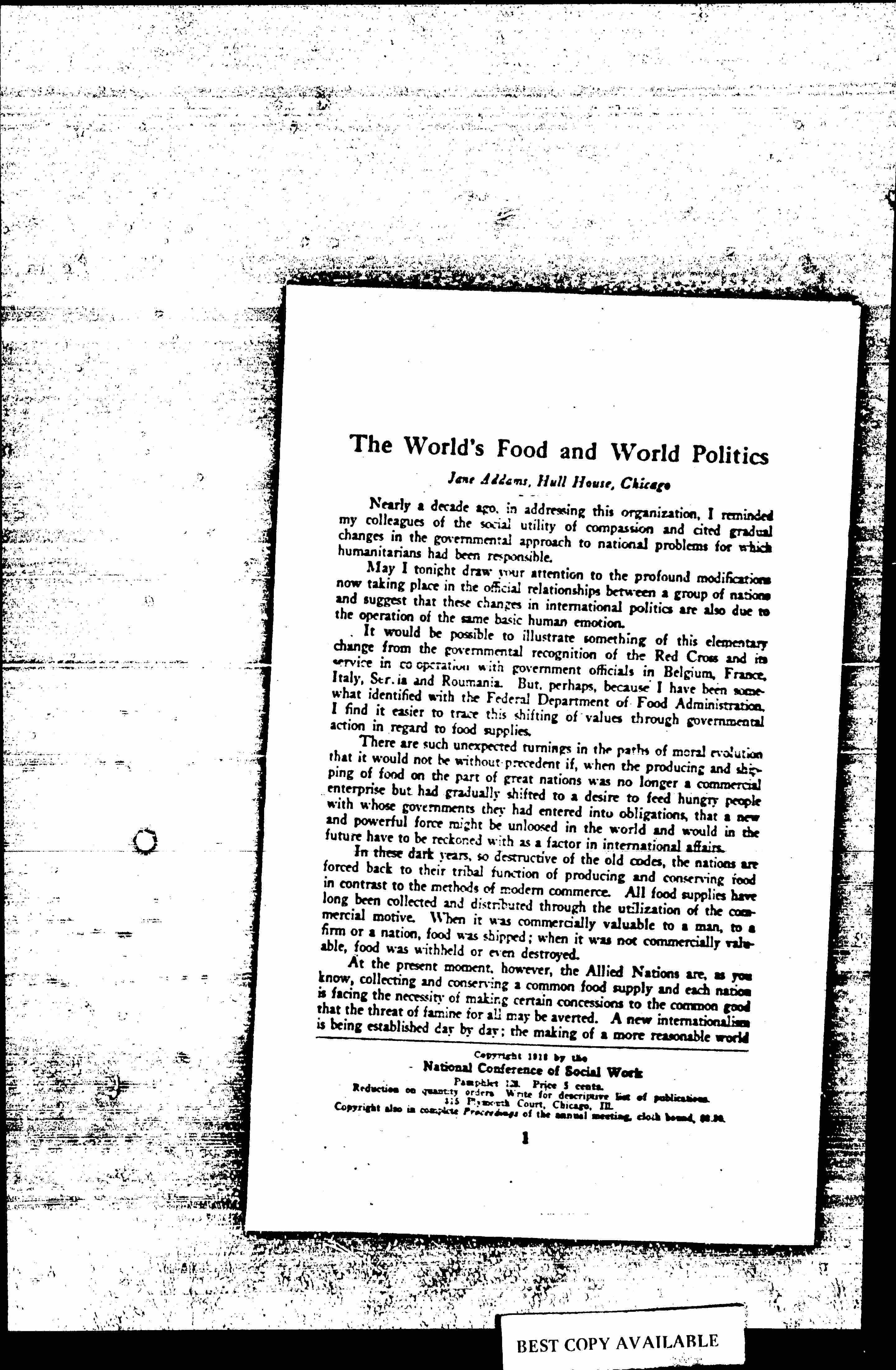 It is possible that the more sophisticated questions of national grouping and territorial control would gradually adjust themselves if the paramount human question of food for the hungry be fearlessly and drastically treated upon an international basis. The League of Nations, destined to end wars, upon which the whole world led by President Wilson, is fastening its hopes, may be founded not upon broken bits of international law, but upon ministrations to primitive human needs. The League would then be organized de facto as all the really stable political institutions in the world have been. [page 7]