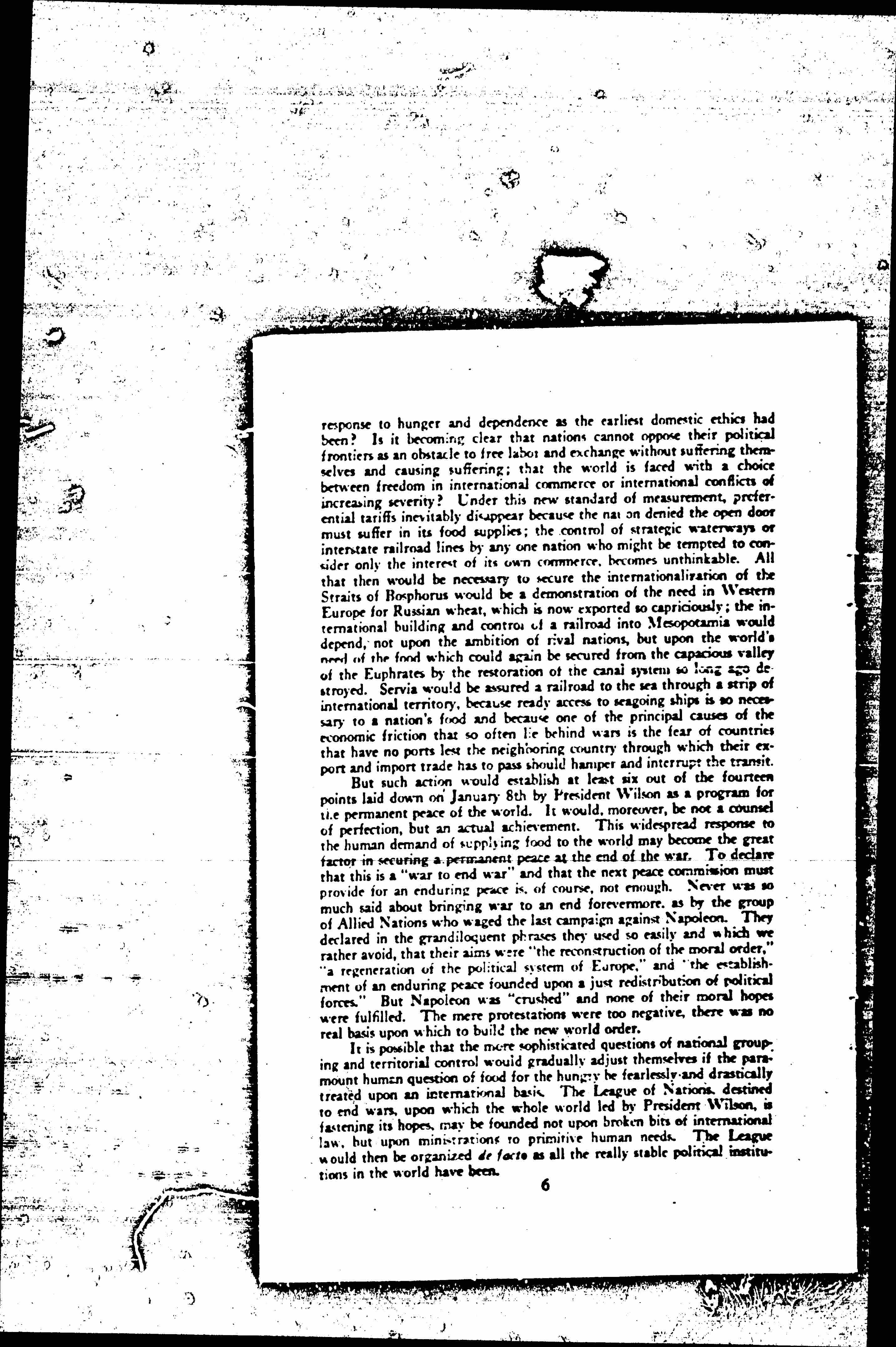 With this accomplishment may we not hope for world order in other directions as well? Certainly some of the obstructions are giving way. An English economist has recently said: "The war has, so far, in Europe generally, thrown the custom tariffs flat." Are they, perhaps, disappearing under this onslaught of energized pity for worldwide needs? And is a motive power, new in the relations between nations being evolved in [page 6] response to hunger and dependence as the earliest domestic ethics had been? Is it becoming clear that nations cannot oppose their political frontiers as an obstacle to free labor and exchange without suffering themselves and causing suffering; that the world is faced with a choice between freedom in international commerce or international conflicts of increasing severity? Under this new standard of measurement, preferential tariffs inevitably disappear because the nation denied the open door must suffer in its food supplies; the control of strategic waterways or interstate railroad lines by any one nation who might be tempted to consider only the interest of its own commerce, becomes unthinkable. All that then would be necessary to secure the internationalization of the Straits of [Bosporus] would be a demonstration of the need in Western Europe for Russian wheat, which is now exported so capriciously; the international building and control of a railroad into Mesopotamia would depend, not upon the ambition of rival nations, but upon the world's need of the food which could again be secured from the capacious valley of the Euphrates by the restoration of the canal system so long ago destroyed. [Serbia] would be assured a railroad to the sea through a strip of international territory, because ready access to seagoing ships is so necessary to a nation's food and because one of the principal causes of the economic friction that so often lie behind wars is the fear of countries that have no ports lest the neighboring country through which their export and import trade has to pass should hamper and interrupt the transit.