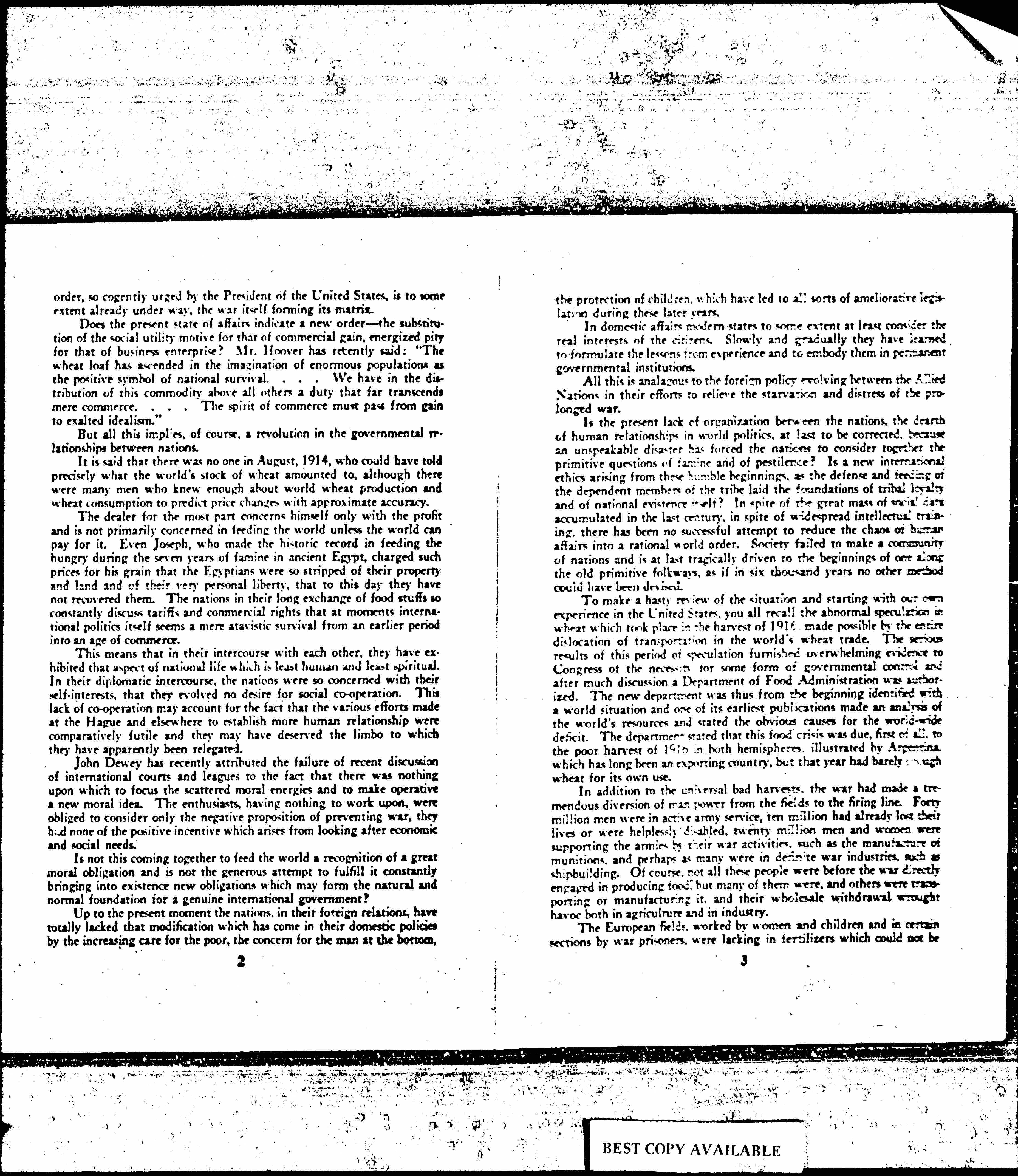 At the present moment, however, the Allied Nations are, as you know, collecting and conserving a common food supply and each nation is facing the necessity of making certain concessions to the common good that the threat of famine for all may be averted. A new internationalism is being established day by day; the making of a more reasonable world [page 2] order, so cogently urged by the President of the United States, is to some extent already under way, the war itself forming its matrix.