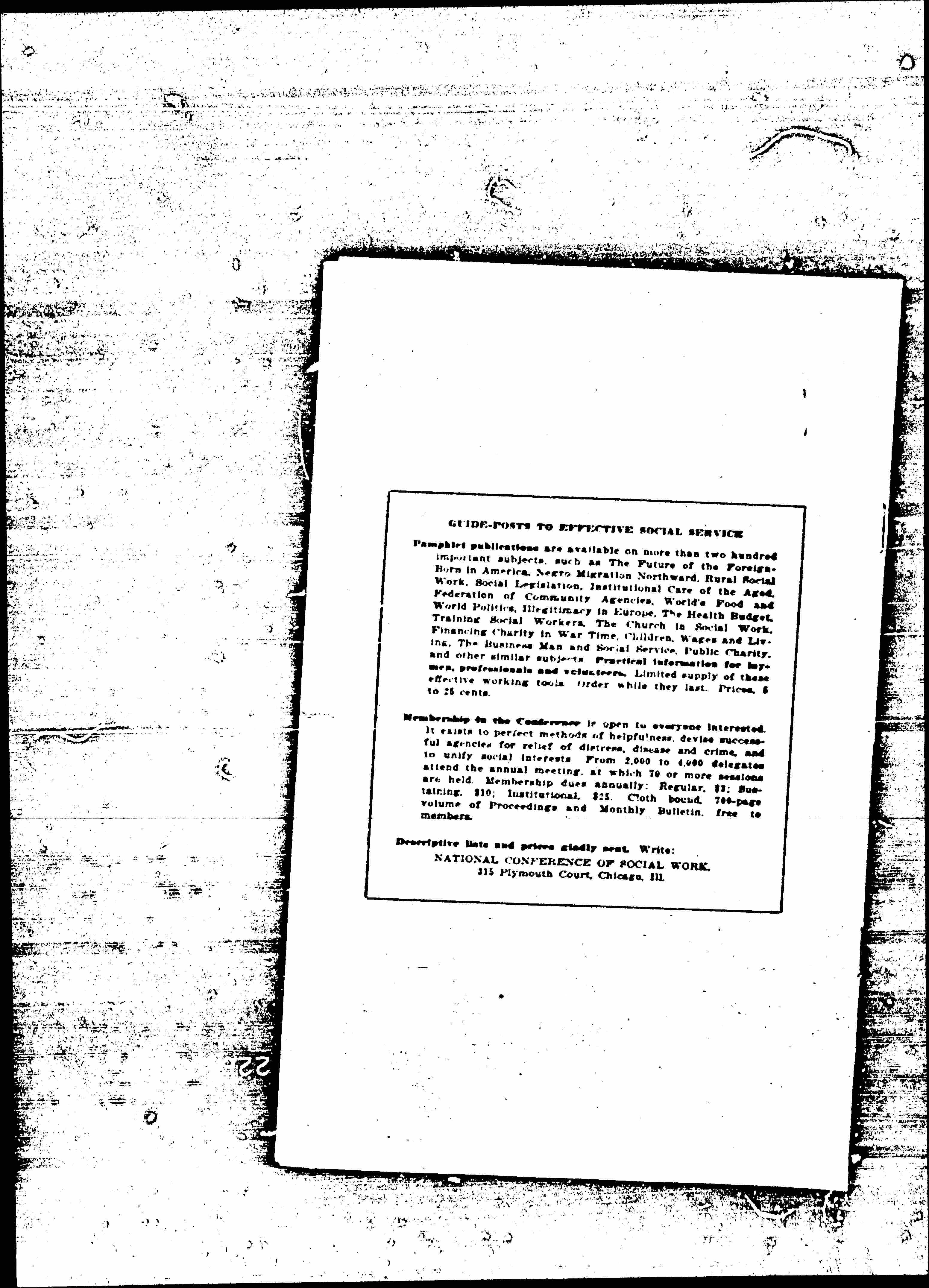 Pamphlet publications are available on more than two hundred important subjects, such as The Future of the Foreign-Born in America. Negro Migration Northward. Rural Social Work. Social Legislation. Institutional Care of the Aged. Federation of Community Agencies. World's Food and World Politics. Illegitimacy in Europe. The Health Budget. Training Social Workers. The Church in Social Work. Financing Charity in War Time. Children, Wages and Living. The Business Man and Social Service. Public Charity and other similar subjects. Practical Information for laymen, professionals and volunteers. Limited supply of these effective working tools. Order while they last. Prices, [8] to [28] cents.