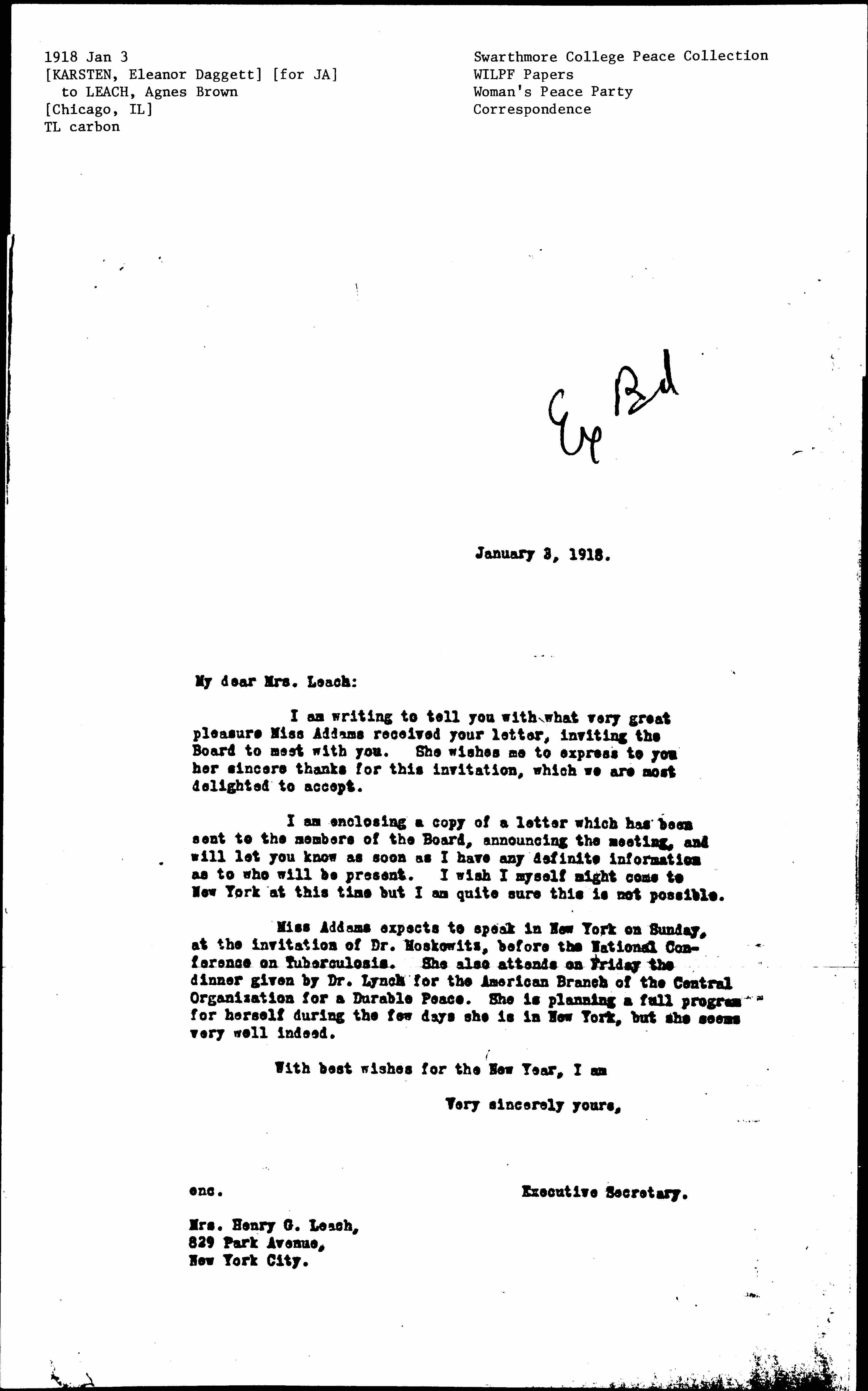I am writing to tell you with what very great pleasure Miss Addams received your letter, inviting the Board to meet with you. She wishes me to express to you her sincere thanks for this invitation, which we are most delighted to accept.