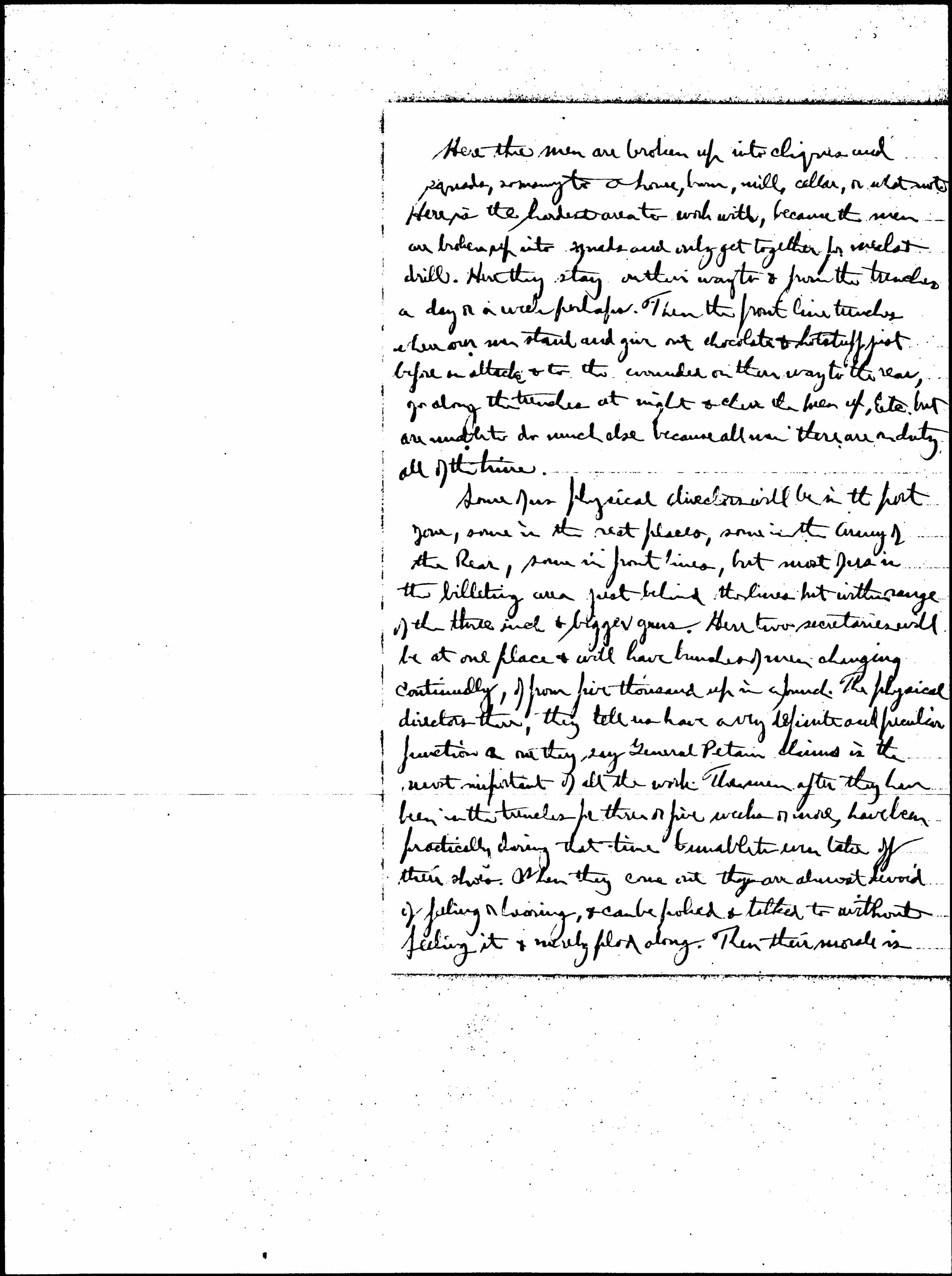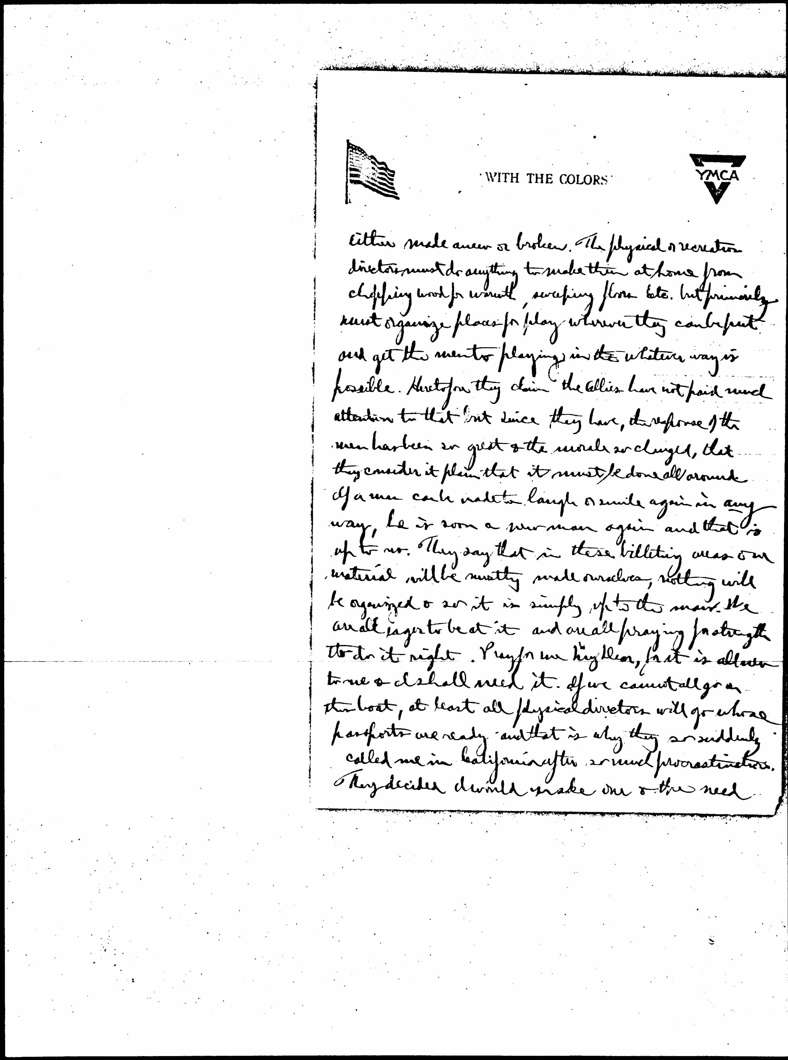 Some of us physical directors will be in the port zone, some in the rest places, some in the Army of the Rear, some in front lines, but most of us in the billeting area just behind the lines but within range of the three inch & bigger guns. Here two secretaries will be at one place & will have bunches of men changing continually, of from five thousand up in [a bunch?]. The physical directors there, they tell us have a very definite and peculiar function or one they say General Petain claims is the most important of all the work. These men after they have been in the trenches for three or five weeks or more, have been practically during that time to unable even take off their shoes. When they come out they are almost devoid of [feeling] or [illegible], & can be [poked] & talked to without feeling it & merely filed along. Then their morale is [page 5] either made anew or broken. The physical or recreation directors must do anything to make them at home from chopping wood for warmth, sweeping floors Etc. but primarily must organize places for play wherever they can be put and get the men to playing in the whatever way is possible. Heretofore they claim the Allies have not paid much attention to that but since they have, the response of the men has been so great & the morale so changed, that they consider it plain that it must be done all around. If a man can be made to laugh or smile again in any way, he is soon a new man again and that is up to us. They say that in these billeting areas our material will be mostly made ourselves, nothing will be organized & so it is simply up to the men. We are all eager to be at it and are all praying for strength to do it right. Pray for me My Dear, for it is all new to me & I shall need it. If we cannot all go on the boat, at least all physical directors will go whose passports are ready and that is why they so suddenly called me in California after so much procrastination. They decided I would make one & the need [page 6] was so great they were willing to take a chance on most of us & here we are.