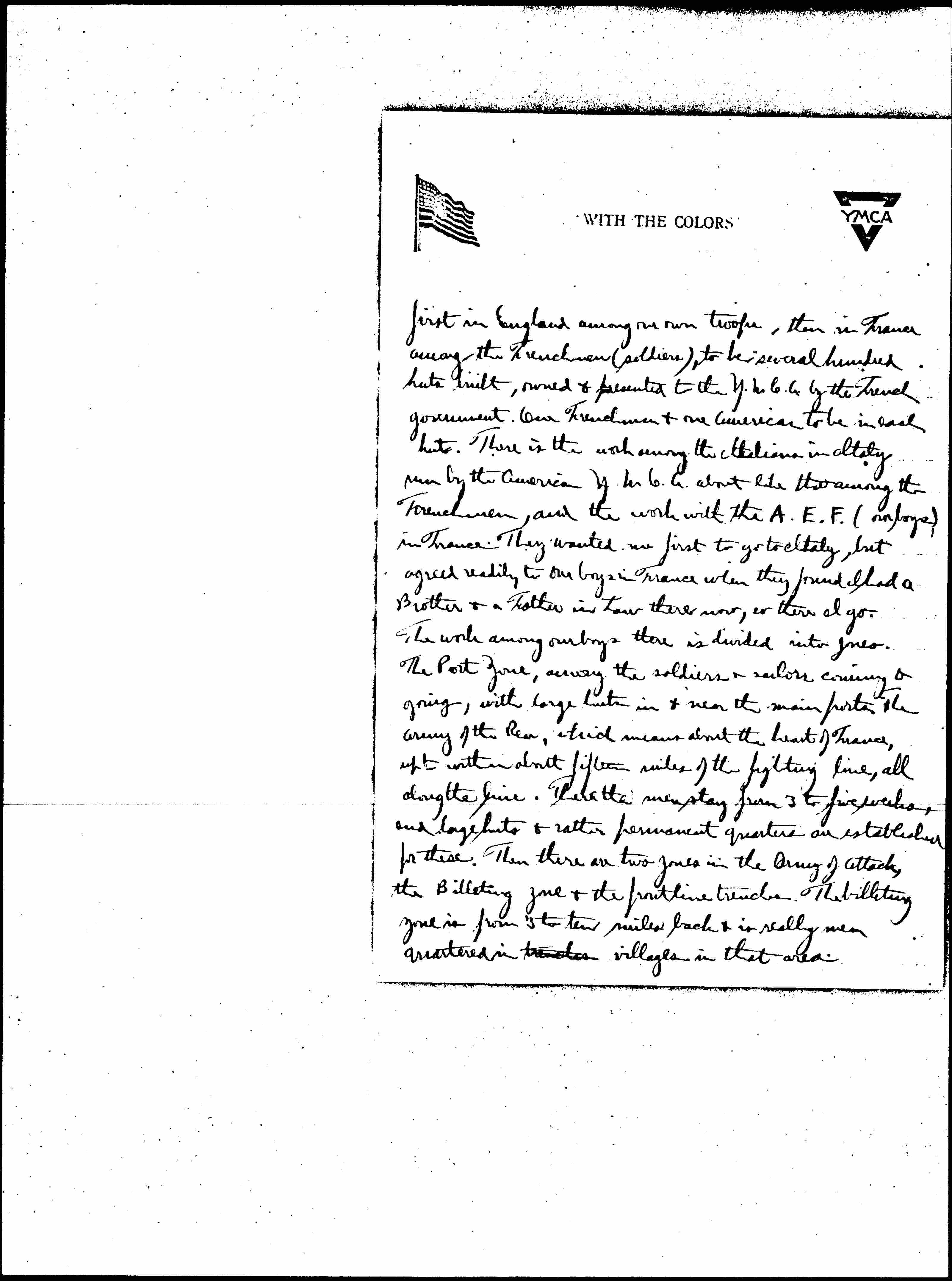 About 300 of us went through the mill in this branch. The most urgent need at present seems to be for physical directors. About 90 of us are going to be that. There are many of the best directors & [coaches] in the country with us, and I am with about half of the [men] who seem to qualify on general character, and college athletics. At first we were very doubtful of our ability to handle the particular job, but are now convinced that initiative and character are the main things required. So that you may know the system, let me describe the zones in France. There is the work [page 3] first in England among our own troops, then in France among the Frenchmen (soldiers), to be several hundred huts built, owned & presented to the Y.M.C.A. by the French government. One Frenchmen & one American to be in each hut. There is the work among the Italians in Italy run by the American Y.M.C.A. about like that among the Frenchmen, and the work with the A.E.F. (our boys), in France. They wanted me first to go to Italy, but agreed readily to our boys in France when they found I had a Brother & a Father in law there now, so there I go. The work among our boys there is divided into zones. The Port Zone, among the soldiers & sailors coming & going, with large [boats?] in & near the main ports. The army of the Rear, which [moves?] about the heart of France, up to within about fifteen miles of the fighting line, all along the line. There the men stay from 3 to five weeks, and large huts & rather permanent quarters are established for these. Then there are two zones in the Army of Attack, the Billeting Zone & the frontline trenches. The billeting zone is from 3 to ten miles back & is really men quartered in trenches villages in that area. [page 4]