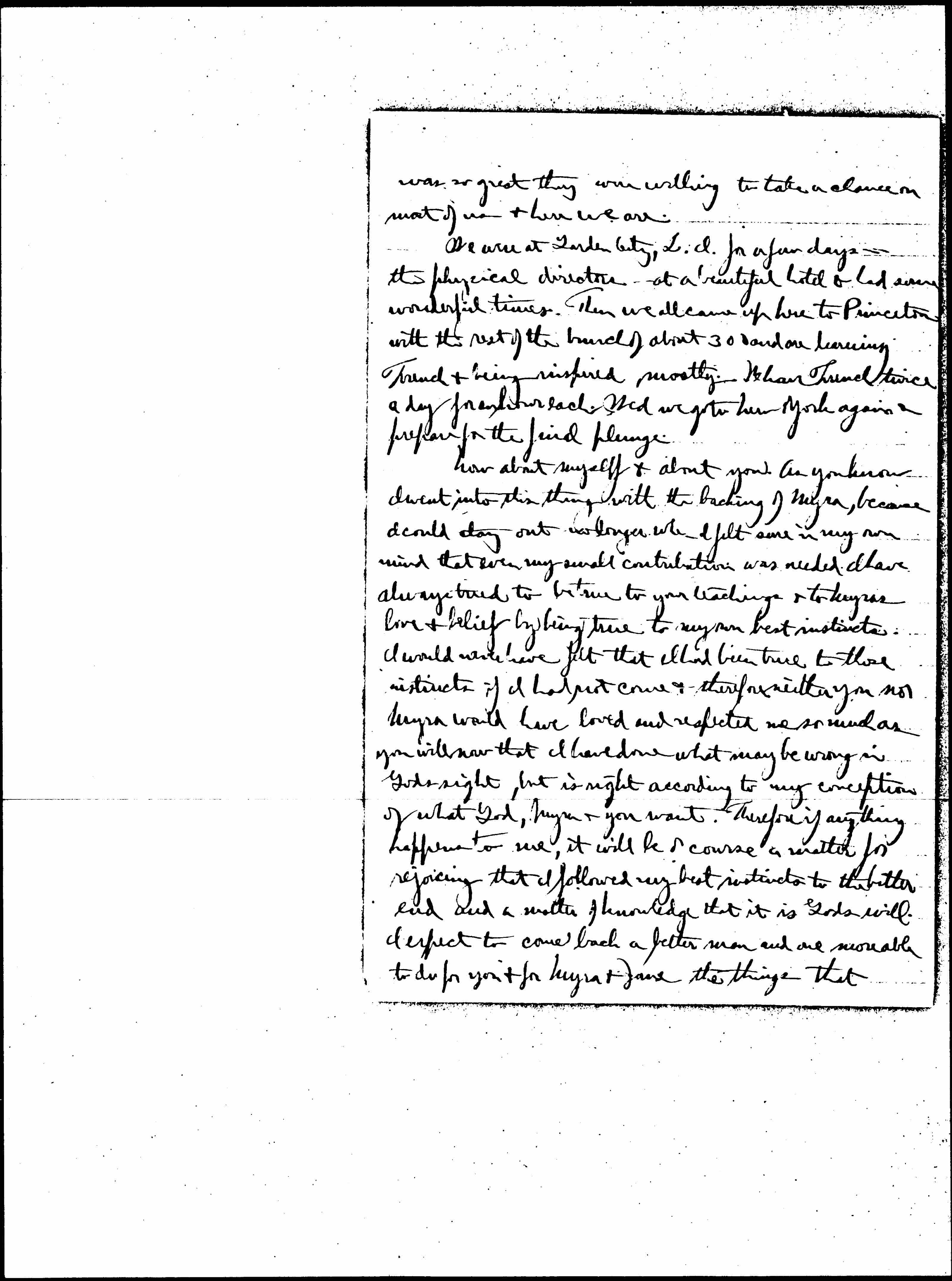 We were at Garden City, L.I. for a few days -- the physical directors -- at a beautiful hotel & had some wonderful times. Then we all came up here to Princeton with the rest of the bunch of about 300 and are learning French & being inspired mostly. [We] have French twice a day for an hour each. Wed we go to New York again & prepare for the final plunge.