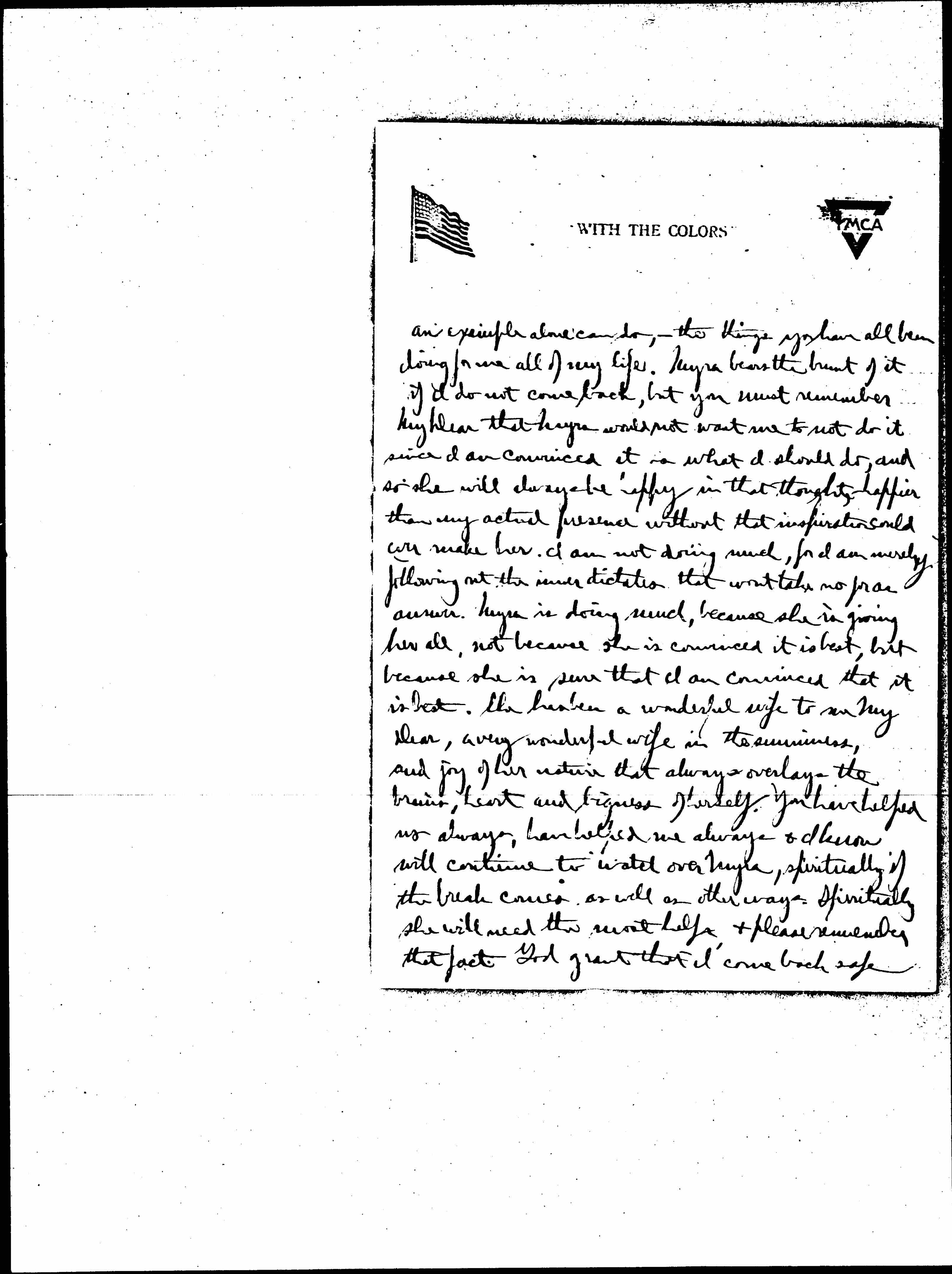 Now about myself & about you. As you know I went into this thing with the backing of Myra, because I could stay out no longer as [illegible] -- I felt sure in my own mind that even my small contribution was needed. I have always tried to be true to your teachings & to Myra's love & belief by being true to my own best instincts. I would never have felt that I had been true to those instincts if I had not come & therefore neither you nor Myra would have loved and respected me so much as you will now that I have done what may be wrong in Gods sight, but is right according to my conceptions of what God, Myra & you want. Therefore if anything happens to me, it will be of course a matter for rejoicing that I followed my best instincts to the bitter end and a matter of knowledge that it is Gods will. I expect to come back a better man and one more able to do for you & Myra & Jane the things that [page 7] an example alone can do, -- the things you have all been doing for me all of my life. Myra bears the brunt of it if I do not come back, but you must remember my plea that Myra would not want me to not do it since I am convinced it is what I should do, and so she will always be happy in that thought, -- happier than any actual presence without that inspiration could ever make her. I am not doing much, for I am merely following out the inner dictates that won't take no for an answer. Myra is doing much, because she is giving her all, not because she is convinced it is best, but because she is sure that I am convinced that it is best. She has been a wonderful wife to me My Dear, a very wonderful wife in the [sunniness?], and joy of her nature that always overlays the brains, heart and bigness of herself. You have helped us always, have helped me always & I know will continue to watch over Myra, spiritually if the break comes, as well as other ways. Spiritually she will need the most help, & please remember that fact. God grant that I come back safe [page 8] for the sake of Myra, of Jane & of you, but most particularly for the sake of Myra.