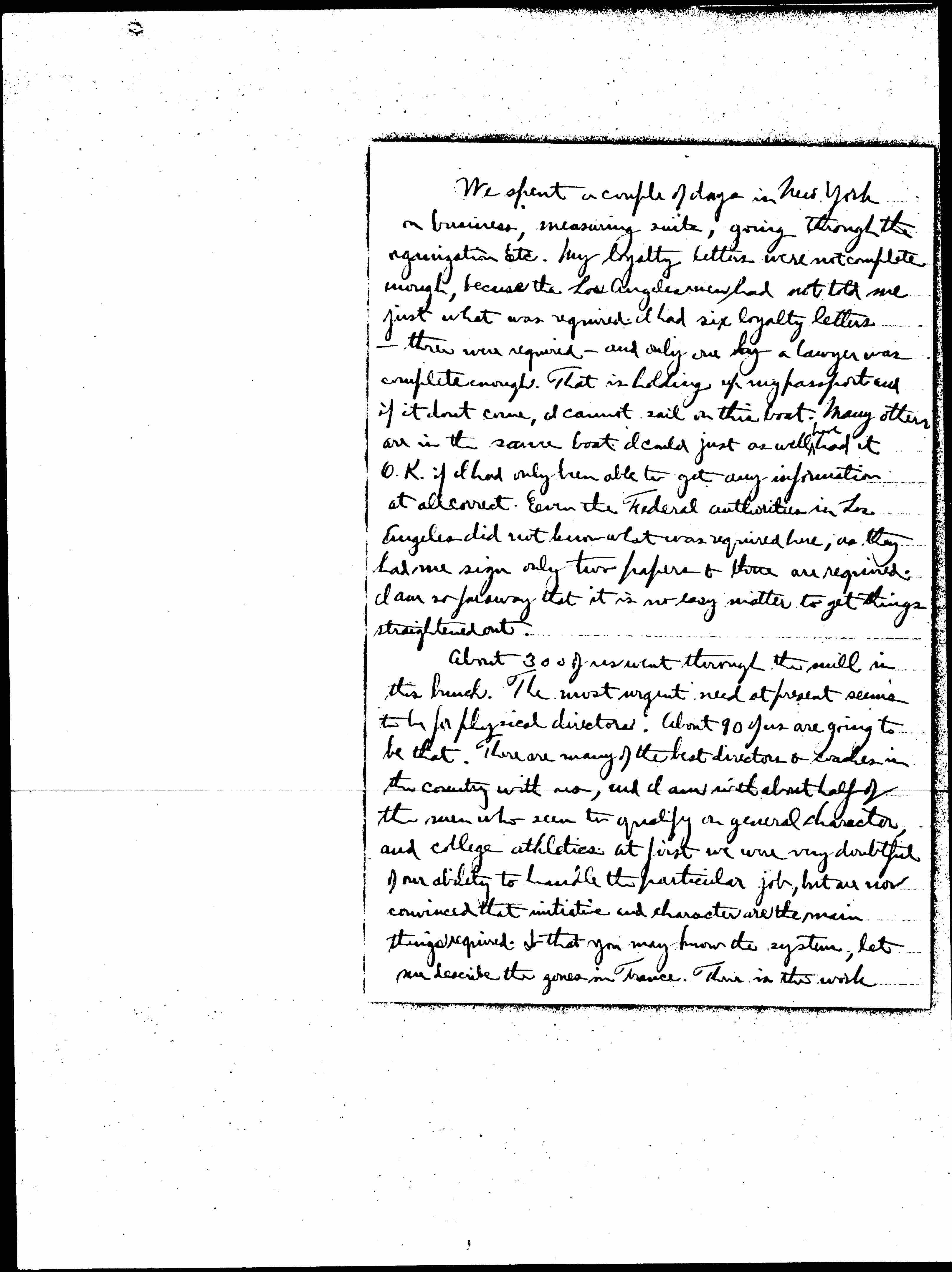 We spent a couple of days in New York on business, measuring suits, going through the organization Etc. My loyalty letters were not complete enough, because the Los Angeles men had not told me just what was required. I had six loyalty letters -- three were required -- and only one by a lawyer was complete enough. That is holding up my passport and if it don't come, I cannot sail on this boat. Many others are in the same boat. I could just as well ↑have↓ had it O.K. if I had only been able to get any information at all correct. Even the Federal authorities in Los Angeles did not know what was required here, as they had me sign only two papers & three are required. I am so far away that it is no easy matter to get things straightened out.