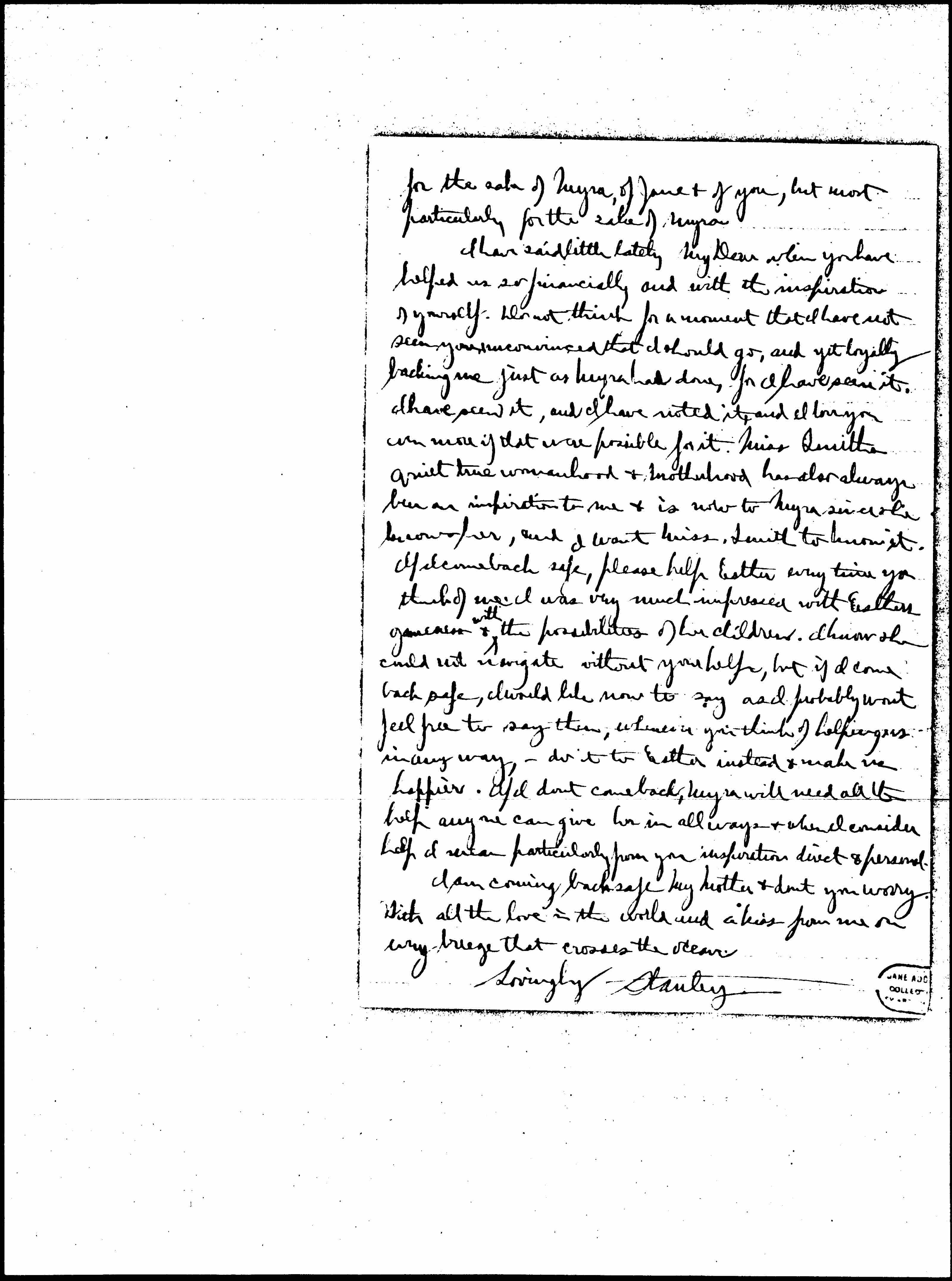 I have said little lately My Dear when you have helped us so financially and with the inspiration of yourself. Do not think for a moment that I have not seen you unconvinced that I should go, and yet loyally backing me just as Myra has done, for I have seen it. I have seen it, and I have noted it, and I love you even more if that were possible for it. Miss Smiths quiet true womanhood & motherhood has also always been an inspiration to me & is now to Myra since she knows her, and I want Miss Smith to know it. If I come back safe, please help Esther every time you think of me. I was very much impressed with Esthers [illegible] & ↑with↓ the possibilities of her children. I know she could not navigate without your help, but if I come back safe, I would like now to say as I probably won't feel free to say then, whenever you think of helping us in any way, -- do it to Esther instead & make us happier. If I don't come back, Myra will need all the help anyone can give her in all ways & when I consider help I mean particularly from your inspiration direct & personal.