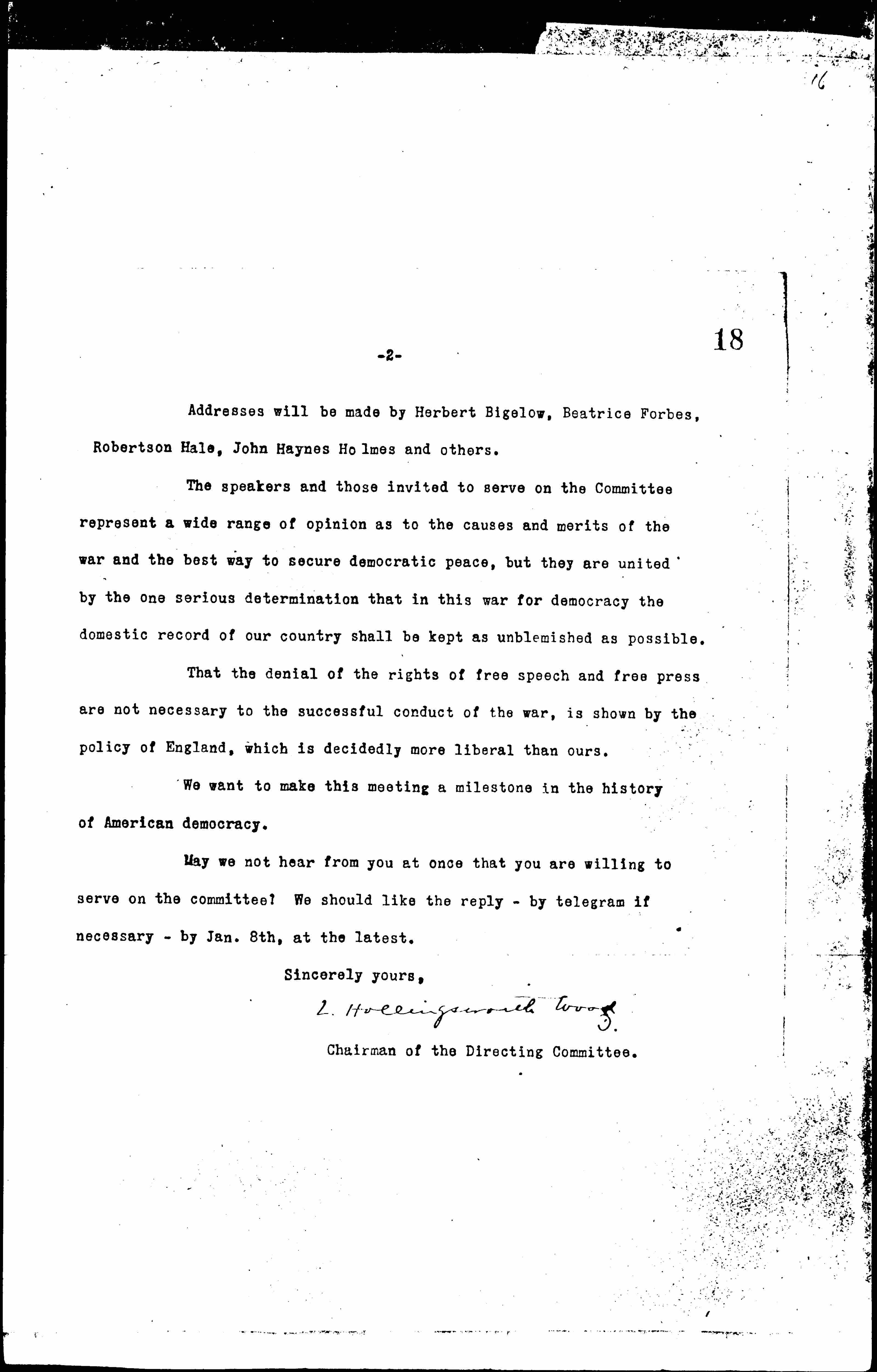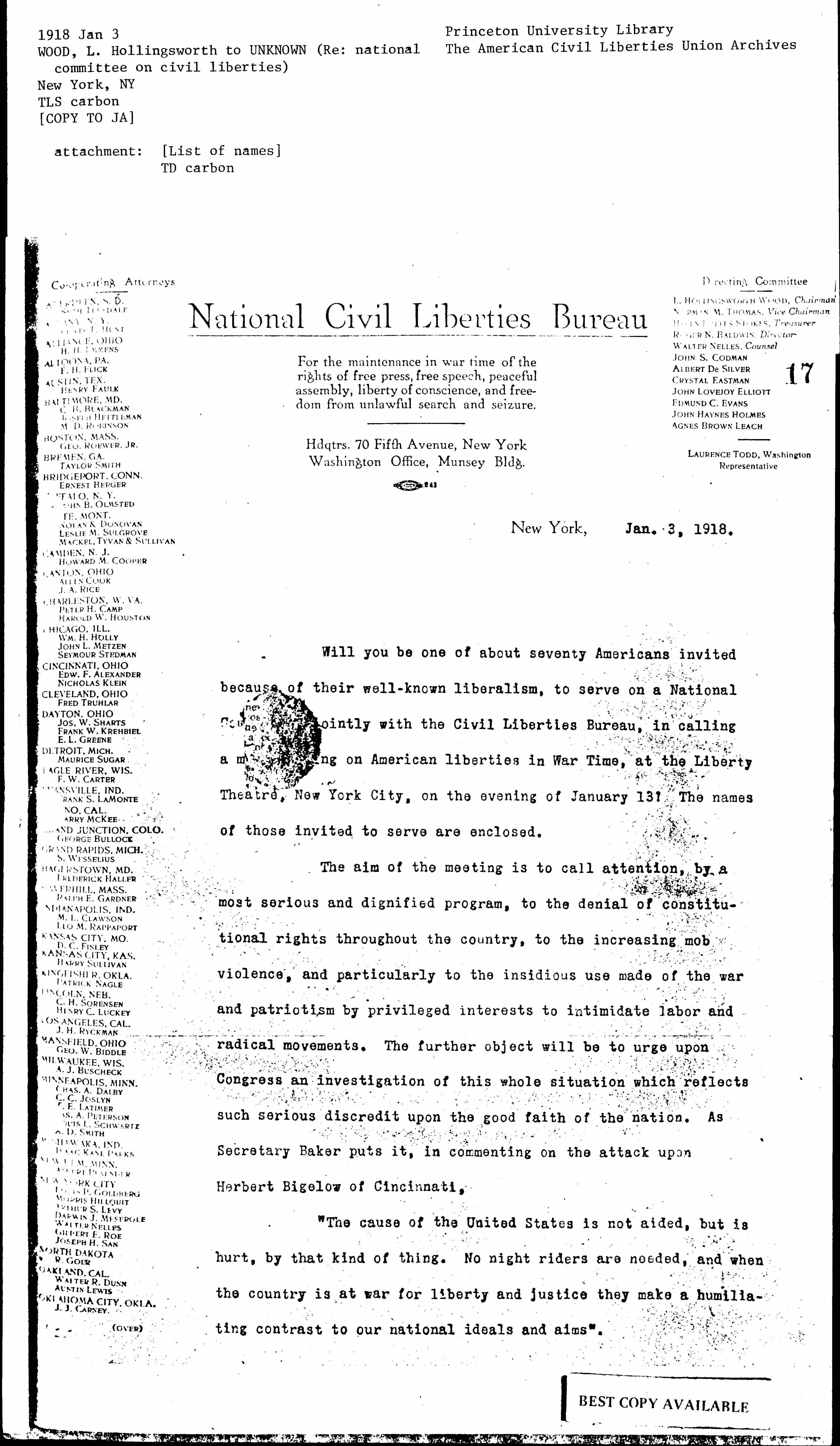 Will you be one of about seventy Americans invited because of their well-known liberalism, to serve on a National [Committee jointly] with the Civil Liberties Bureau, in calling a [meeting] on American liberties in War Time, at the Liberty Theatre, New York City, on the evening of January 13? The names of those invited to serve are enclosed.